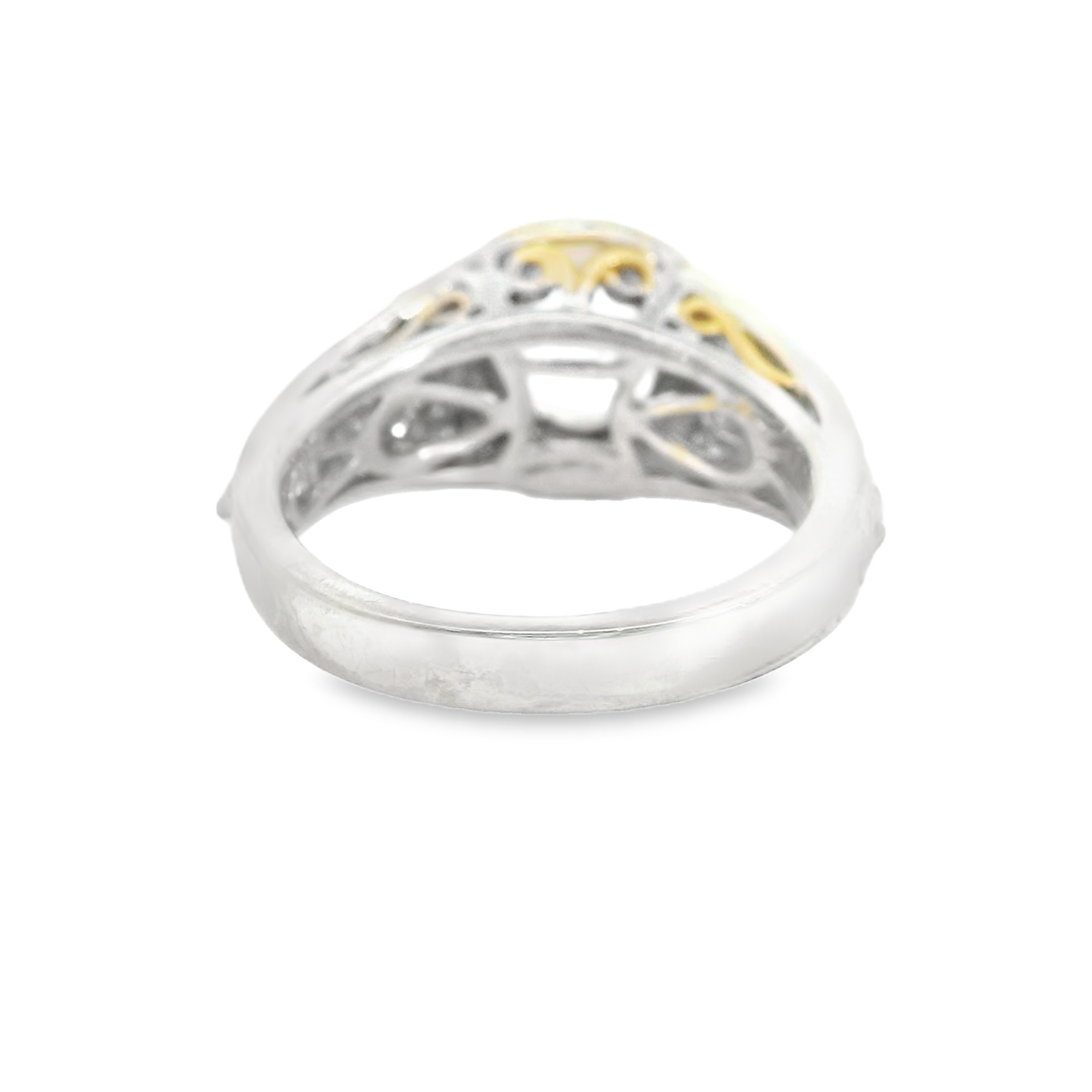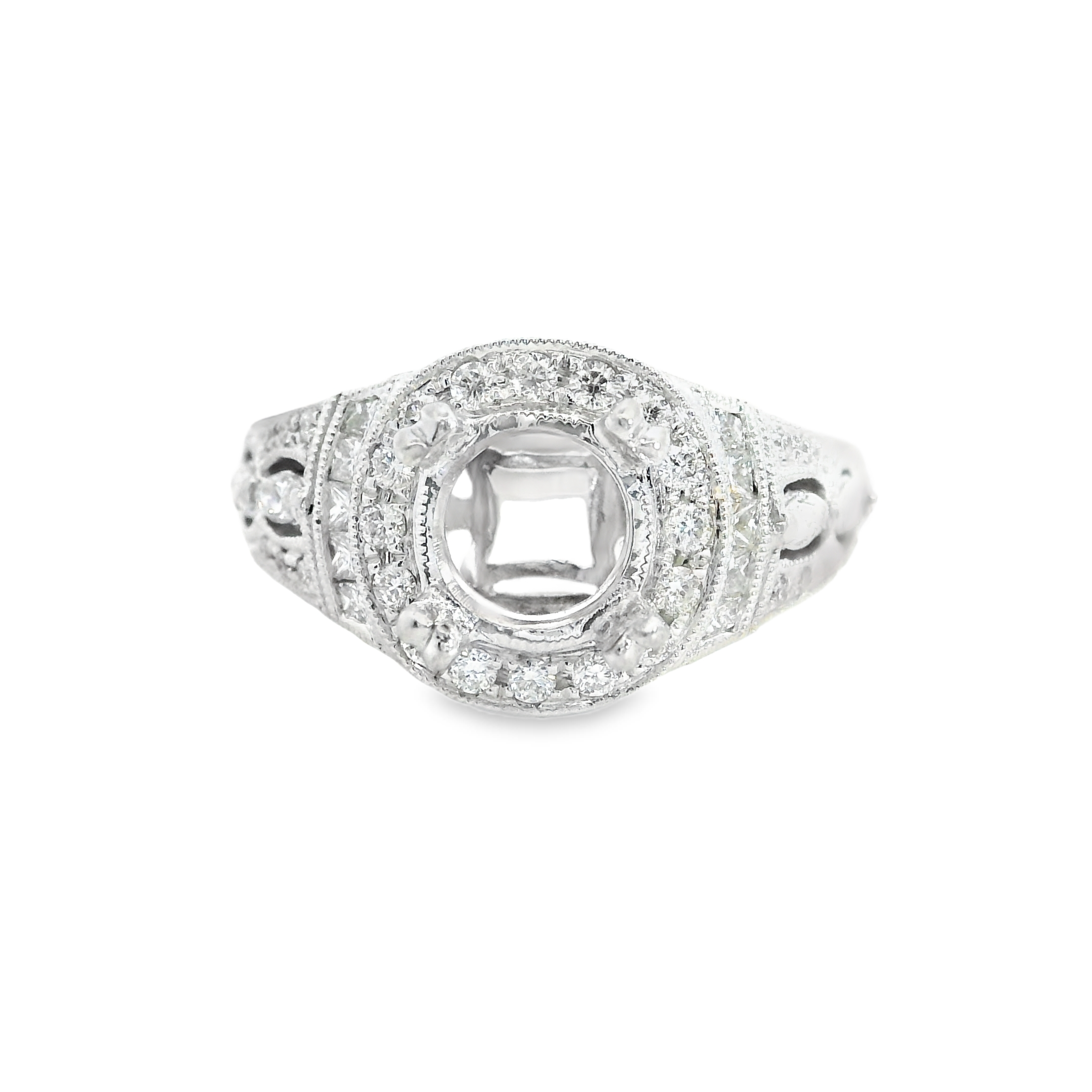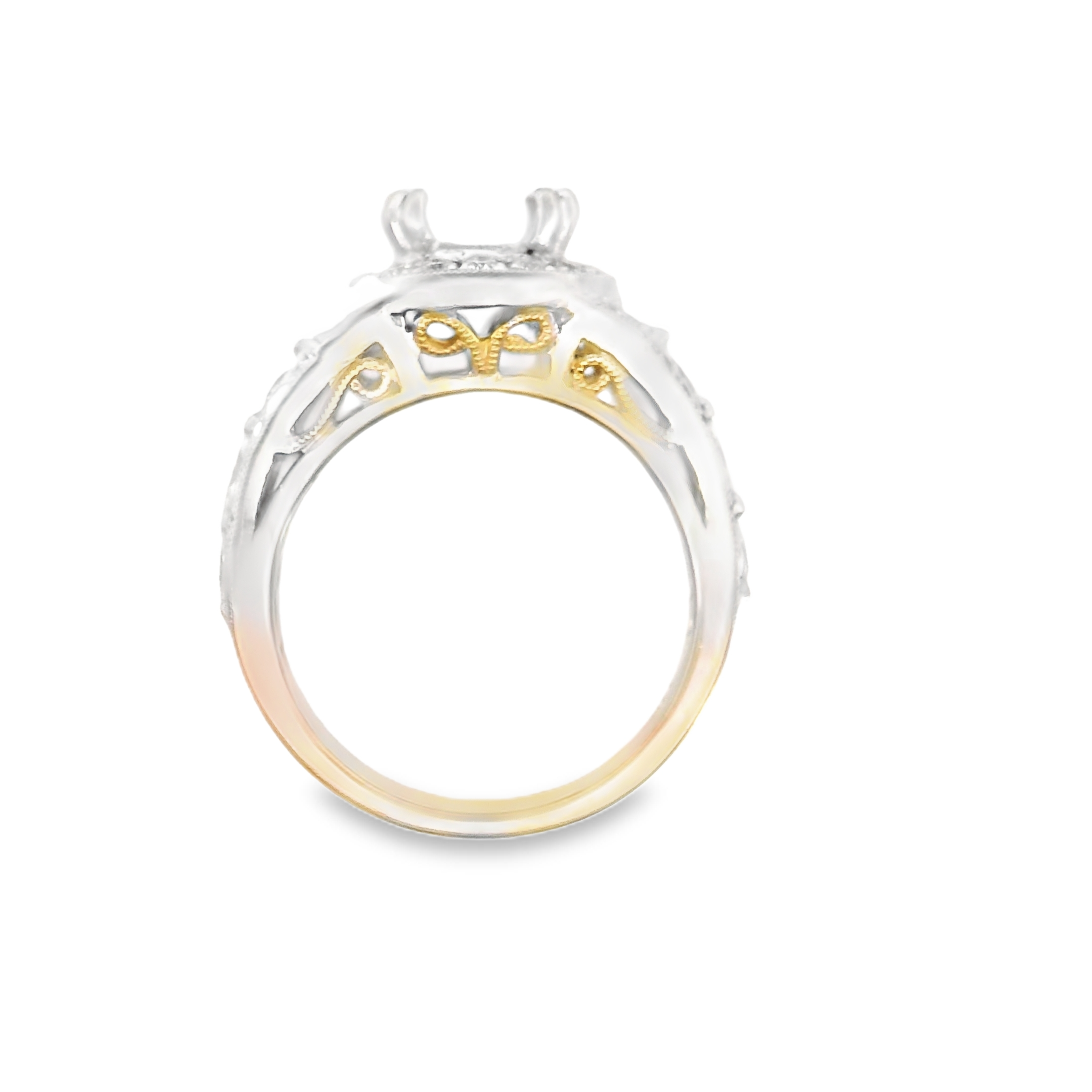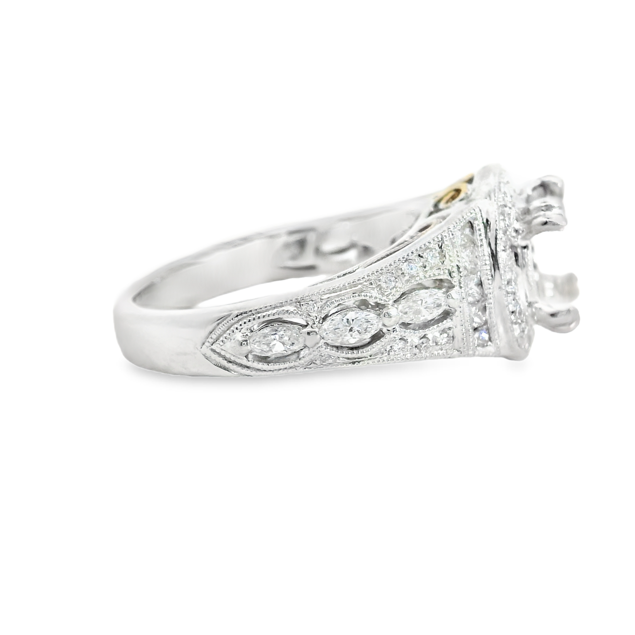 BEAUTIFUL 14K TWO TONE DIAMOND HALO SEMI MOUNT RING 0.68 CT TW. WIDE TAPERED BAND SET WITH MARQUIS AND ROUND DIAMONDS AND MILIGRAIN EDGE.