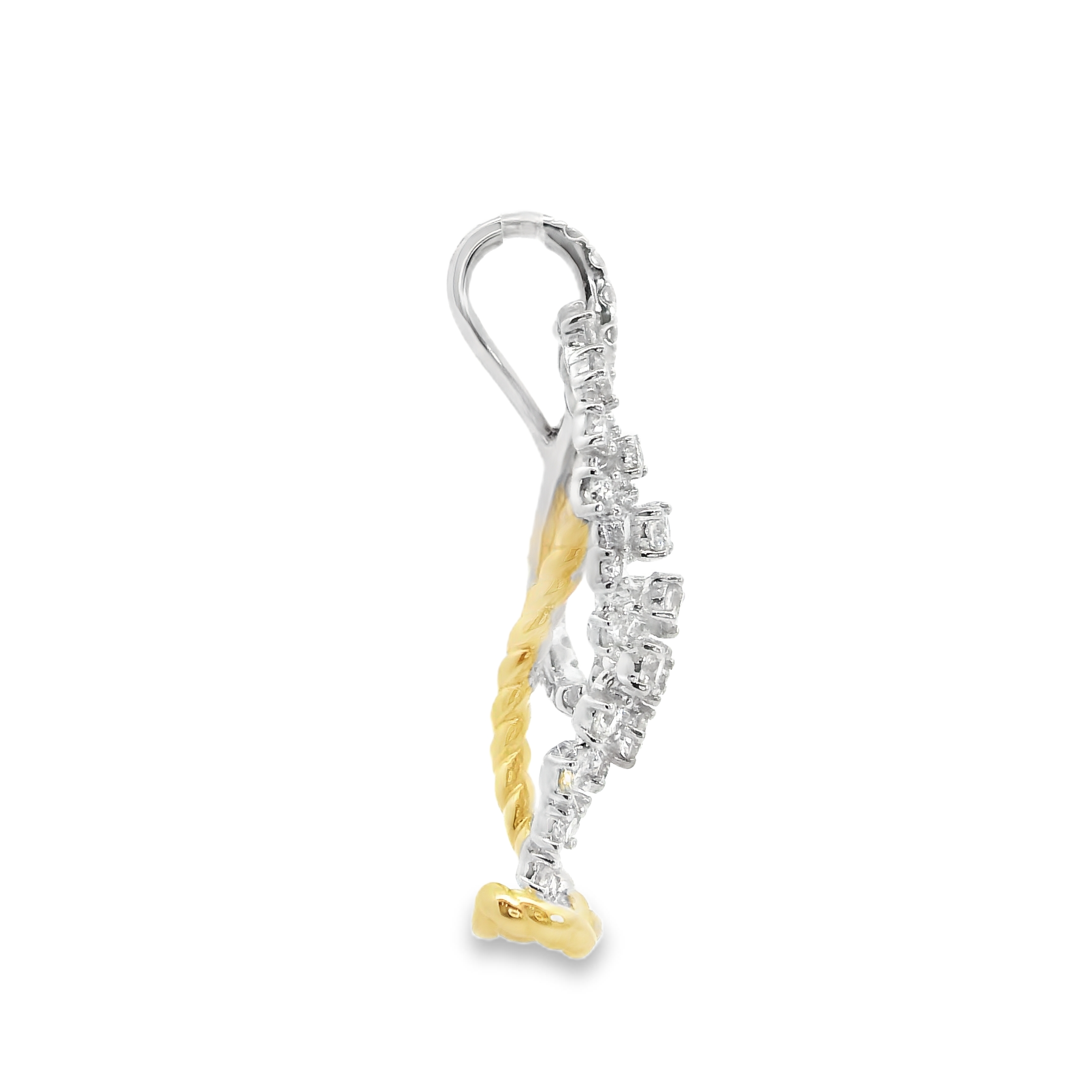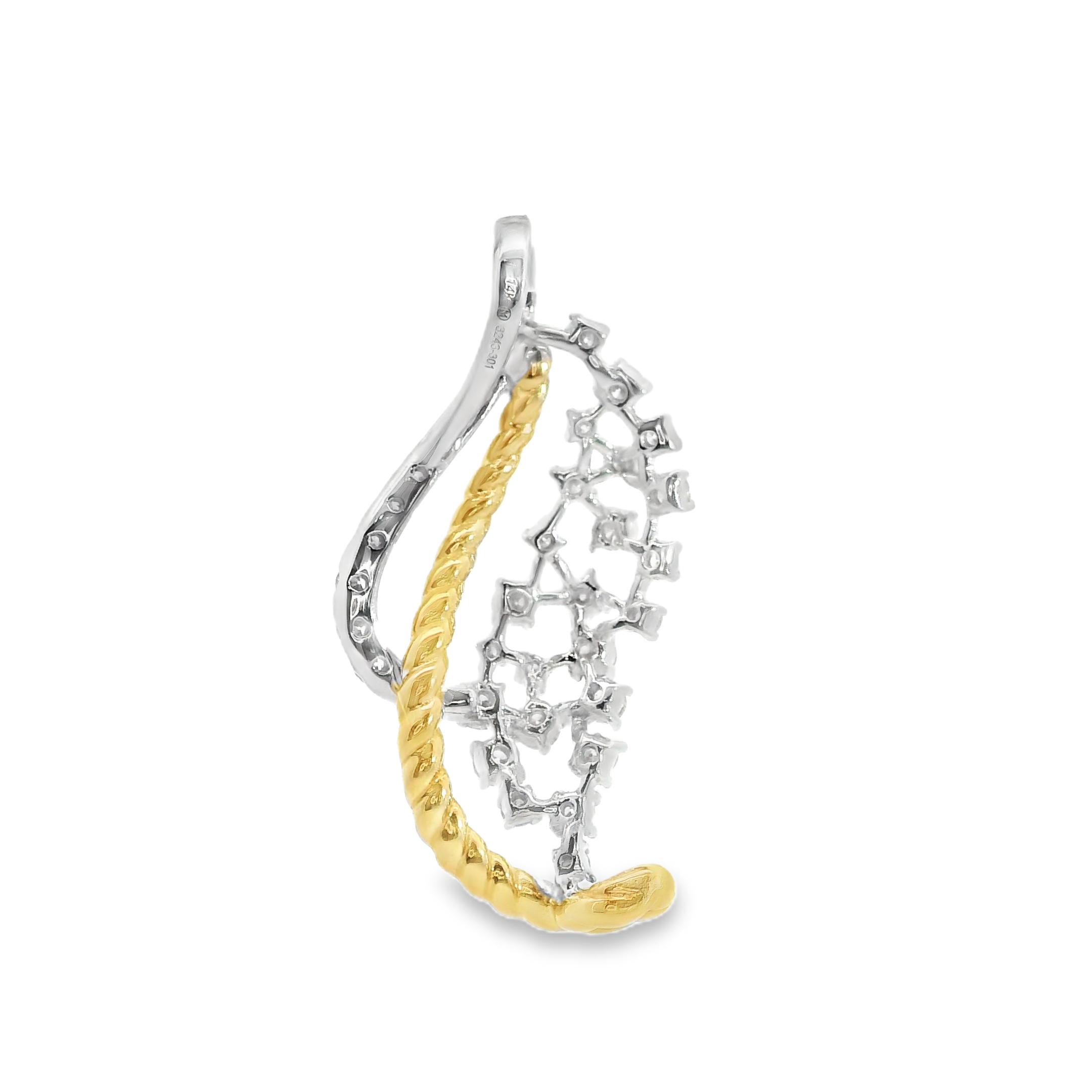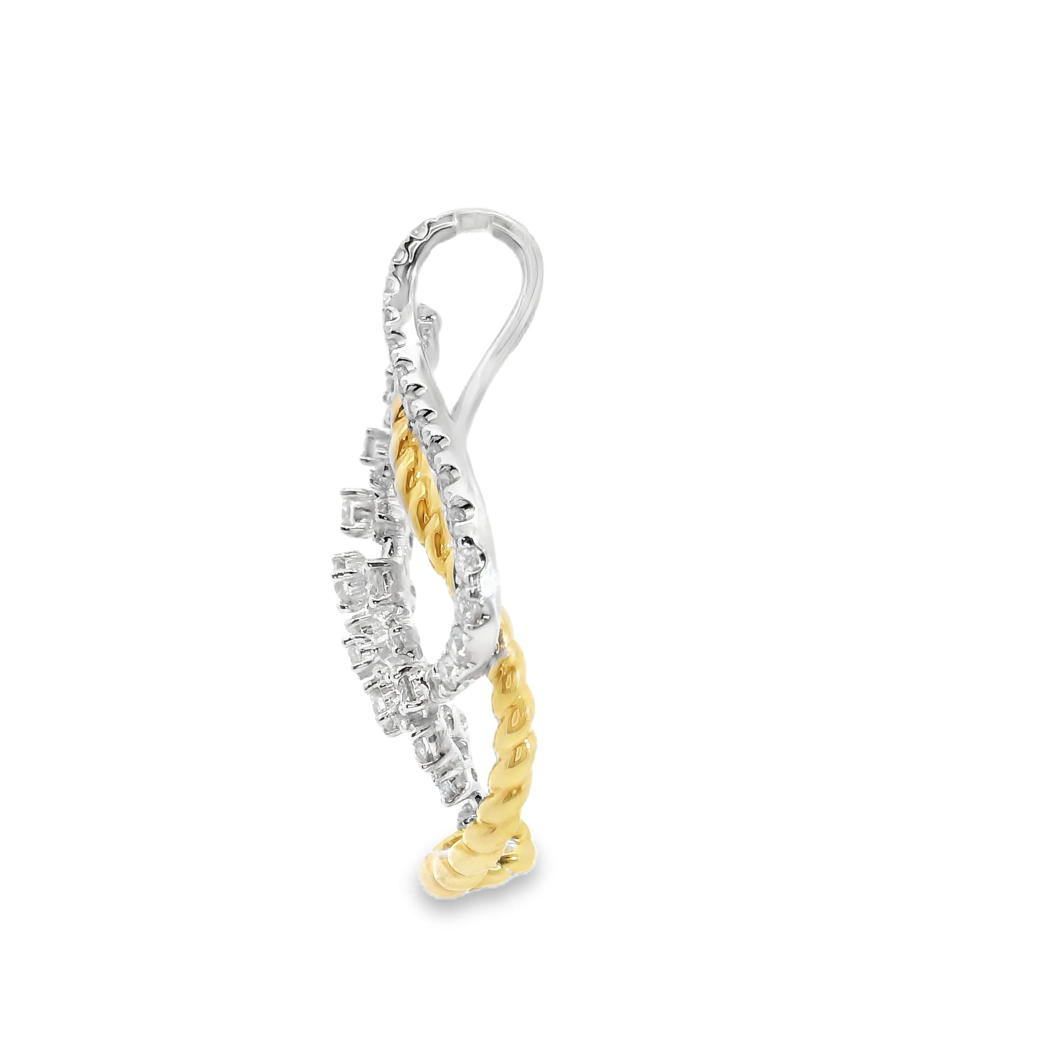 This pendant is a 14k two tone freeform style pendant. Diamonds are set throughout the curved design with a gold twist rope style bar in the center. 39 diamonds are set throughout the piee which is approx 1.25" long and the total 0.75 CT TW.