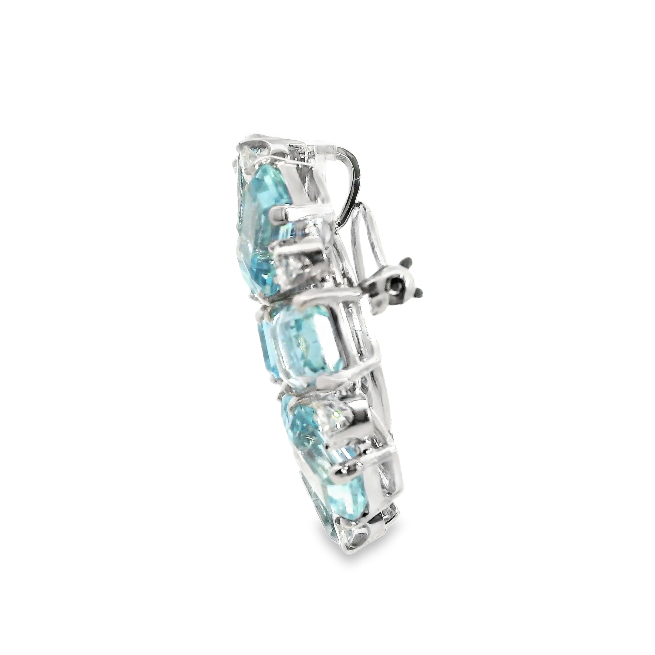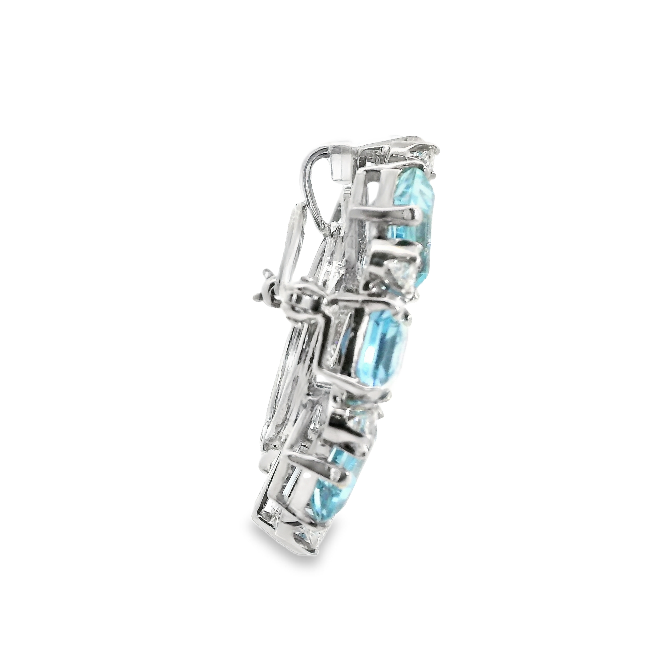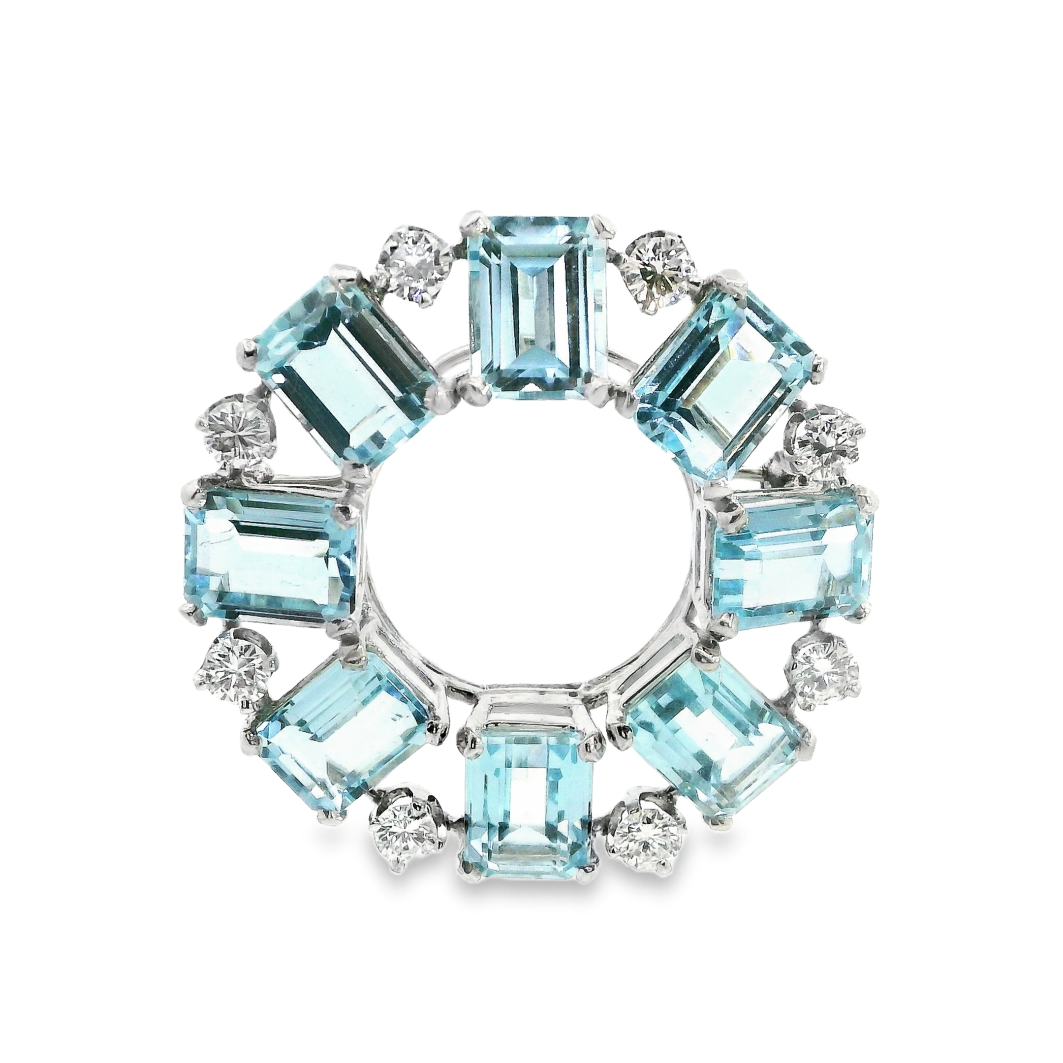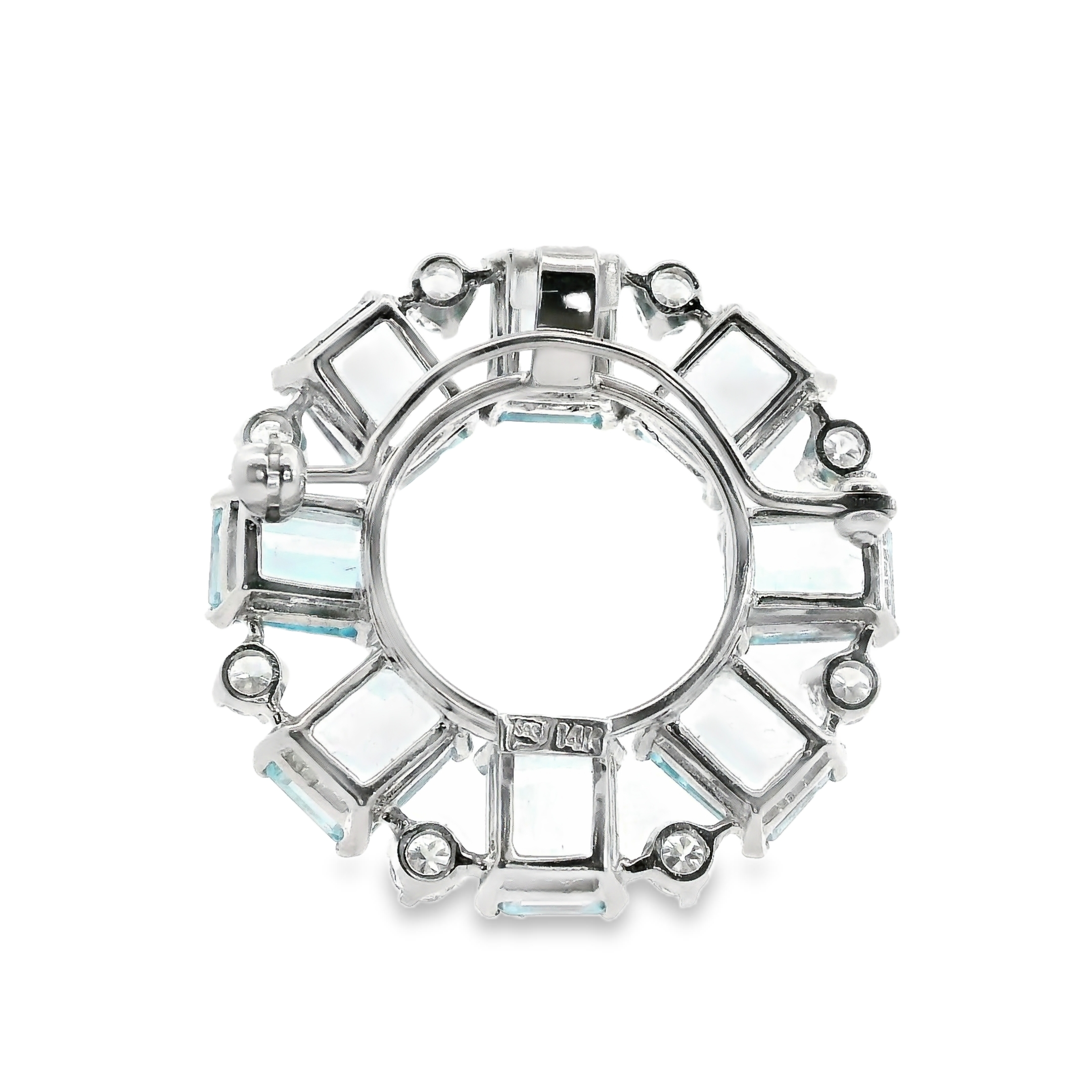 This estate pin is 14k white gold with 8 8x6mm aquamarines prong set in a circle shape and a 0.10 ct diamond prong set in between each one. The pin is convertible to be worn as a pendant or a pin. Aquamarines total approx 11.0 CT TW and diamonds total 0.80 CT TW