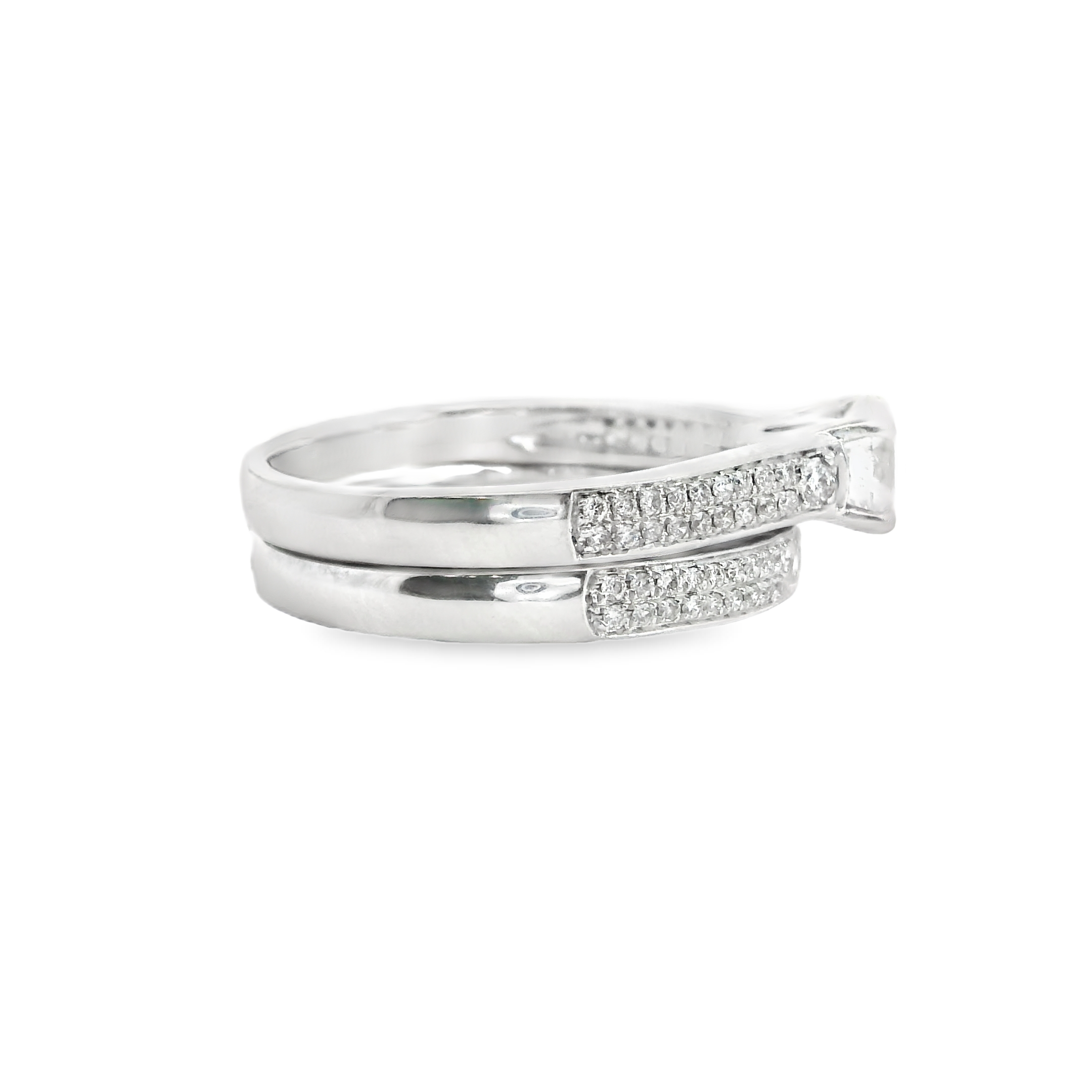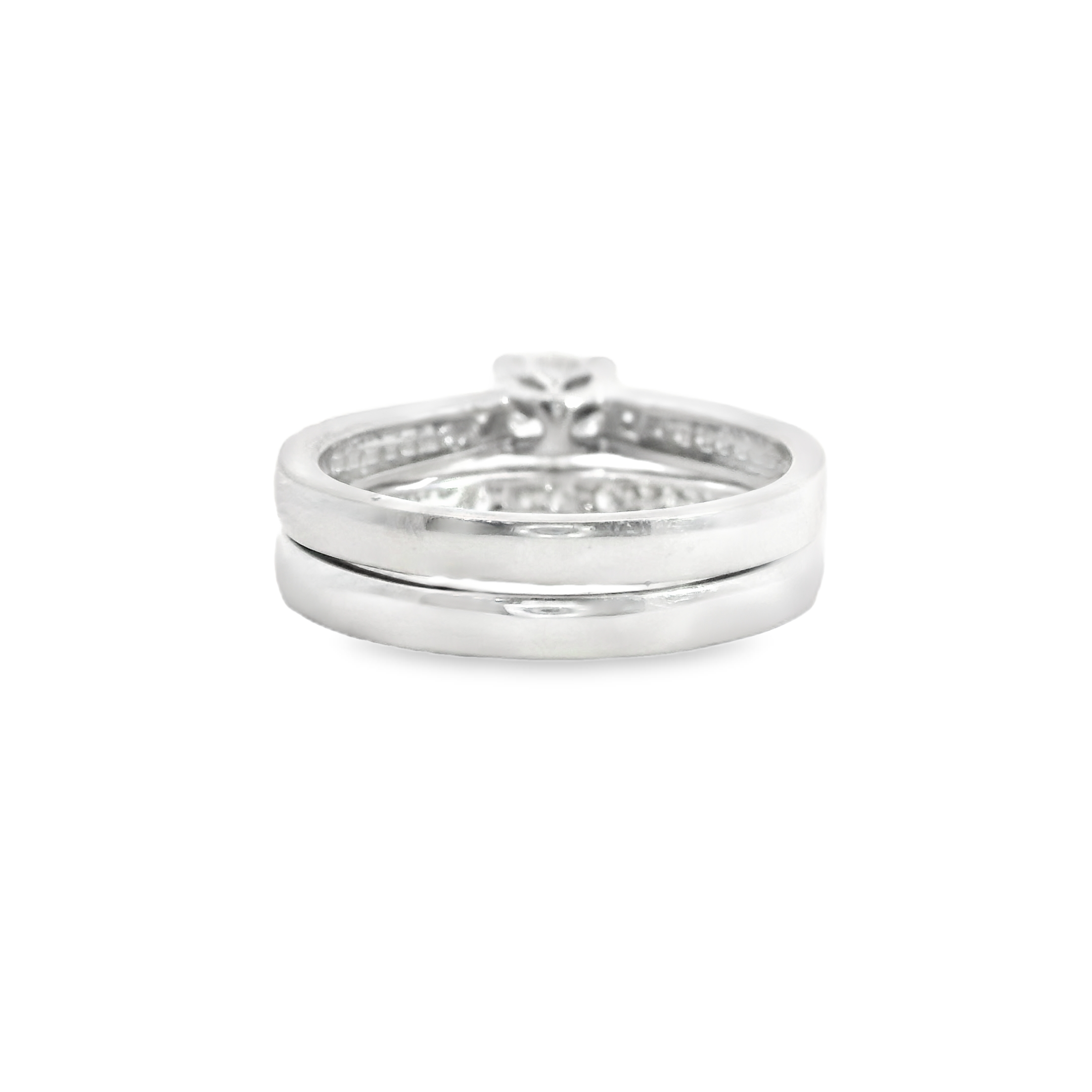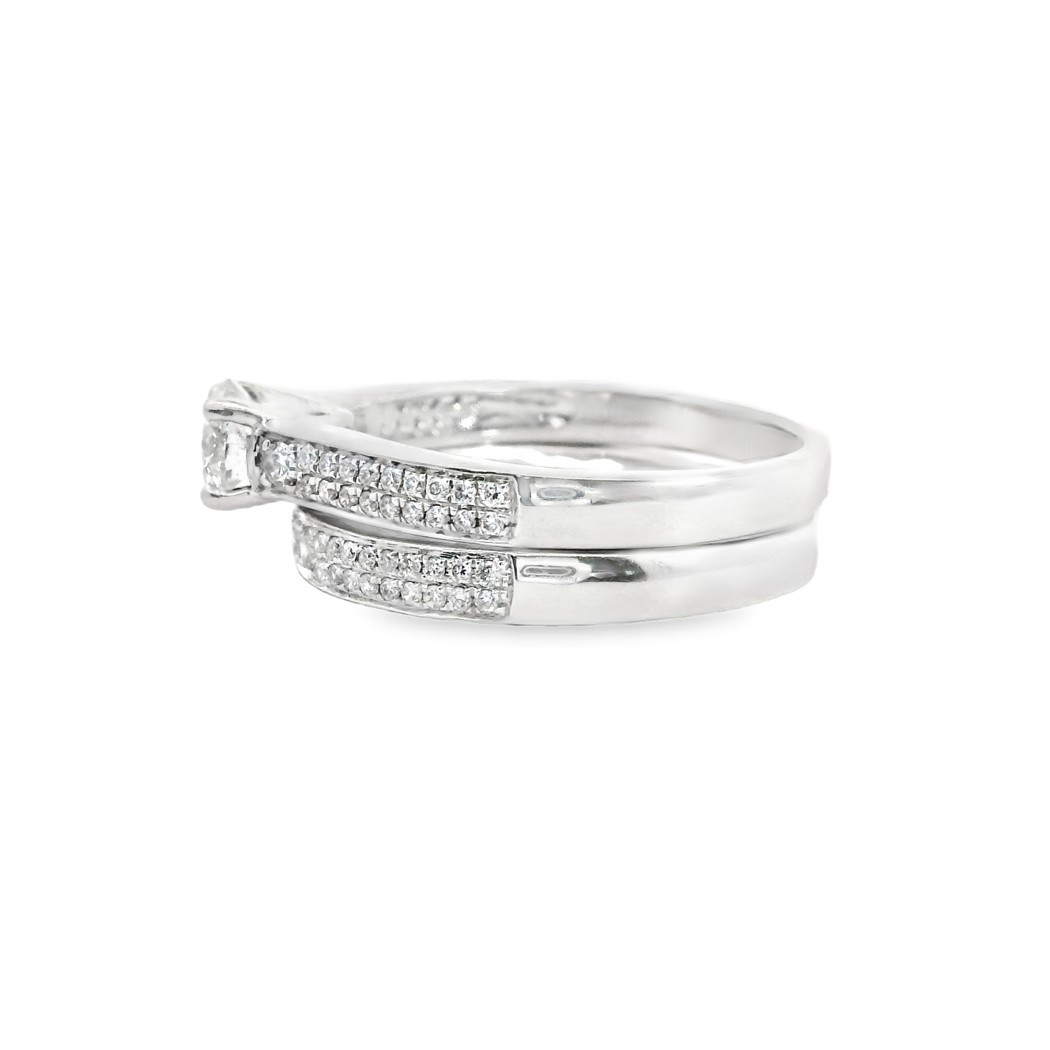 14K WHITE GOLD DIAMOND ENGAGEMENT RING MOUNTING AND WEDDING BAND SET. THE RINGS EACH CONTAIN 2 ROWS OF PRONG SET DIAMONDS. ALL DIAMONDS TOTAL 0.36 CT TW