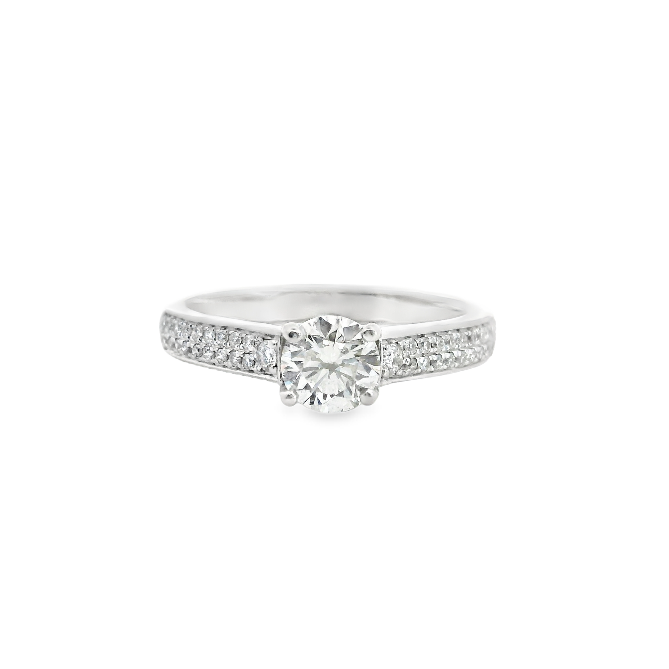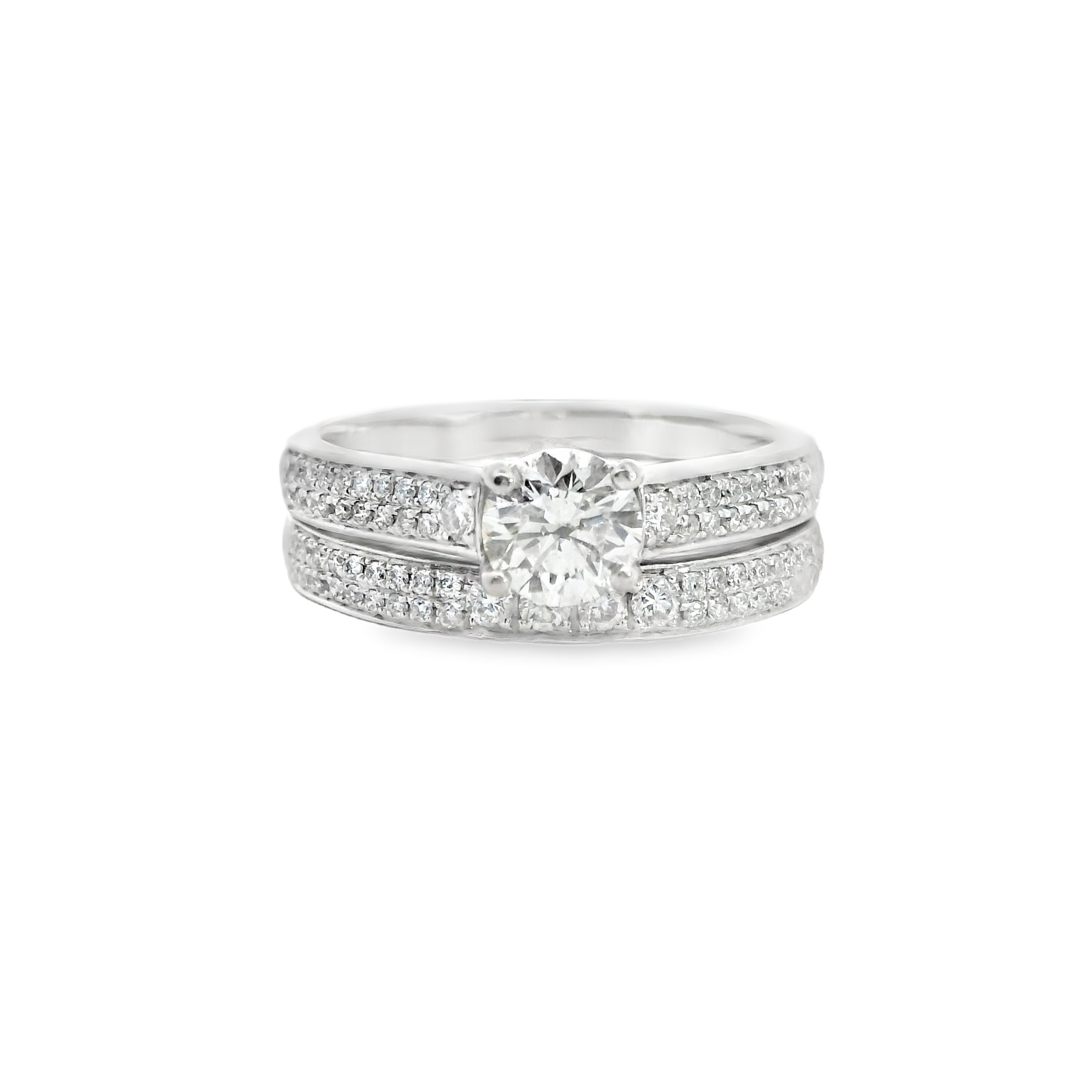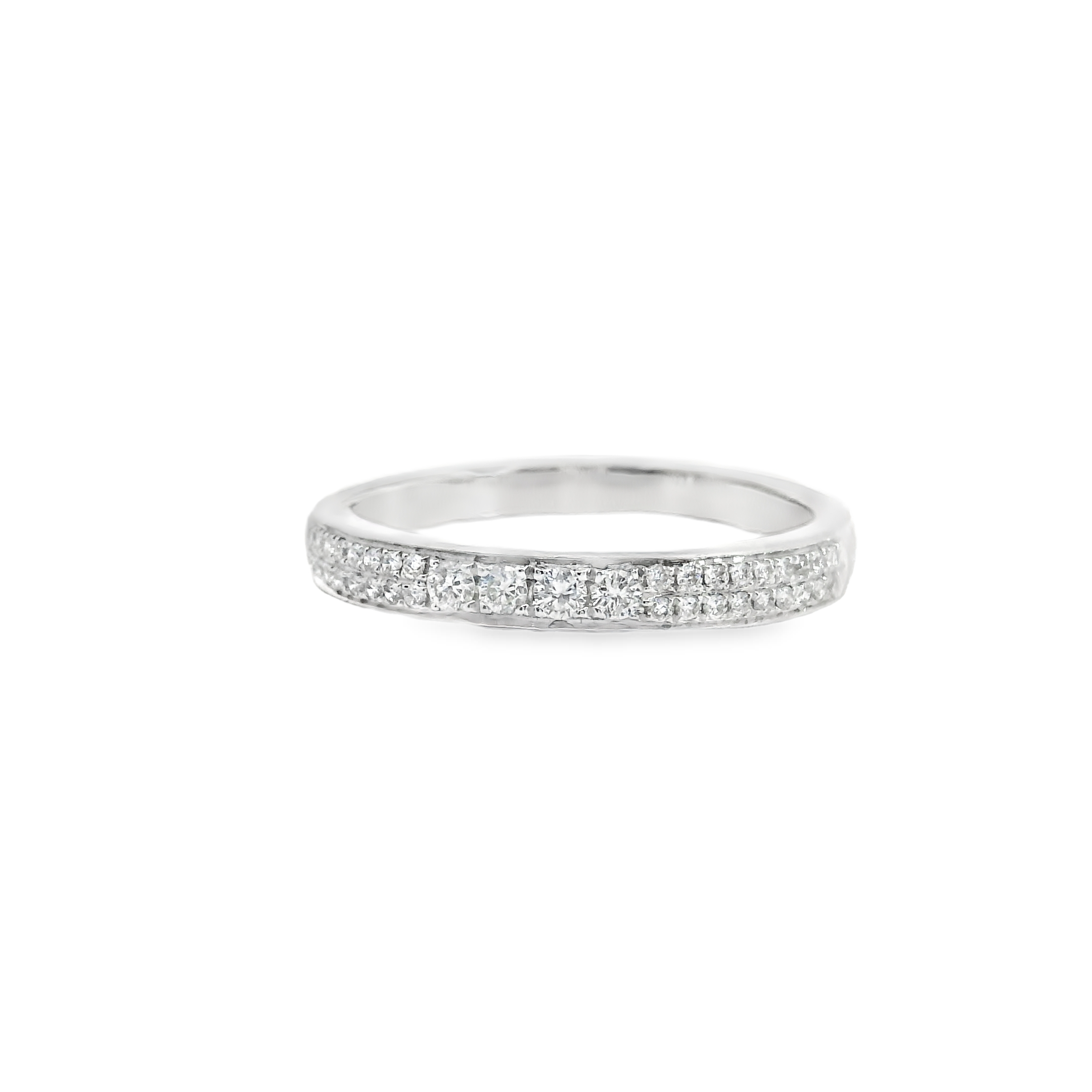 14K WHITE GOLD DIAMOND ENGAGEMENT RING MOUNTING AND WEDDING BAND SET. THE RINGS EACH CONTAIN 2 ROWS OF PRONG SET DIAMONDS. ALL DIAMONDS TOTAL 0.36 CT TW