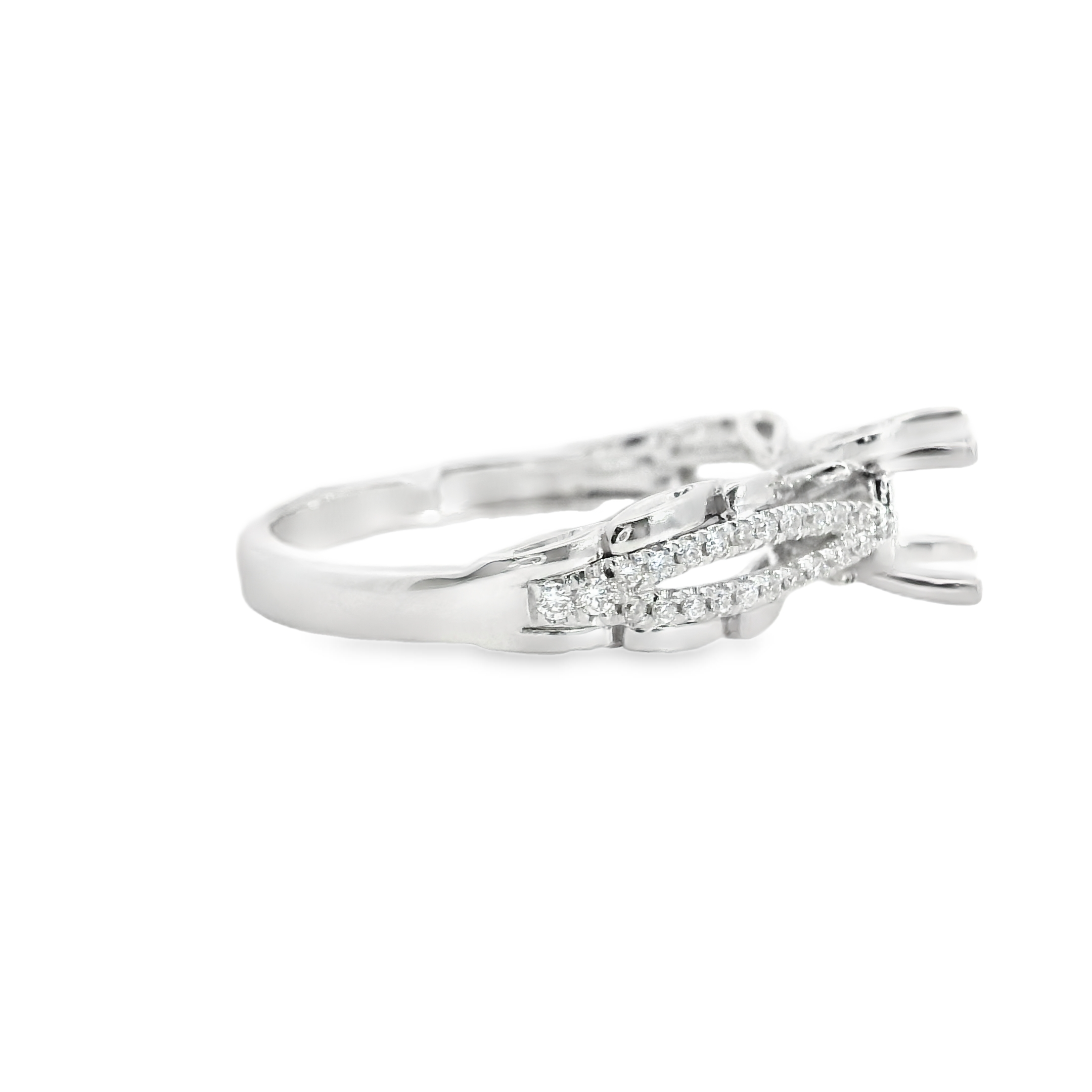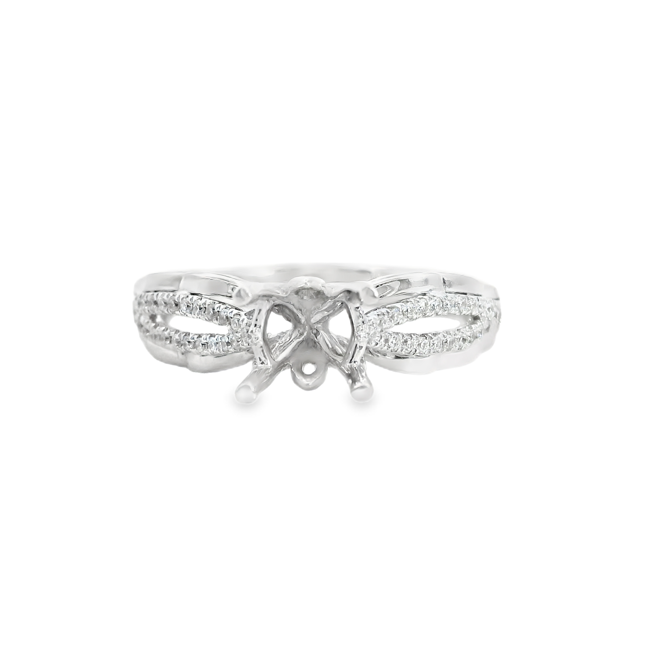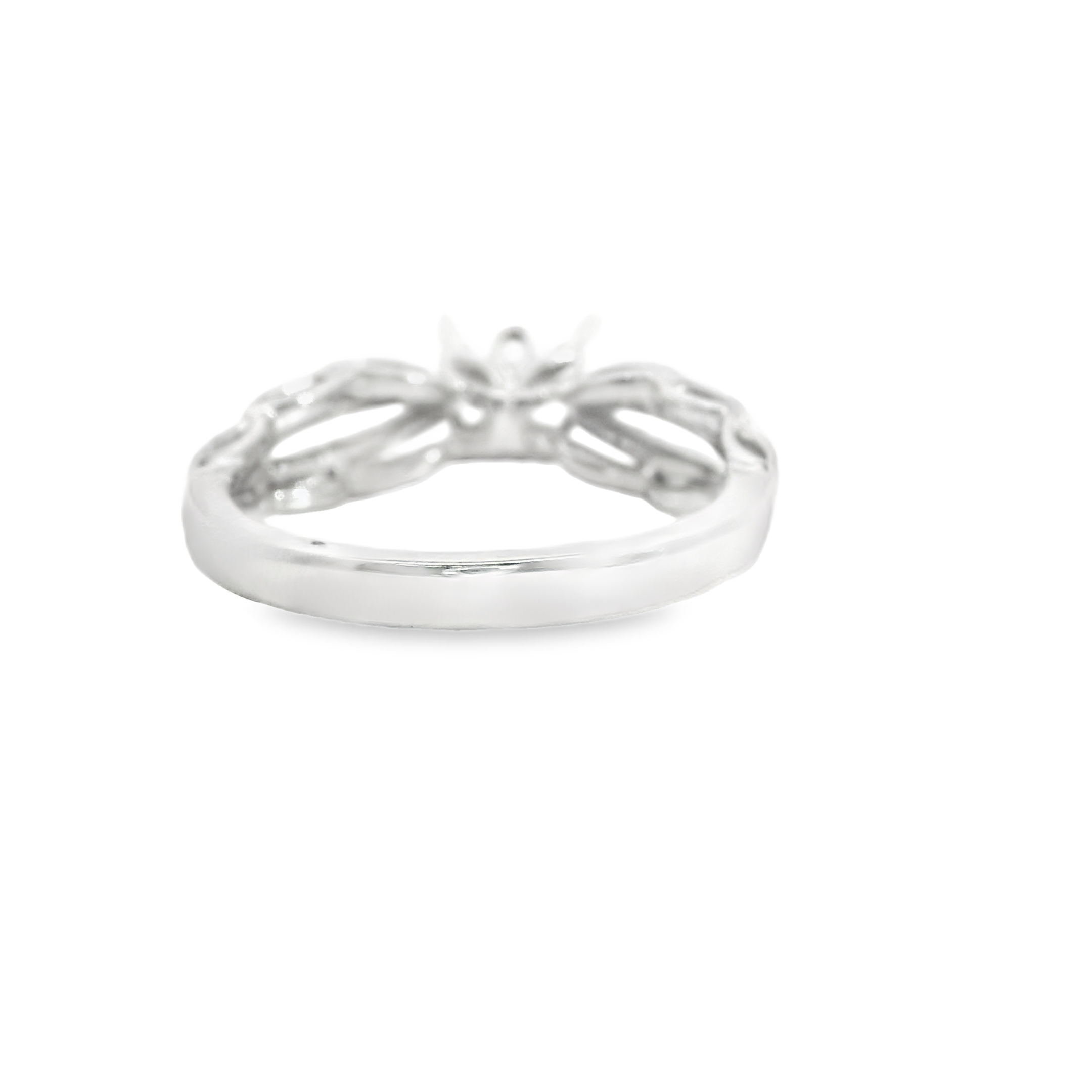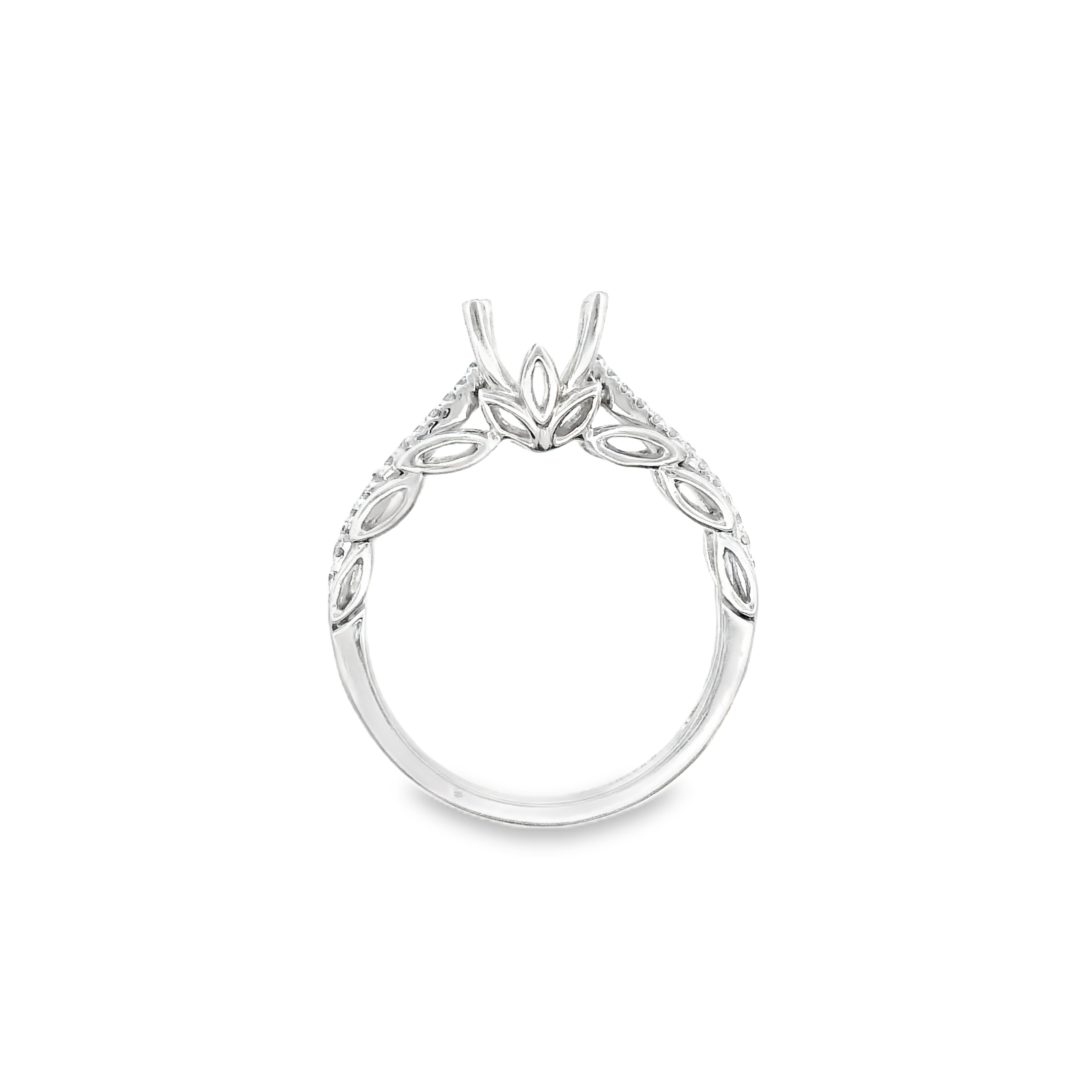 14K WHITE GOLD DIAMOND ENGAGEMENT SEMI MOUNT RING SETTING 0.15 CT TW. OPEN SHANK WITH ROUND PRONG SET DIAMONDS.