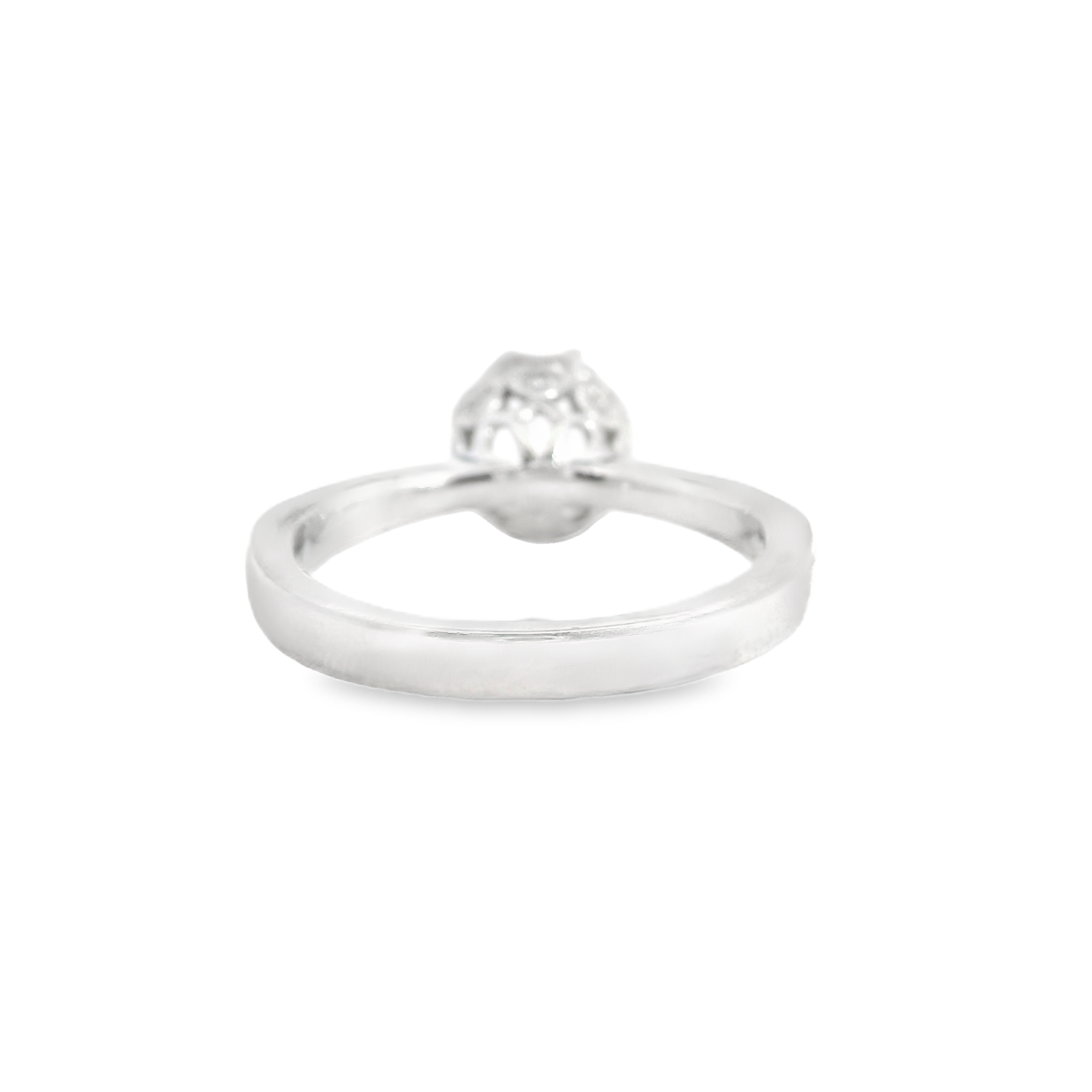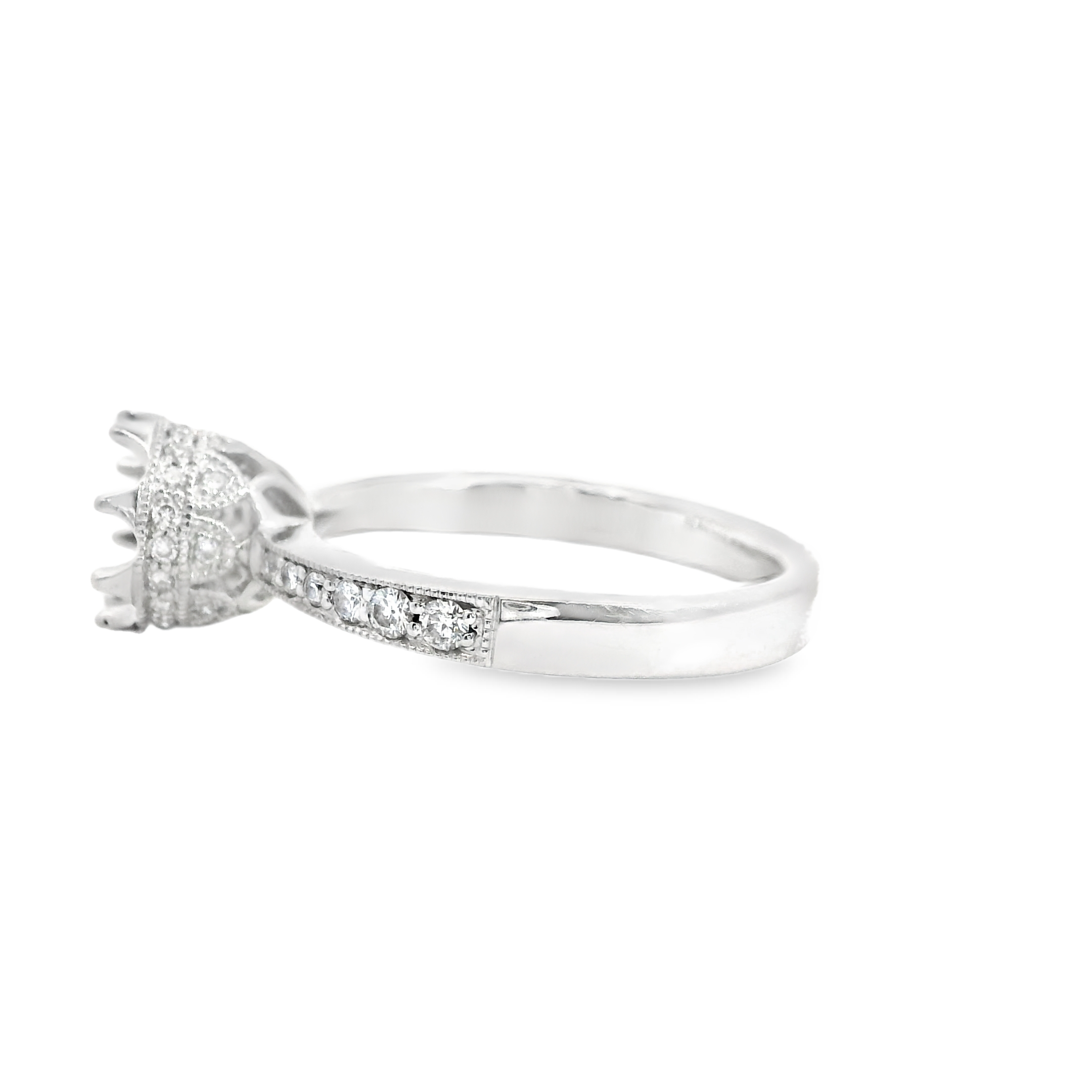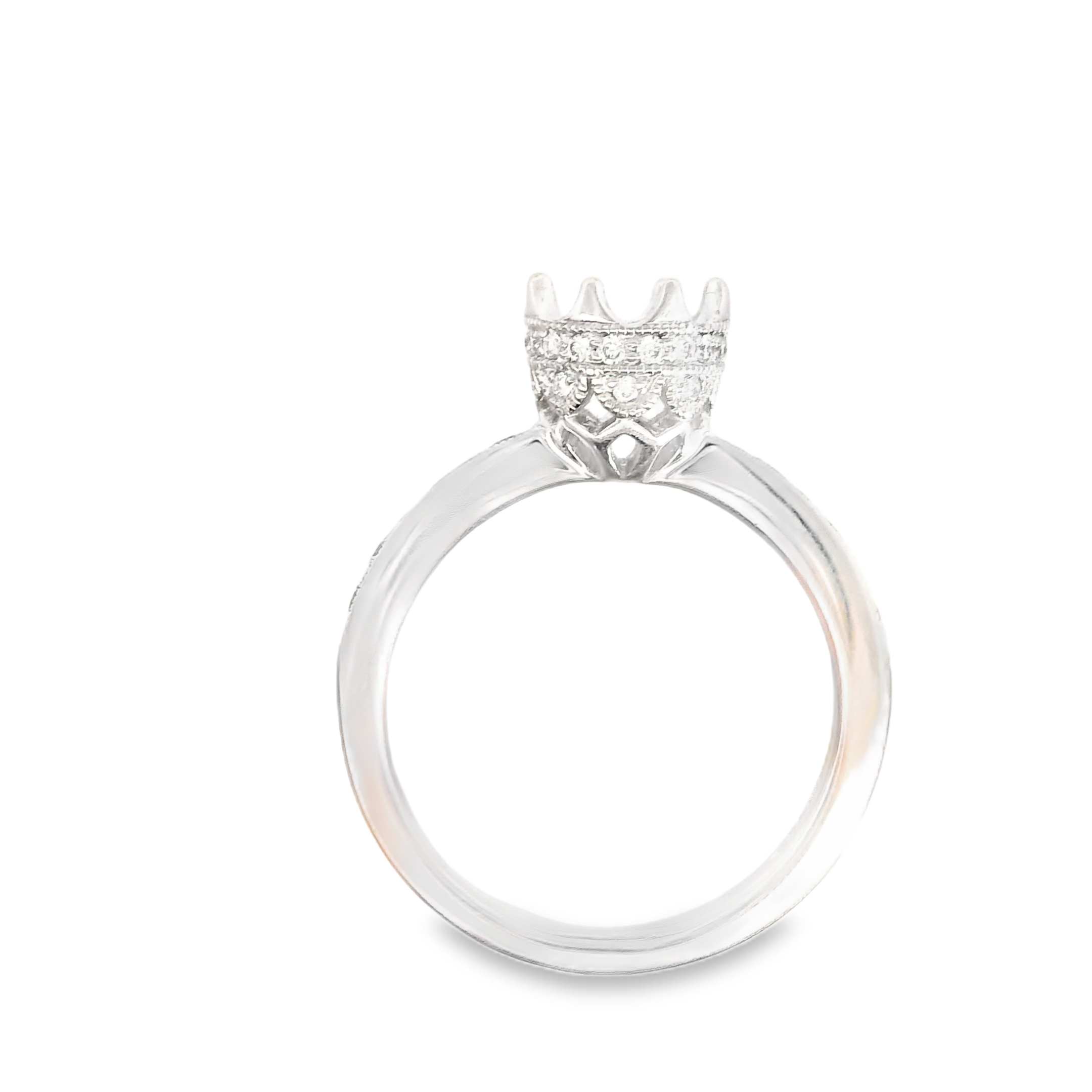 14K WHITE GOLD DIAMOND ENGAGEMENT RING, 0.30 CT TW ALL DIAMONDS. THE DIAMOND ARE PRONG SET WITH MILIGRAIN DETAILING. THE PROFILE CROWN OF THE RING ALSO HAS DIAMONDS SET. THE RING FEATURES 8 PRONGS TO HOLD THE CENTER STONE.