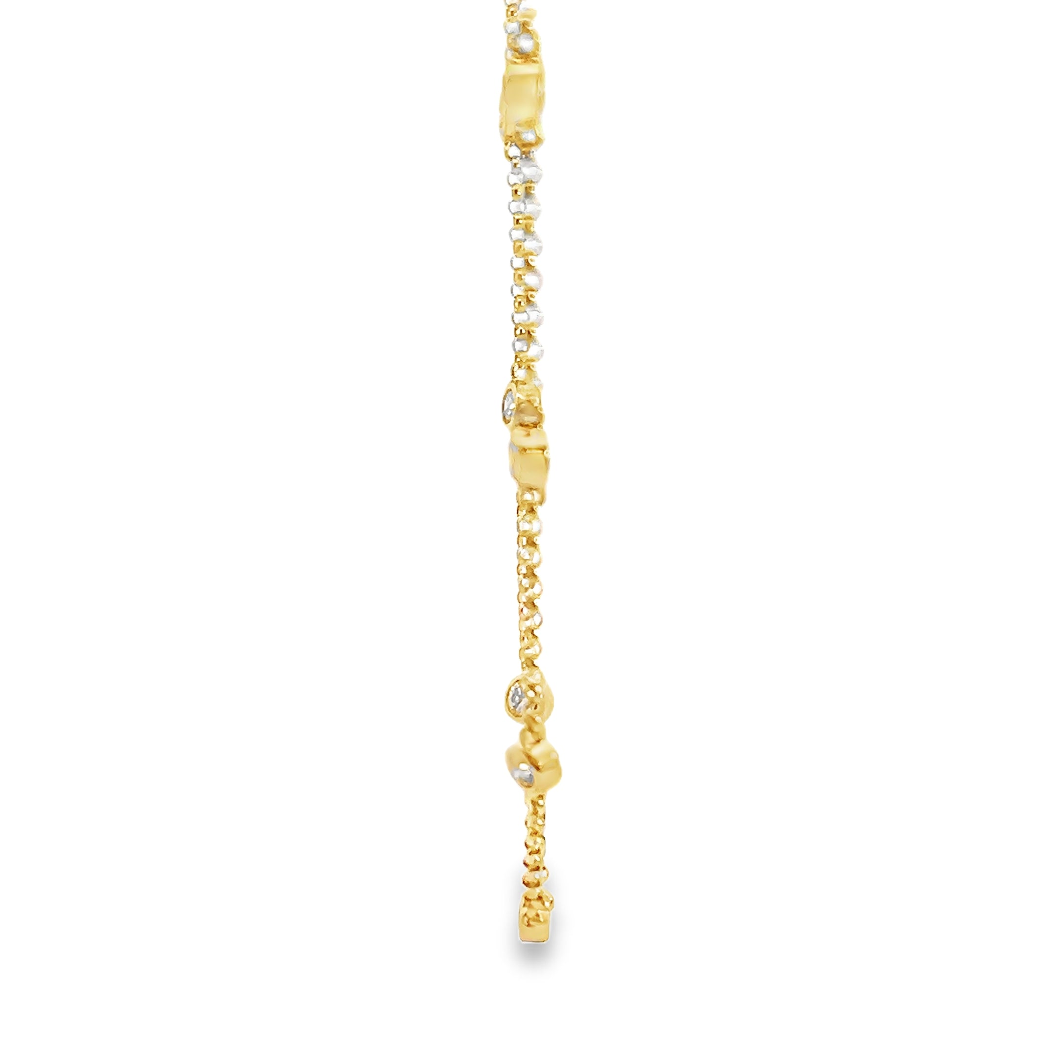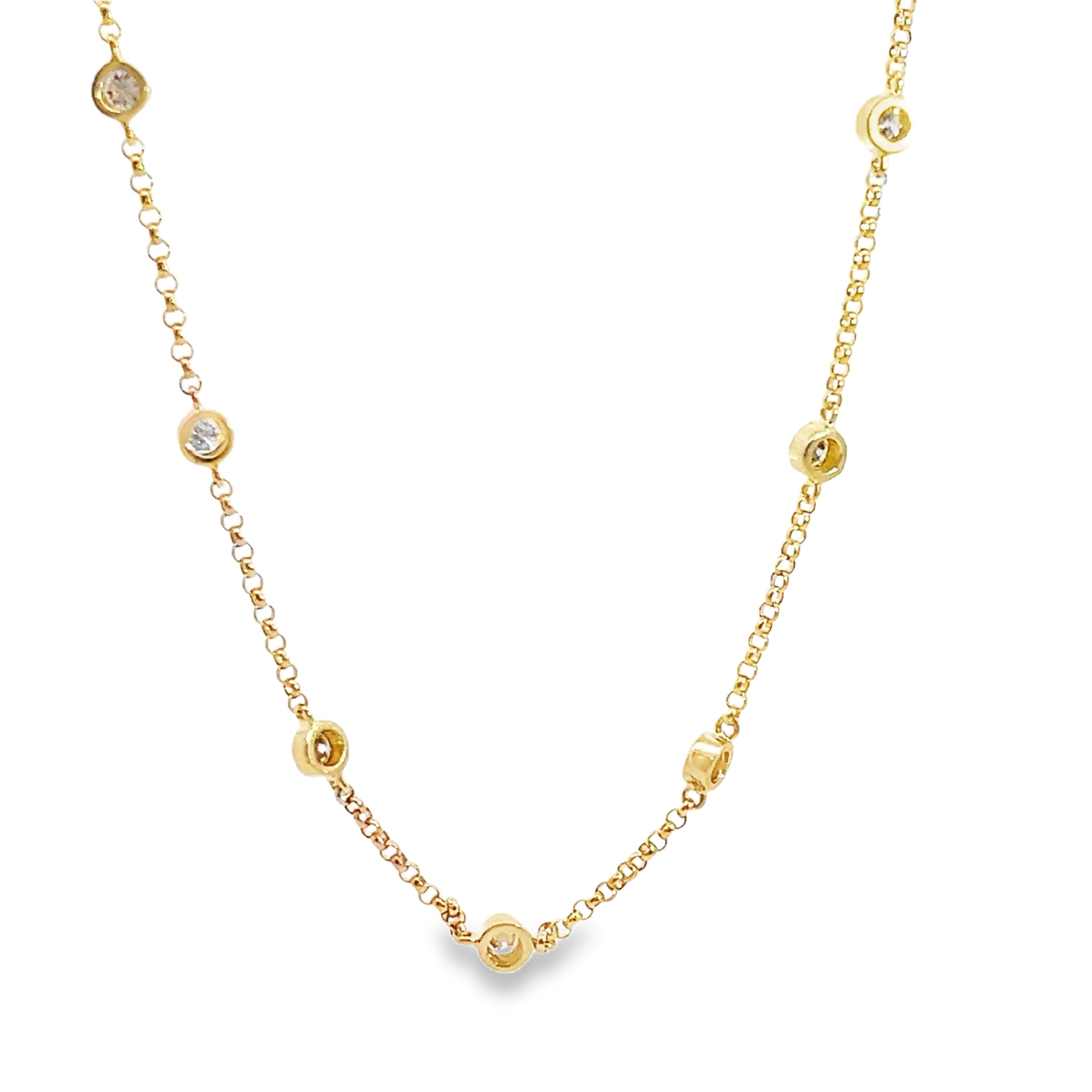 This necklace is a 14k yellow gold diamonds by the yard necklace with 9 diamonds bezel set stationed in the necklace totaling 0.90 ct tw. The necklace is adjustable from 16-17" in length.
