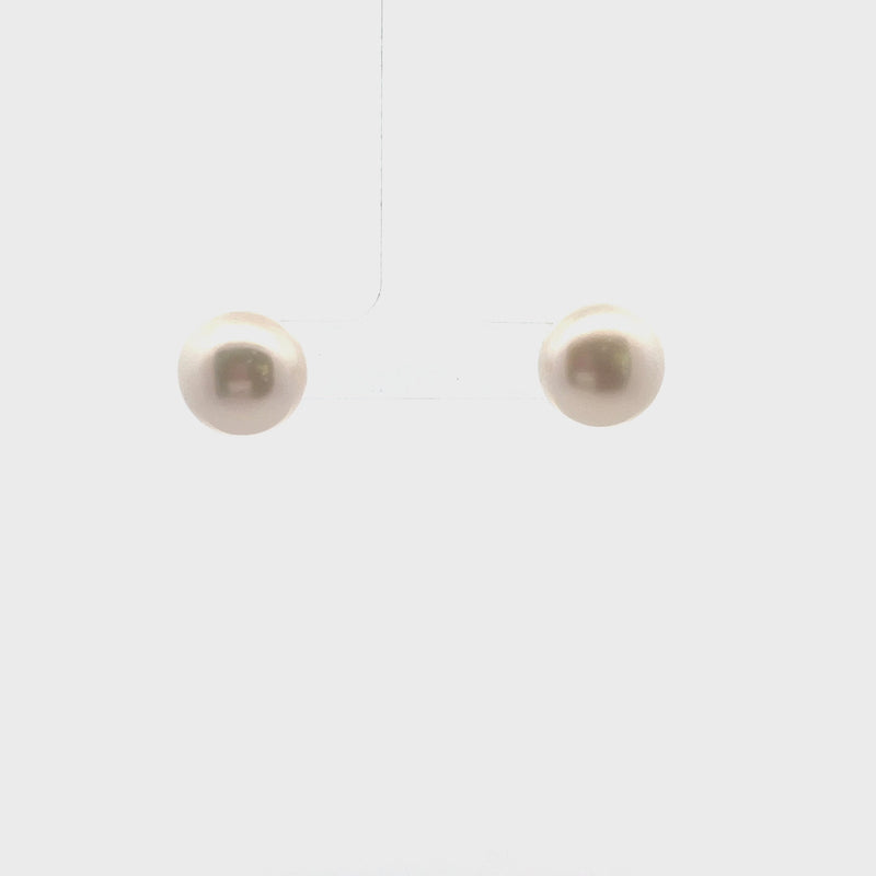 These pearl stud earrings are set in 14k yellow gold with a 12-12.5mm white button pearl set in each one with heavy friction backs.
