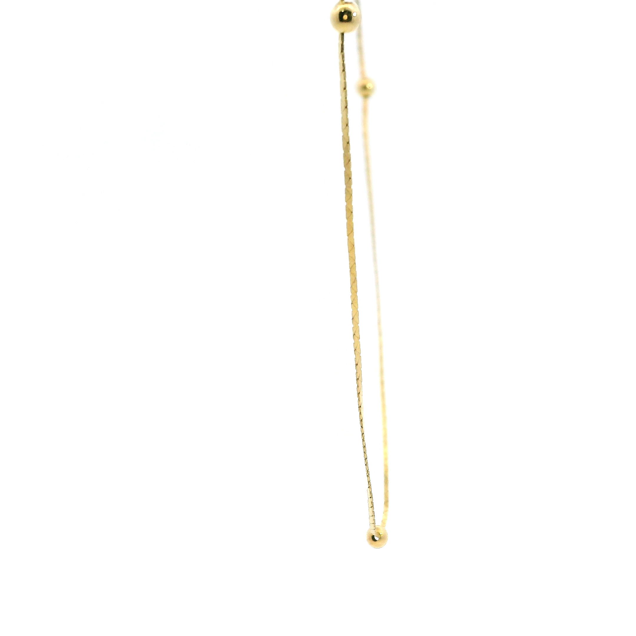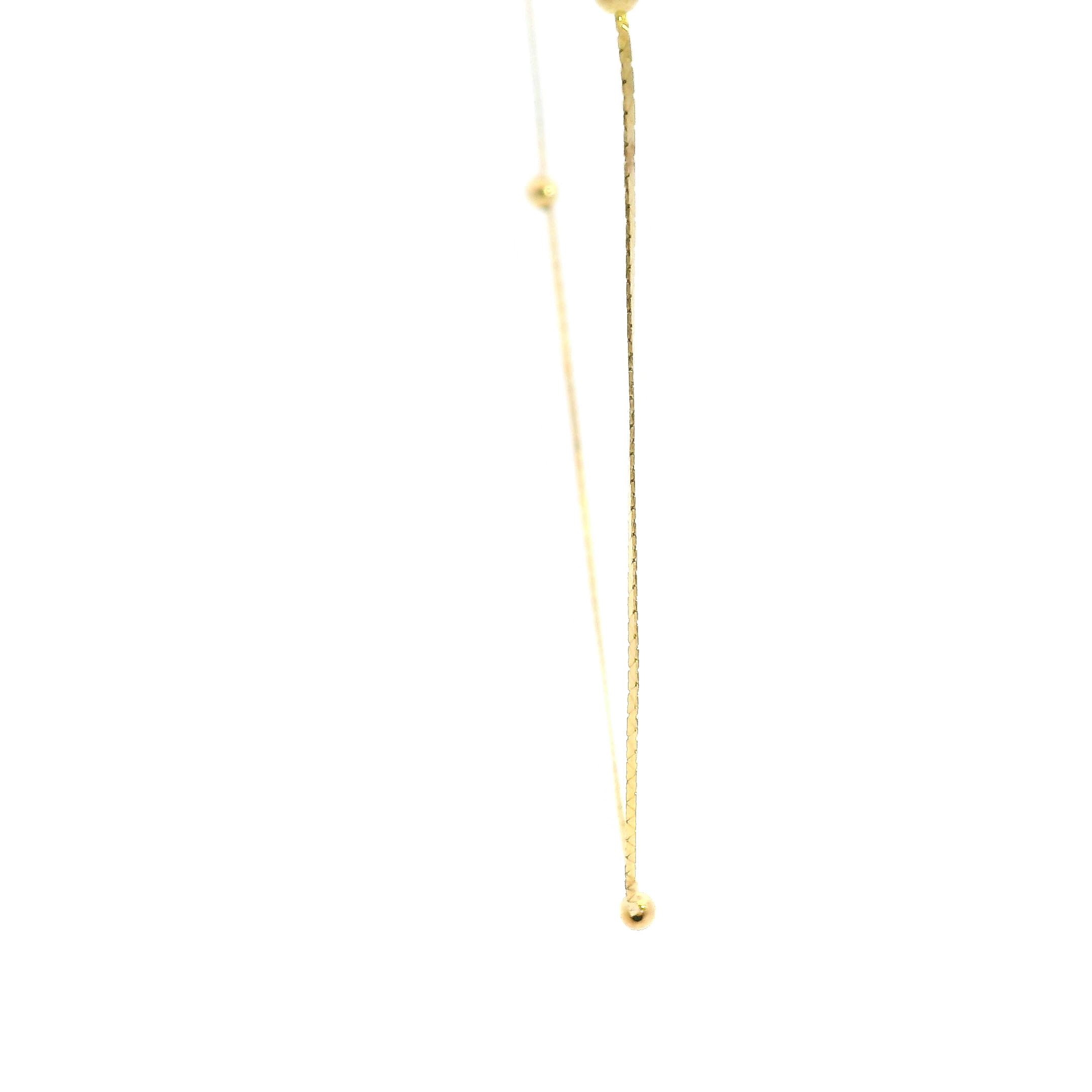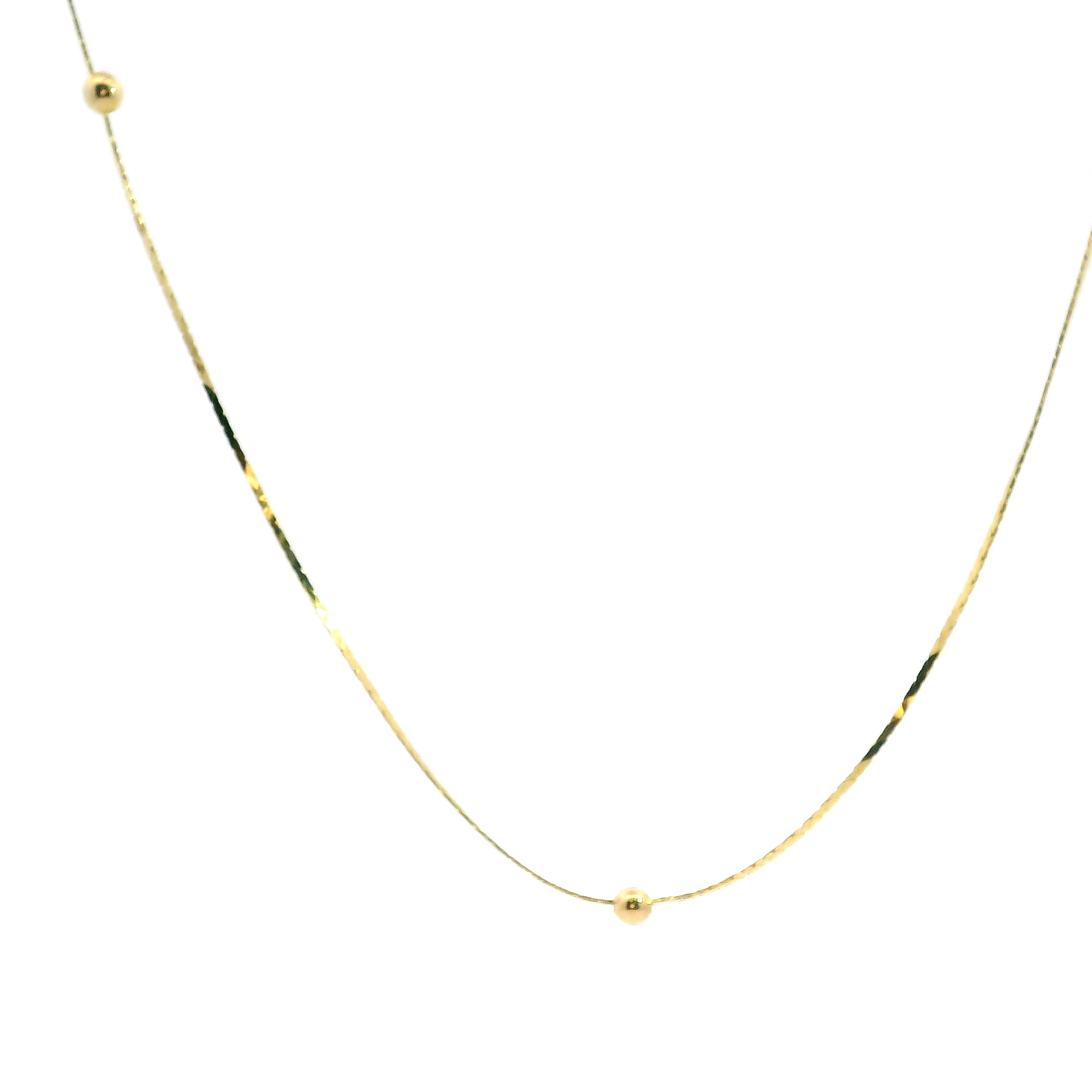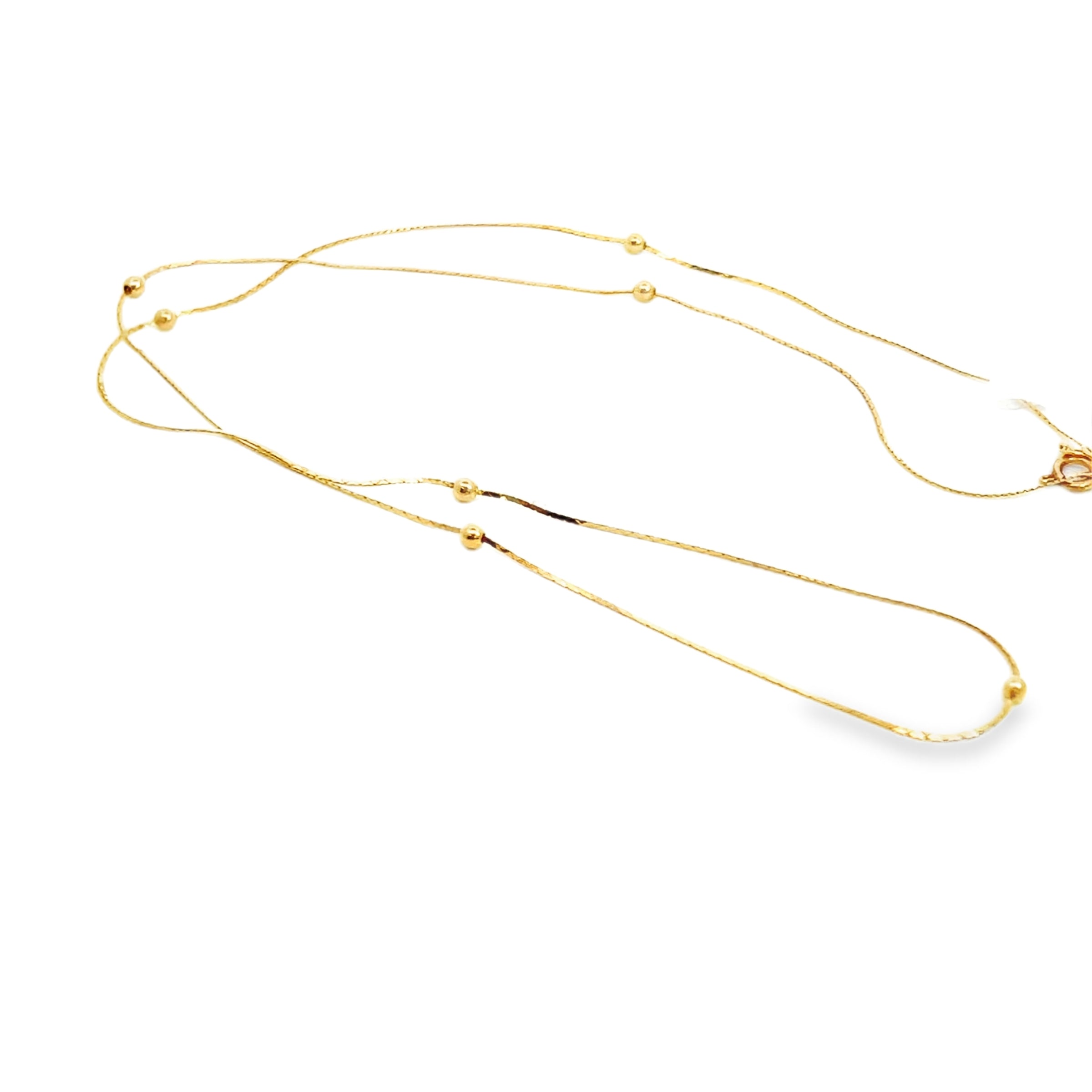 This estate chain is 14k yellow gold. The chain is 0.5mm wide with 7 2.25mm gold beads stationed throughout the chain. The chain is 18" long with a spring ring clasp.