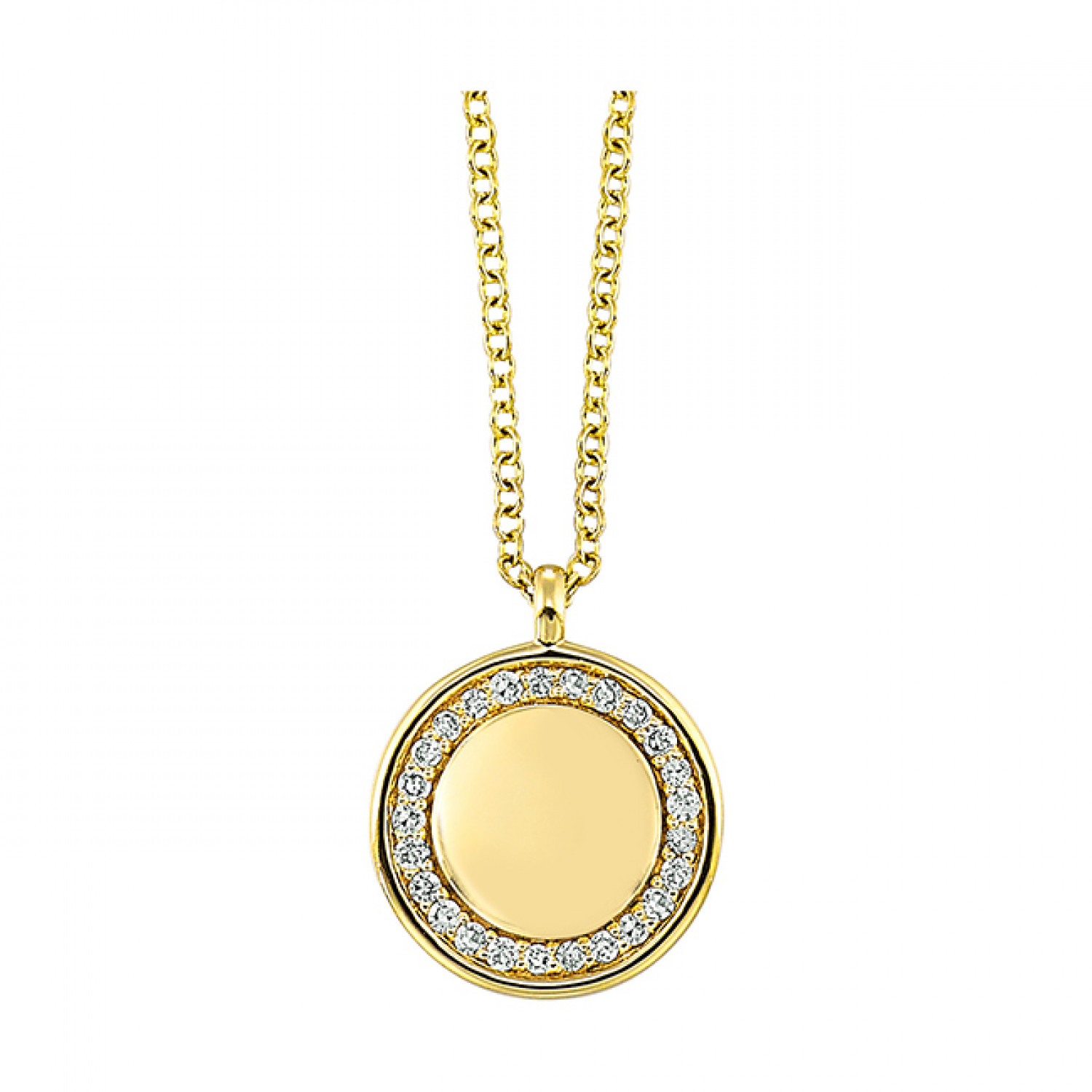 This diamond pendant is a circle disc pendant with diamonds prong set around the outside of the pendant. The diamonds total 0.05 ct tw. Pendant is engravable. The chain is a cable link chain with a lobster clasp that is adjustable from 16-18"
