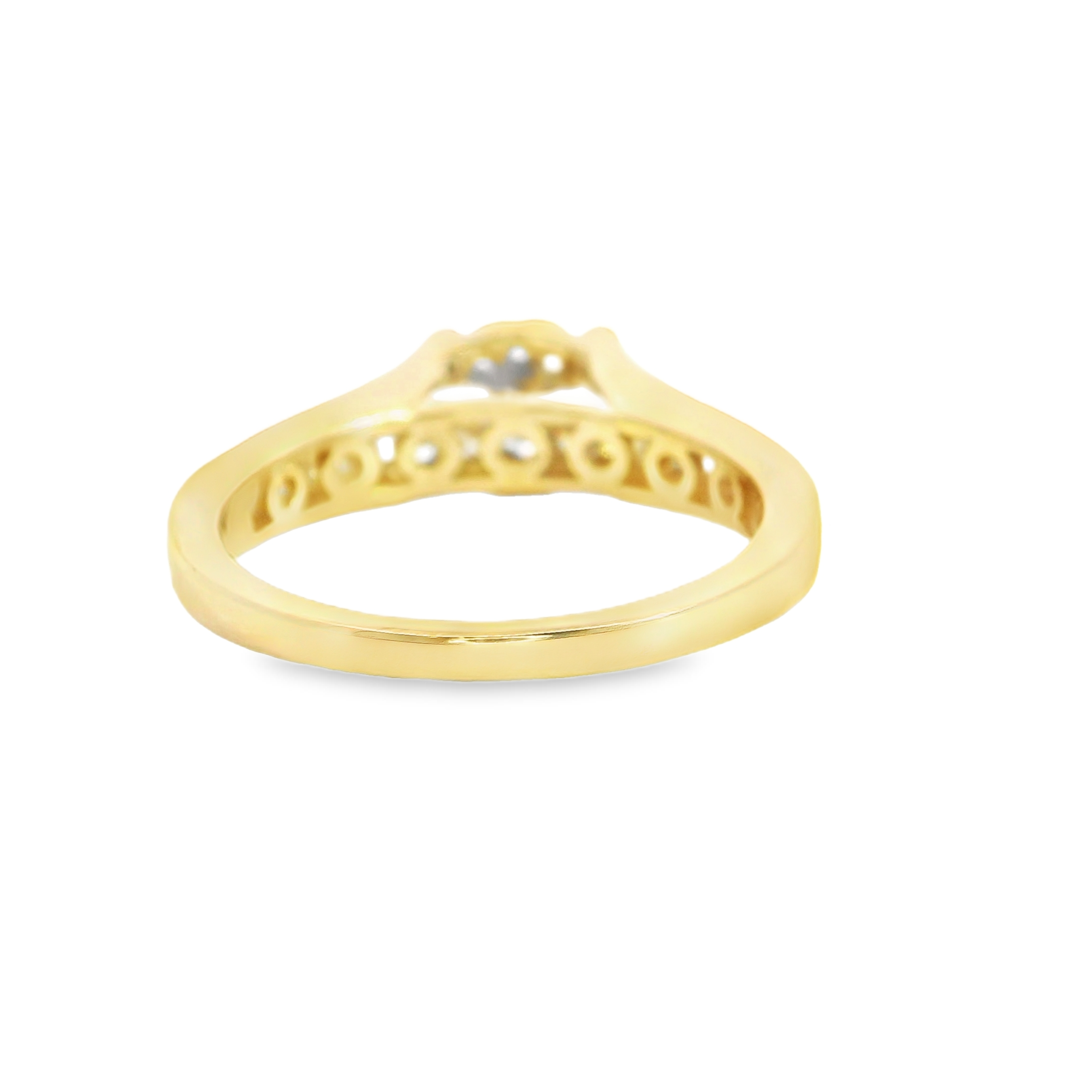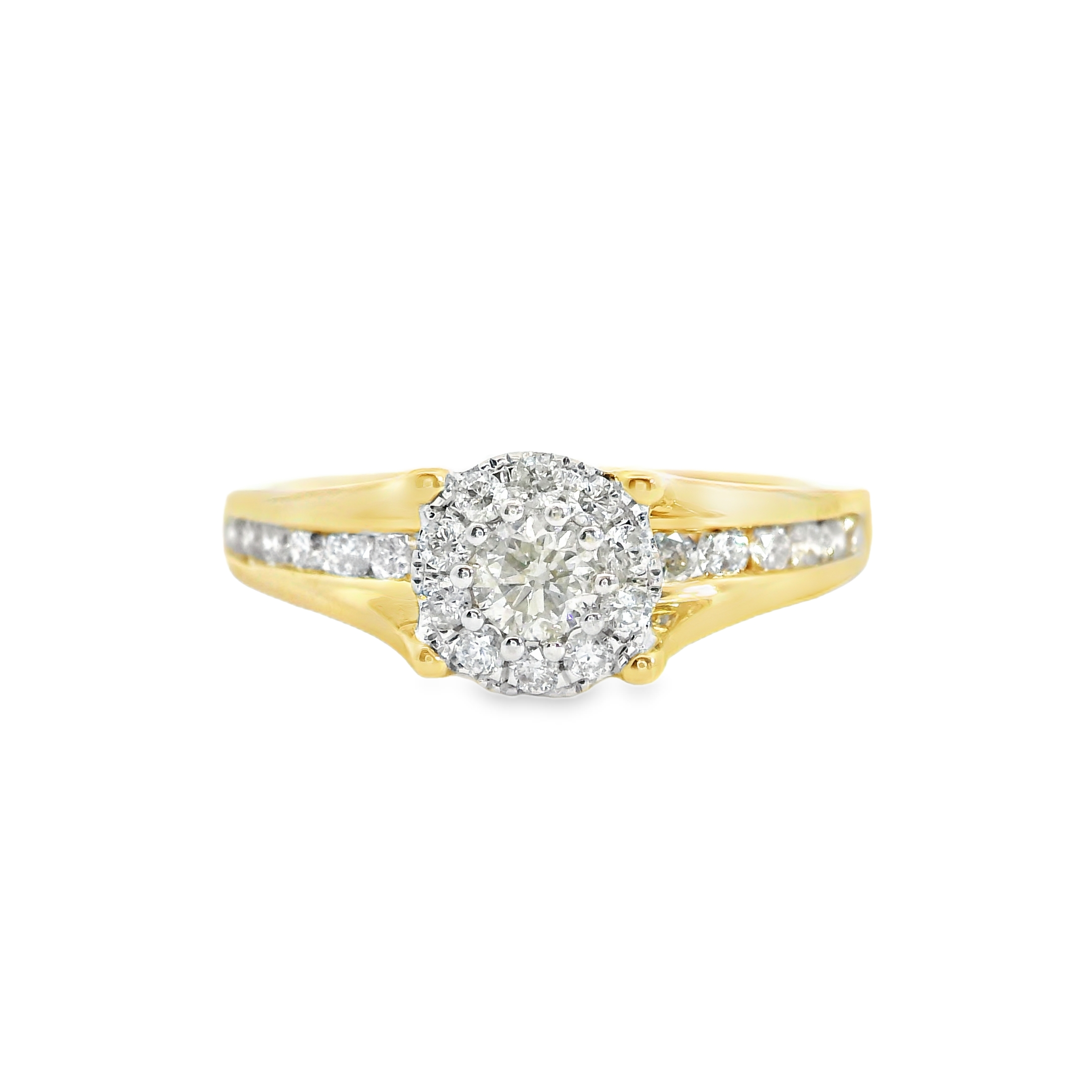 This ring is an estate 14k yellow gold ring with diamonds set in the center in a halo style and diamonds channel set in the band and under the center diamond plate. The diamonds total approx 0.55 ct tw and the ring is a size 7
