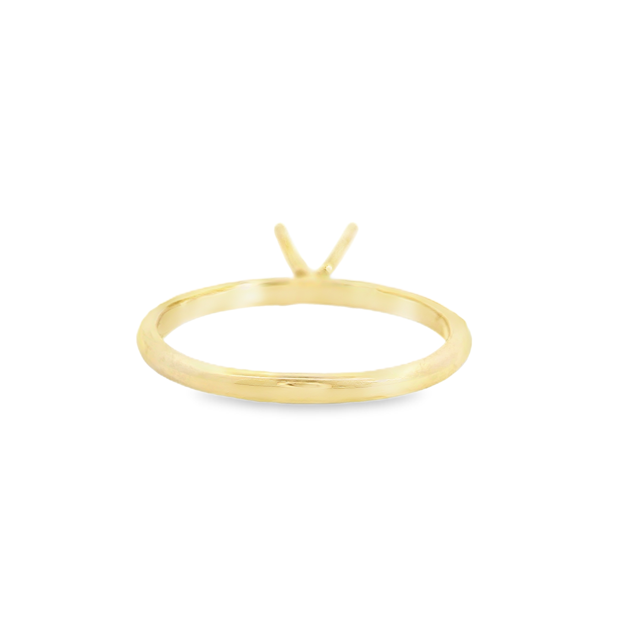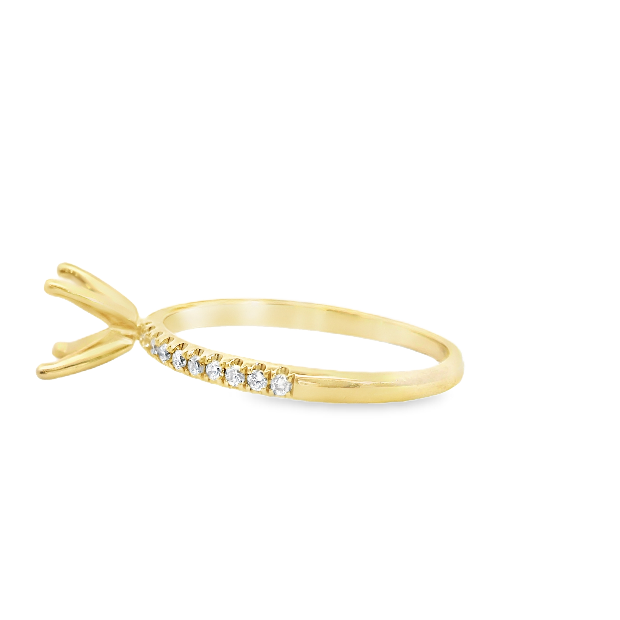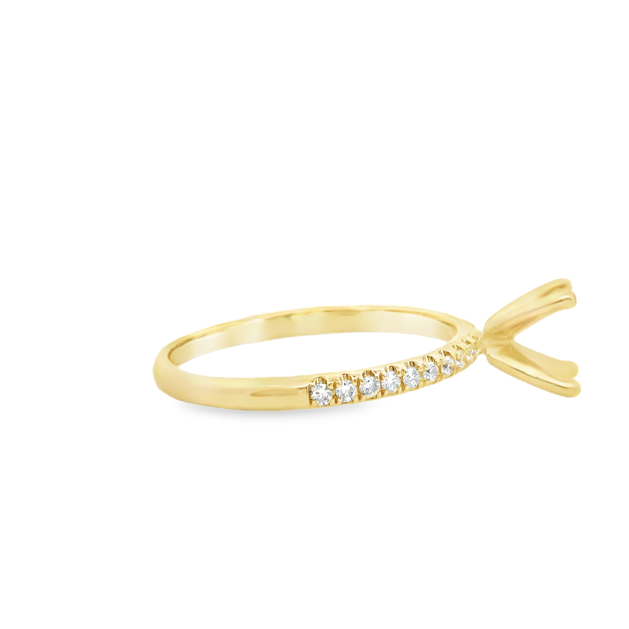 This ring is a 14k yellow gold classic diamond mounting with 20 round diamonds prong set across the band. They total 0.15 ct tw.