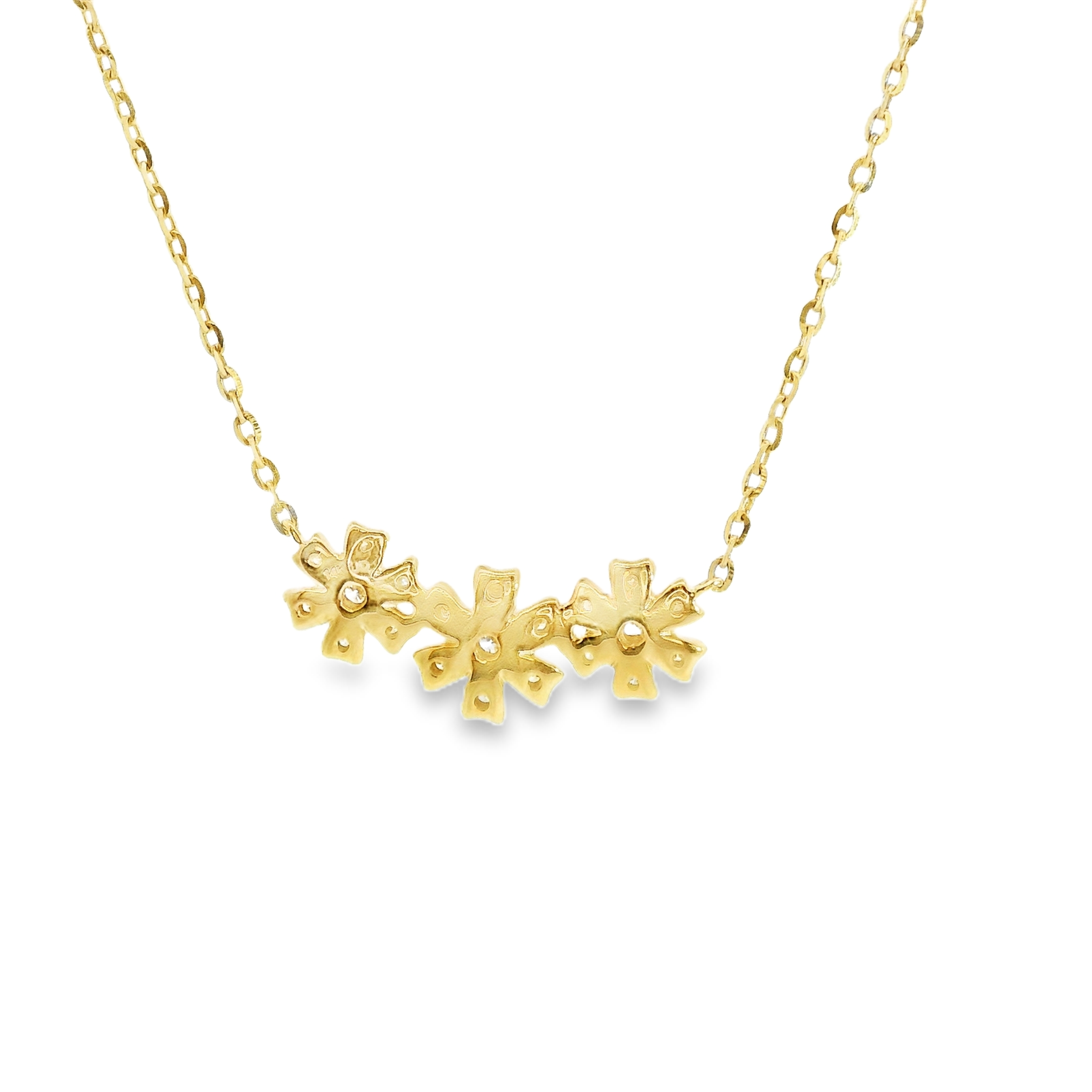 This is a 14k yellow gold diamond necklace with 3 flowers at the center of the necklace with diamonds prong set in the flowers. The diamonds total 0.13 ct tw and is adjustable from 16-18"