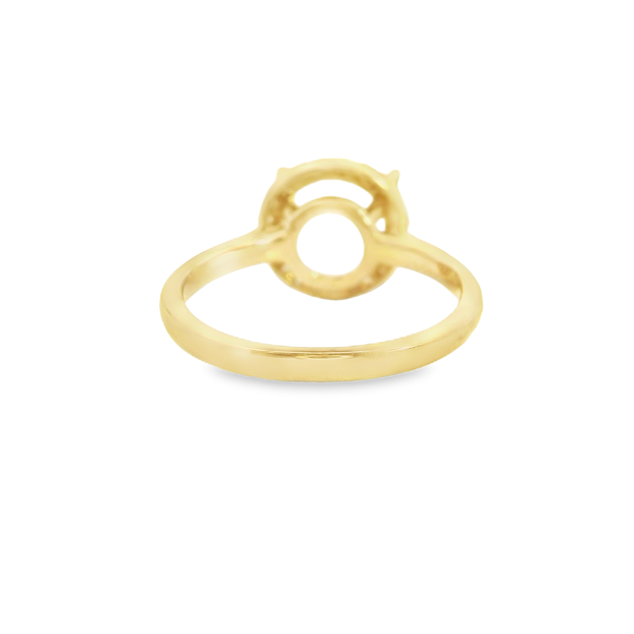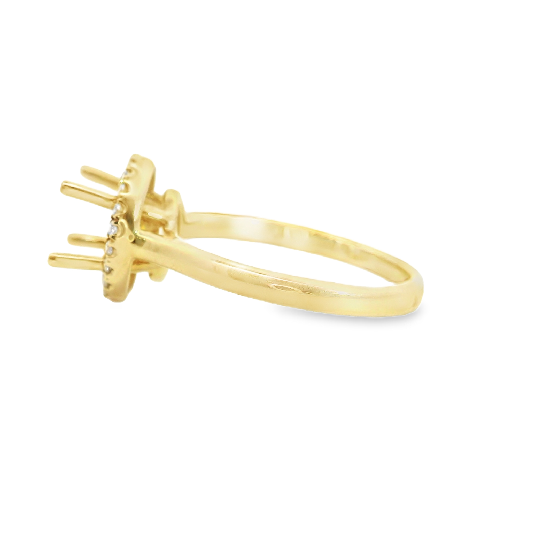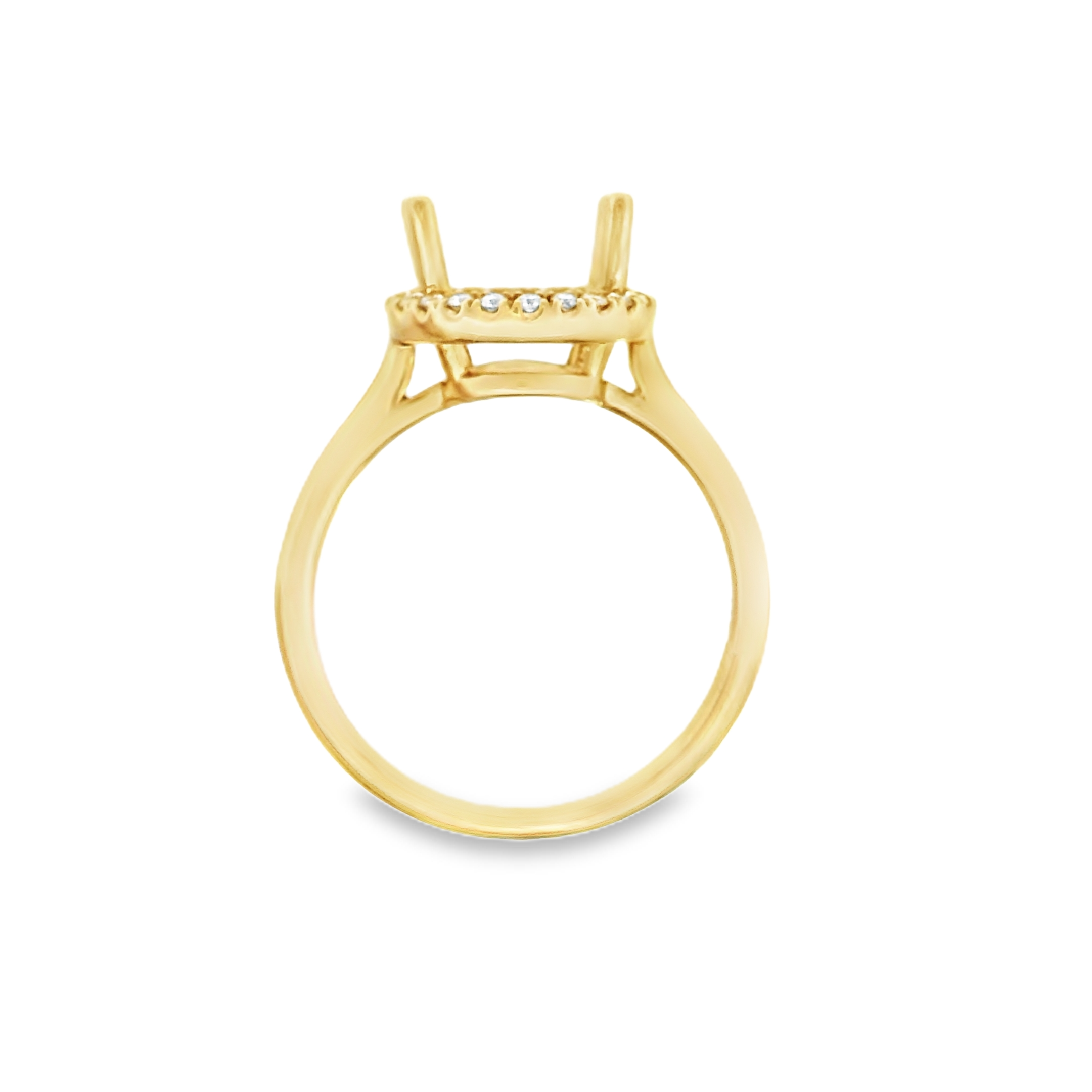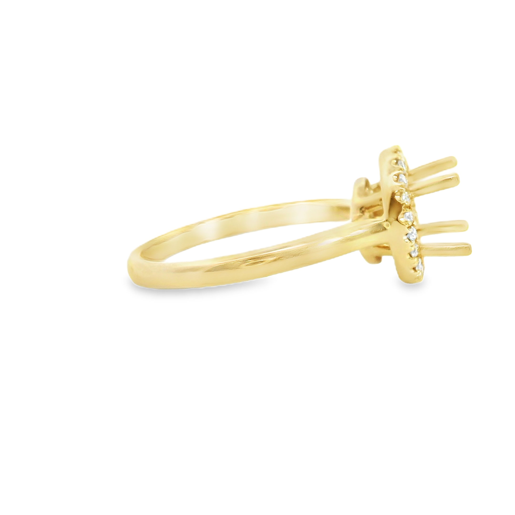 This 14k yellow gold ring mounting is a halo style ring with 22 diamonds prong set in the halo totaling 0.13 ct tw. The ring fits an 8.0mm center stone.