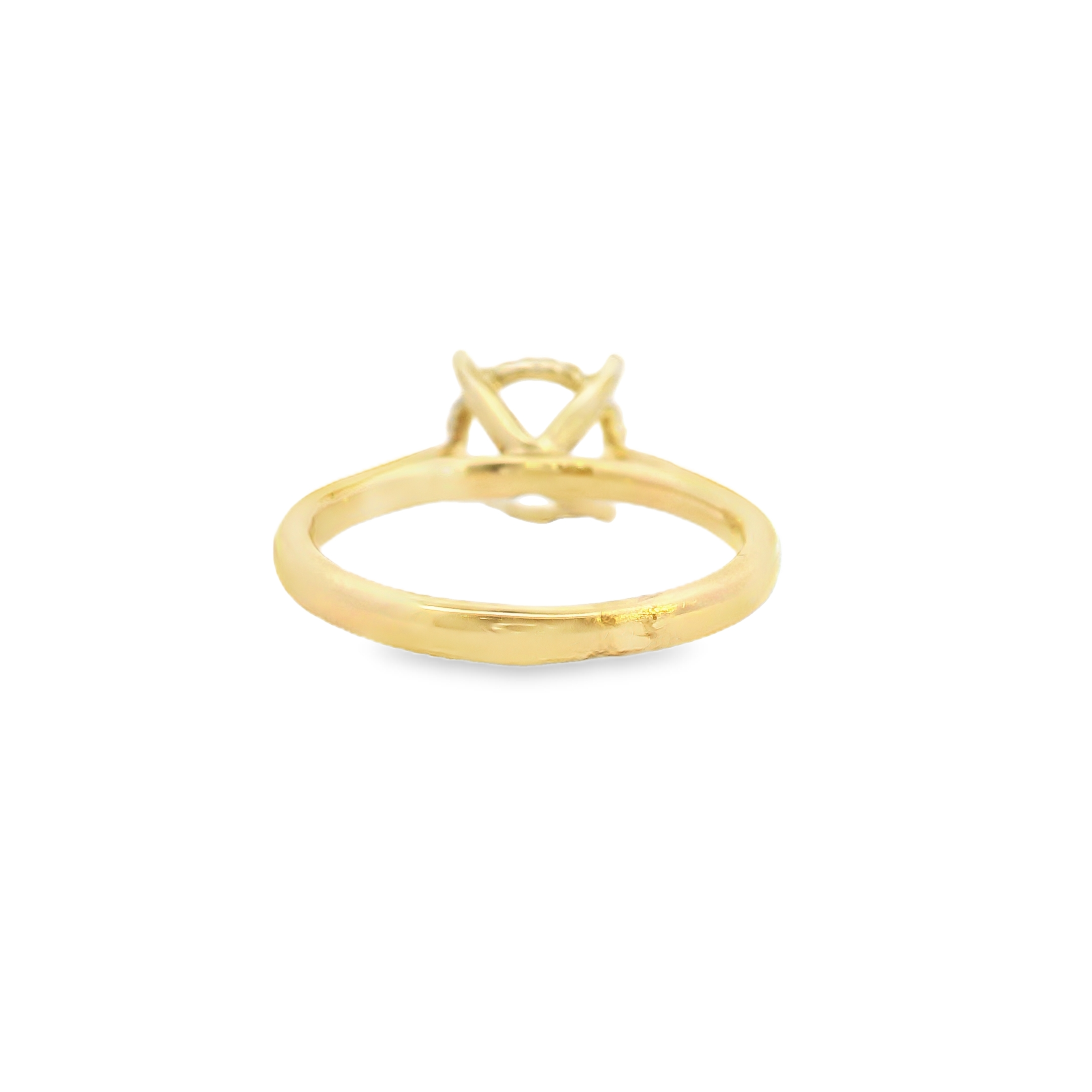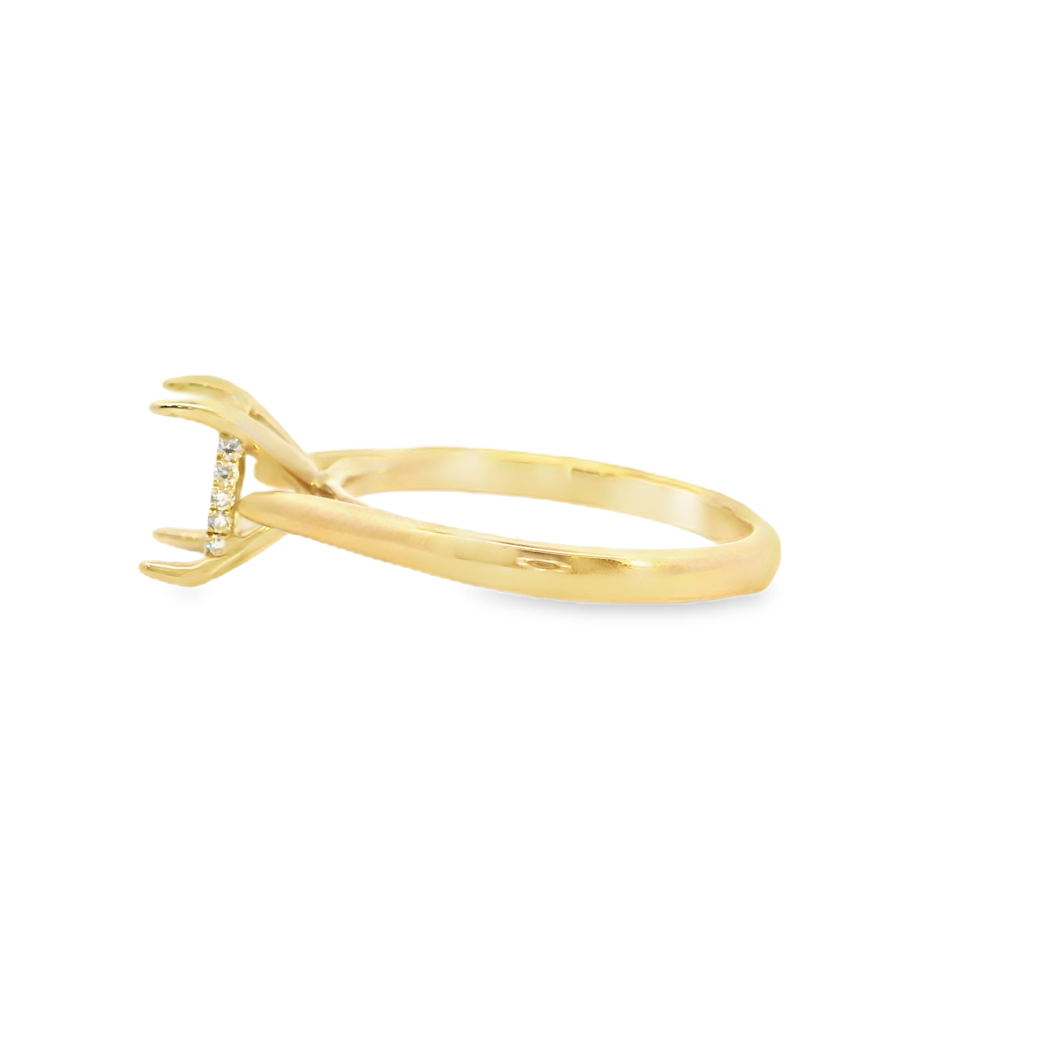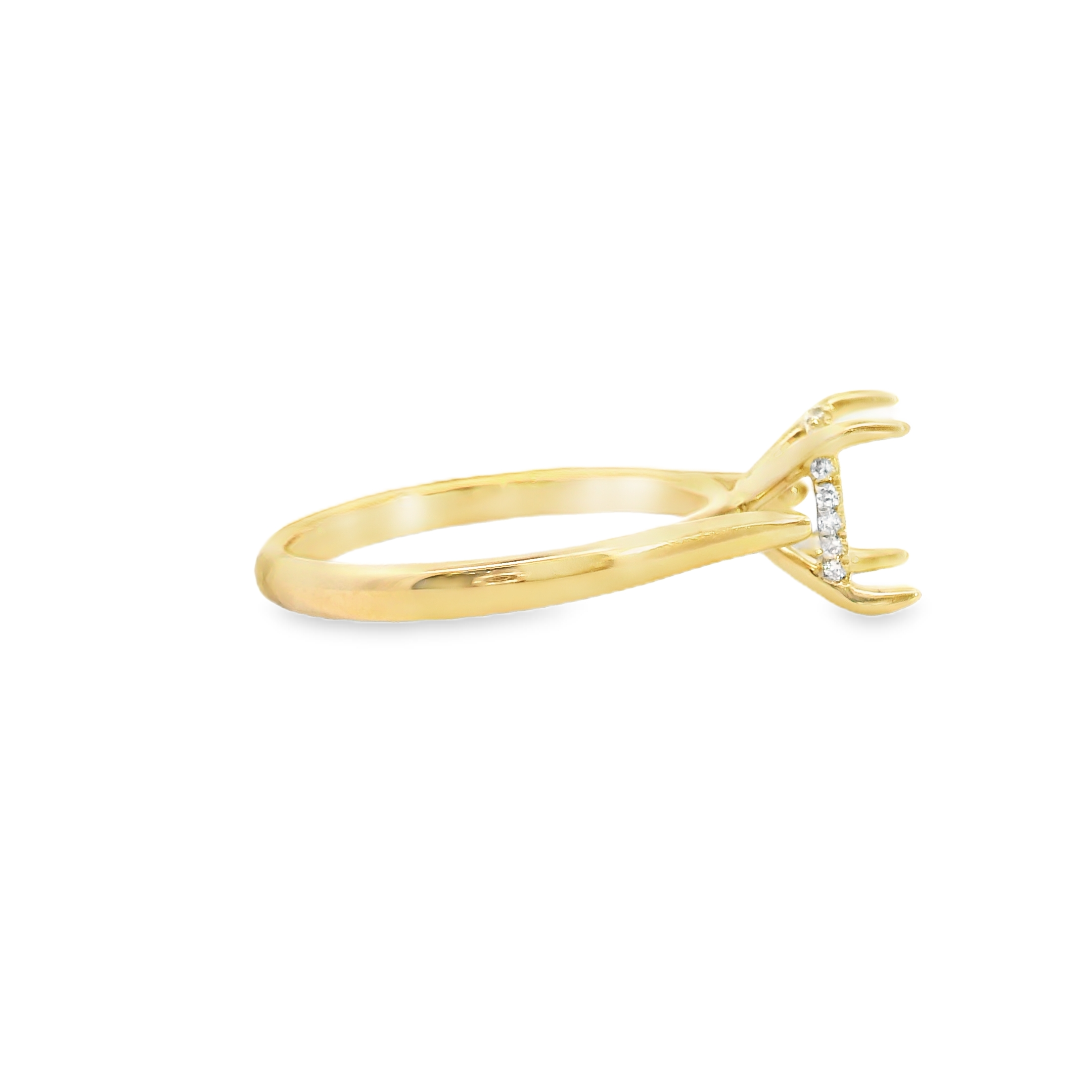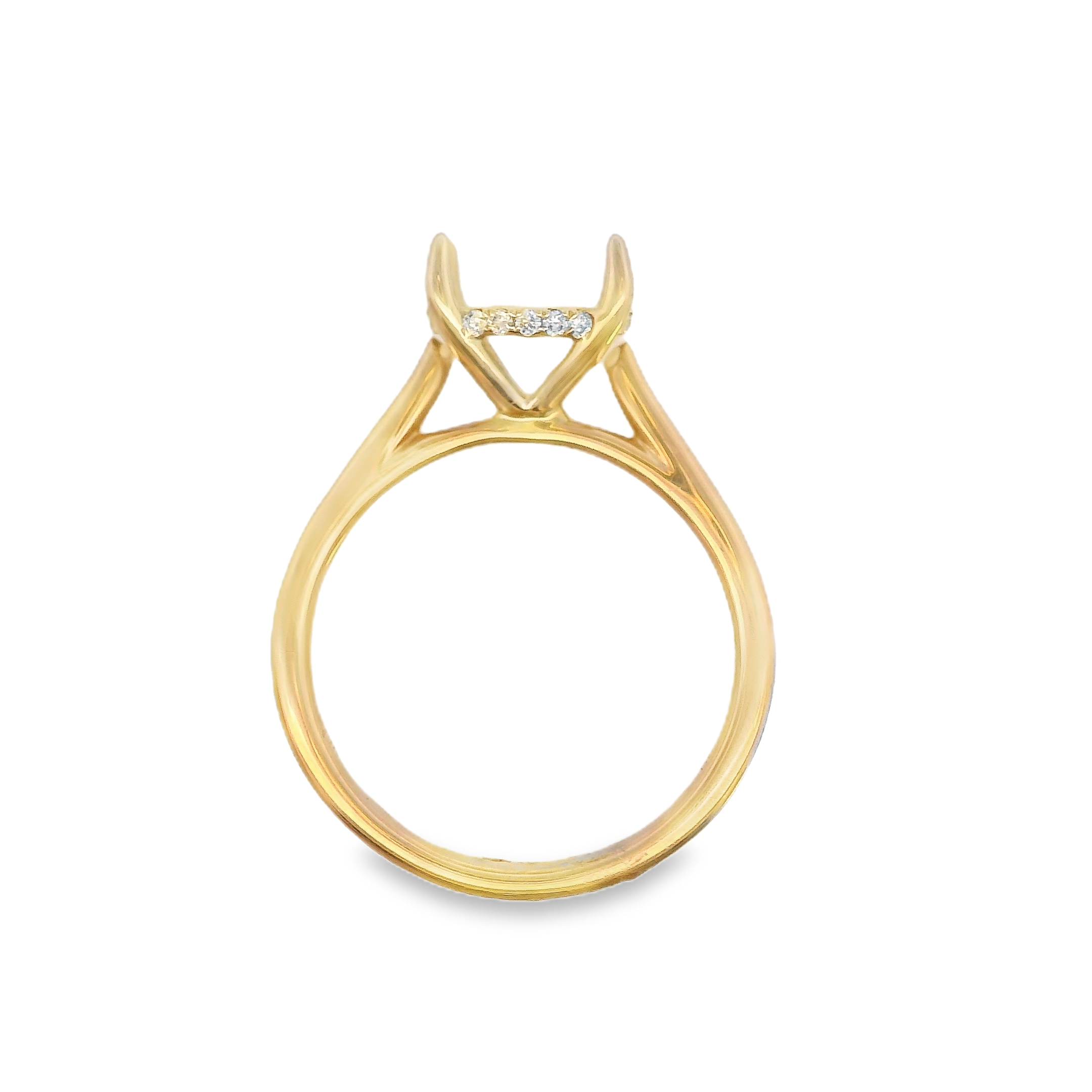 This 14k yellow gold diamond setting is a classic solitaire setting with cathedral sides. It has a hidden halo of diamonds prong set around the bottom of the diamond setting. It is made to hold a 2.0 CT center stone. 20 diamonds total 0.10 ct tw.