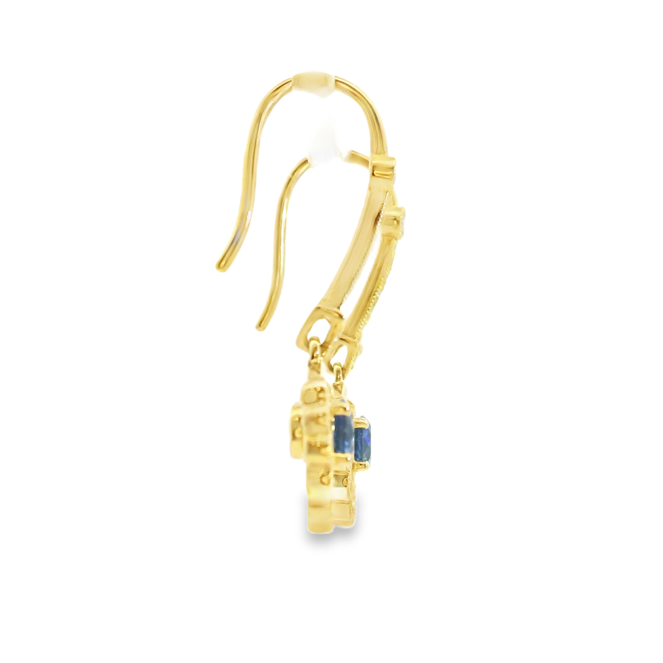 These earrings are 14 k yellow gold dangle earring with diamonds prong set with milgrain detailing in a drop style and going around the bottom of the sapphires. The 2 blue sapphires are set in the center of the bottom dangle. Beautiful vintage inspired look! The diamonds total 0.41 ct tw and the sapphires total 0.60 ct tw.
