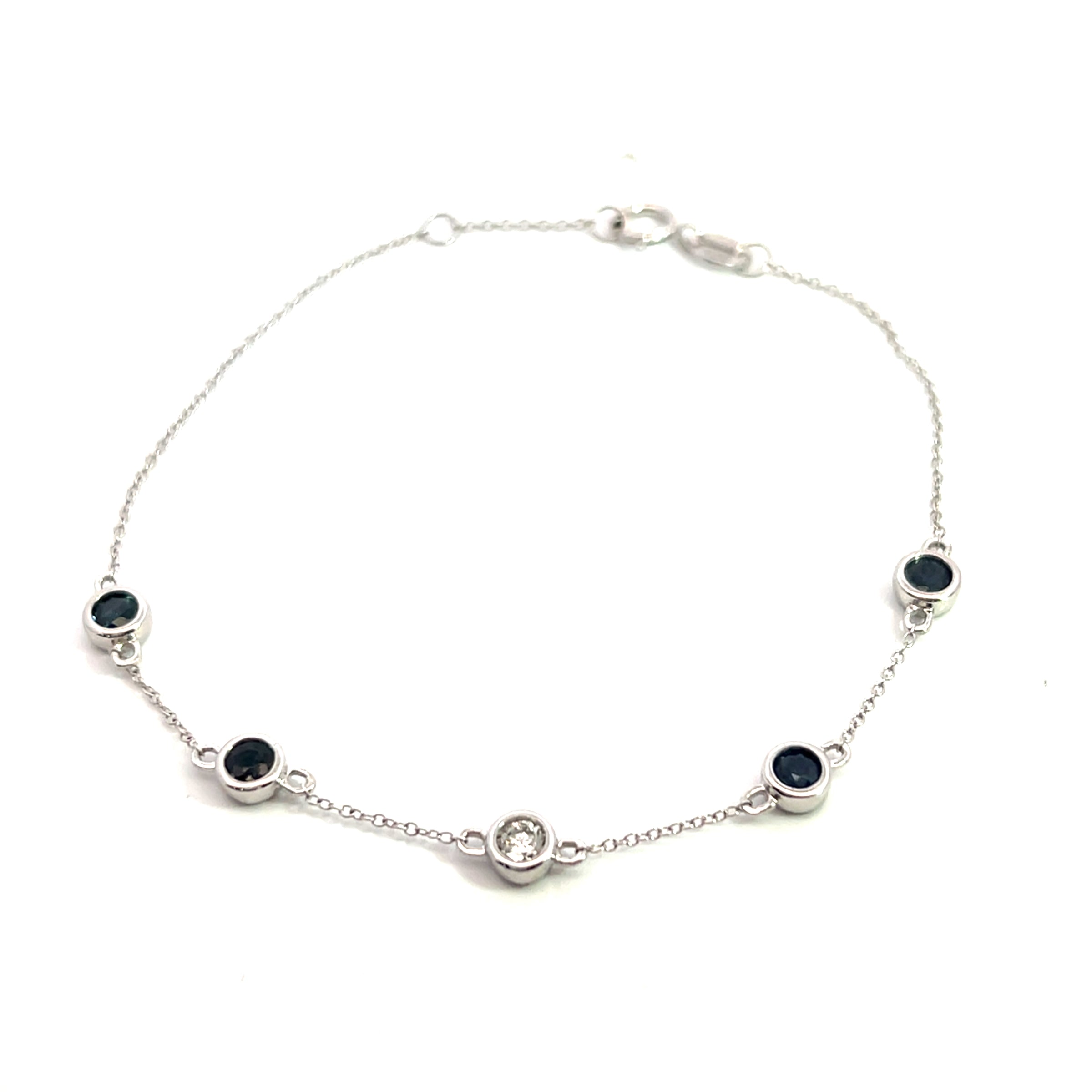 This link chain bracelet has 4 stationed sapphires and 2 diamond bezel set in the center of the bracelet. The sapphires total 0.56 ct tw and the diamond is 0.11 ct. The bracelet is adjustable from 6.5-7.0" long