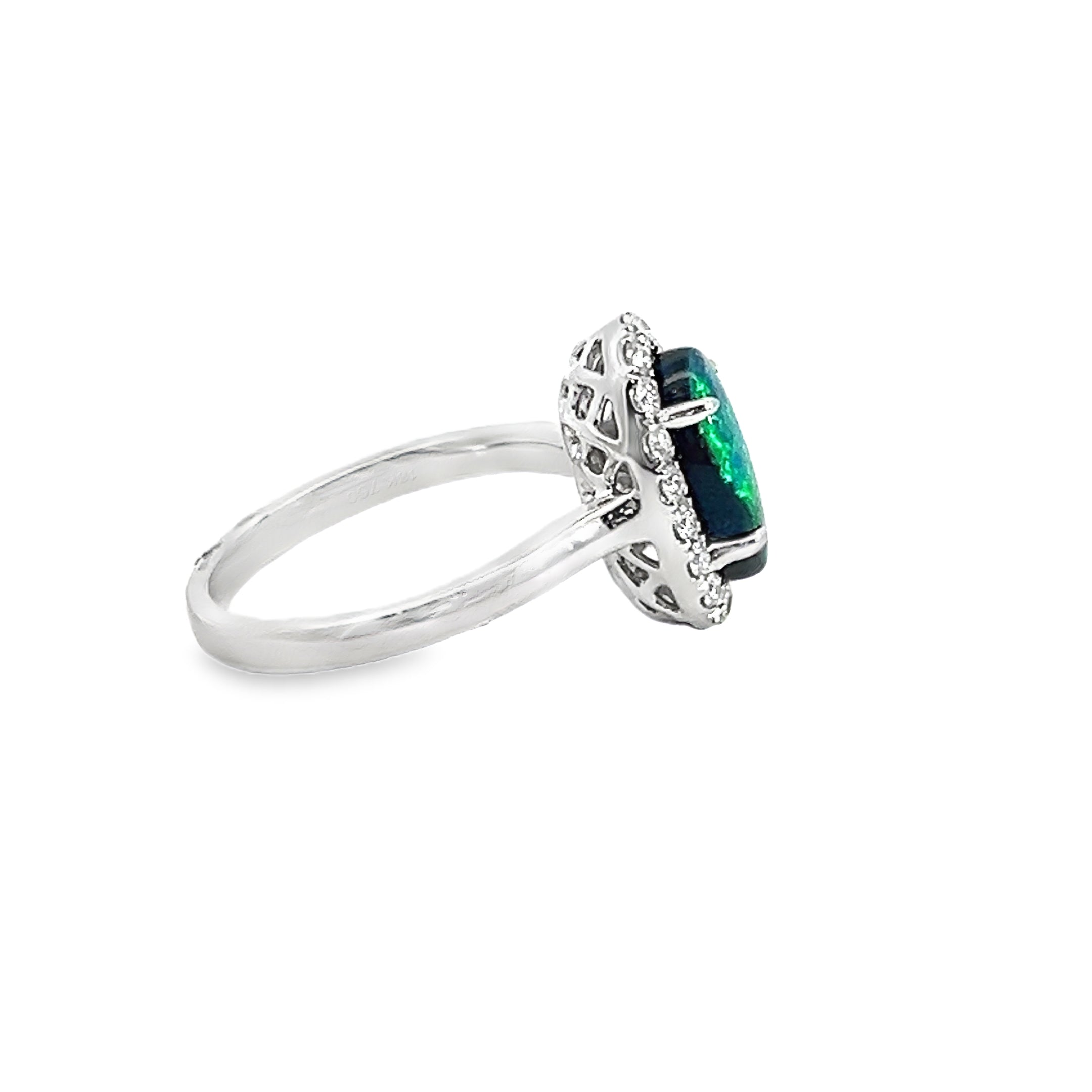 A n 18k white gold black opal and diamond ring. The center black opal is an elongated opal that is 1.46 CT, beautiful blue and green colors. The stone is set with a halo of diamonds. 18 diamonds total 0.31 ct tw, G-VS color and clarity.