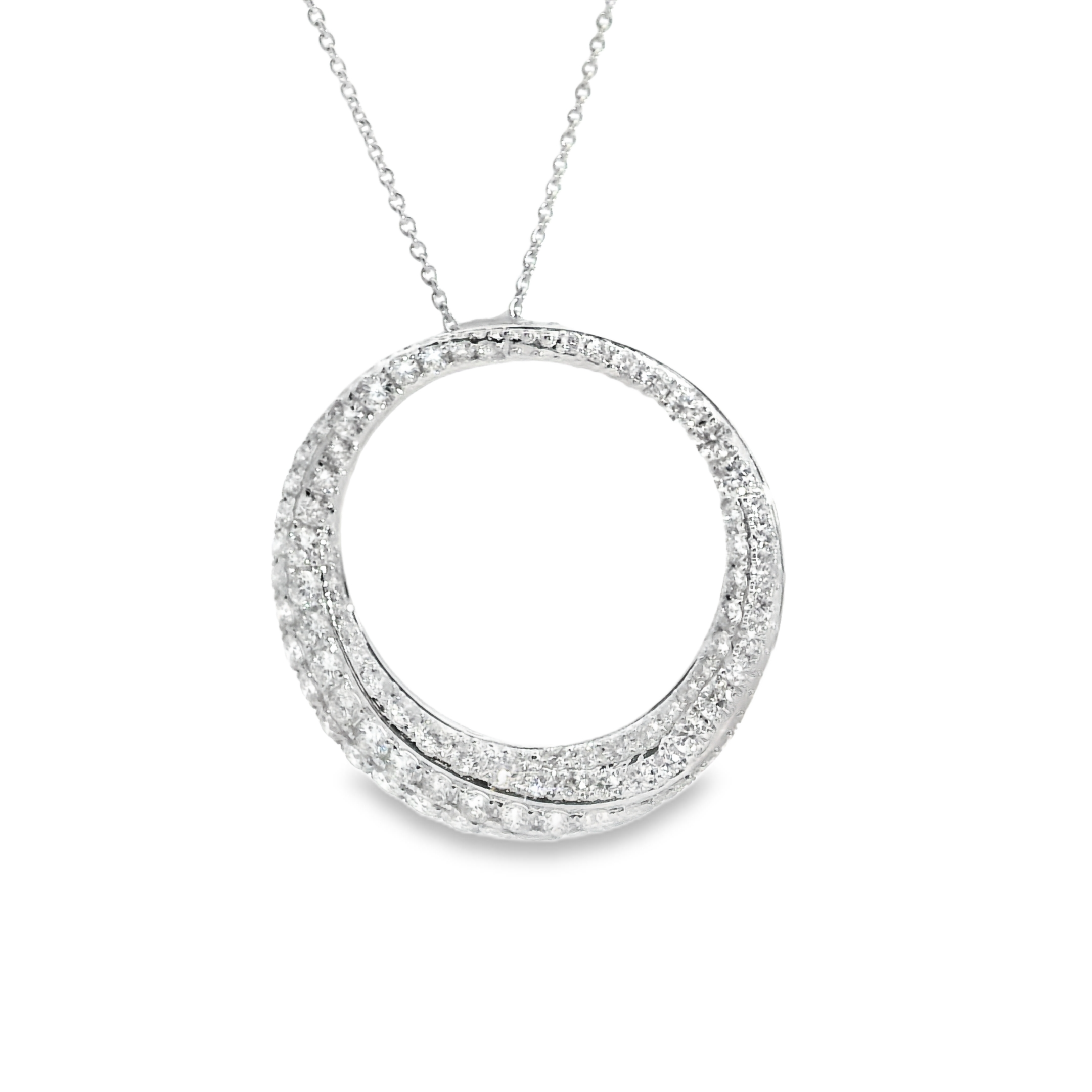 This diamond circle pendant is 18k yellow gold with 84 diamonds pave set in a twisted style around the circle pendant. The diamonds total 2.02 CT TW. It is approx 1" in diameter. The pendant is set on an 18K white gold diamond cut link chain that is 18" long with a lobster clasp.
