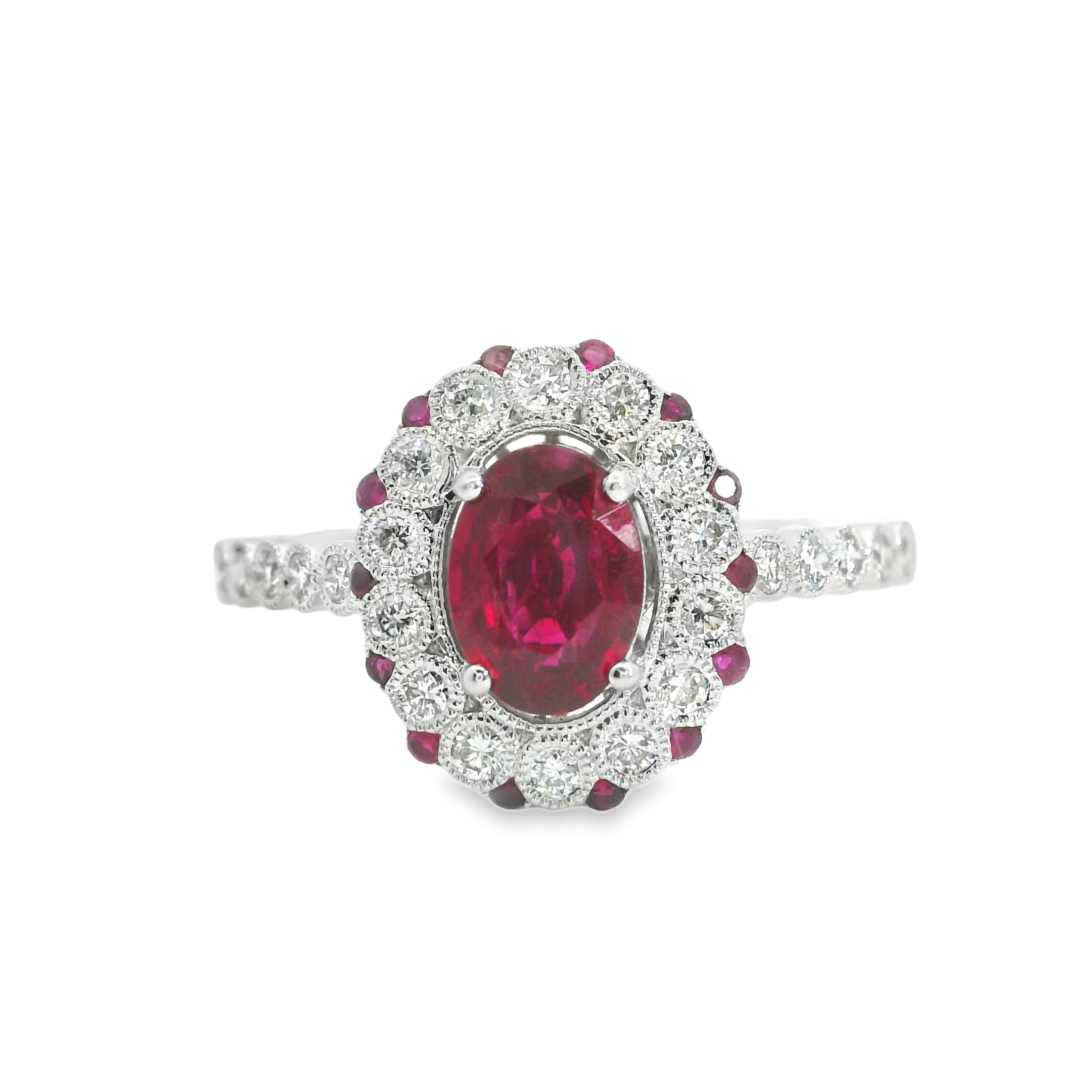 This gorgeous ring is an 18k white gold ruby and diamond ring. Set in the center is a 0.74 ct natural AA ruby, 0.74 ct tw. Bezel set with milgrain detailing in the ring are 24 natural diamonds totaling 0.33 ct tw. Set in between the diamond on the outer halo are 14 natural rubies totaling 0.14 ct tw to finish the exquisite look! Size 7