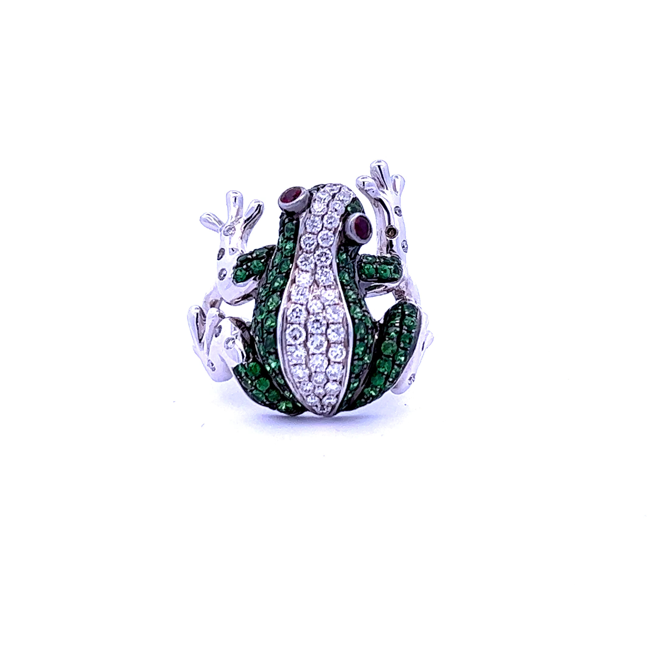 18K WHITE GOLD FROG RING WD=0.63 CT TW BD=0.04 CT TW TSAV=1.23 CT TW RUBY=0.11 CT TW