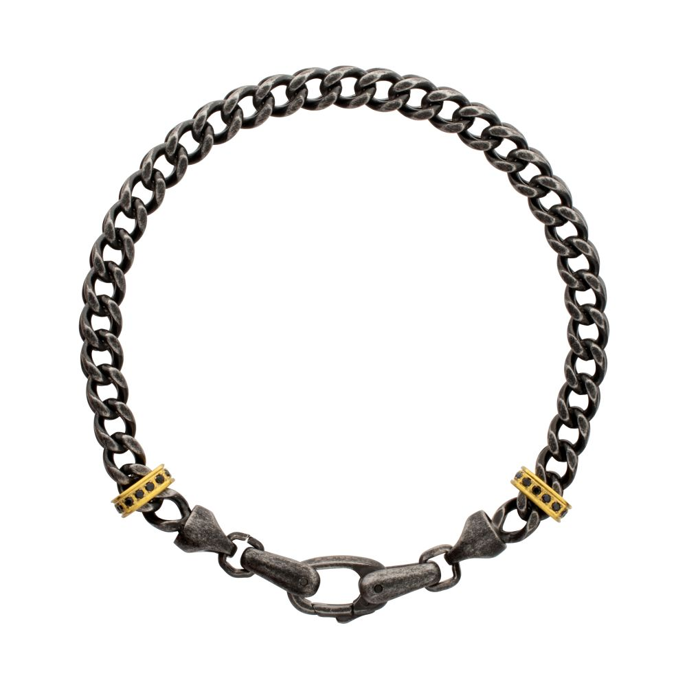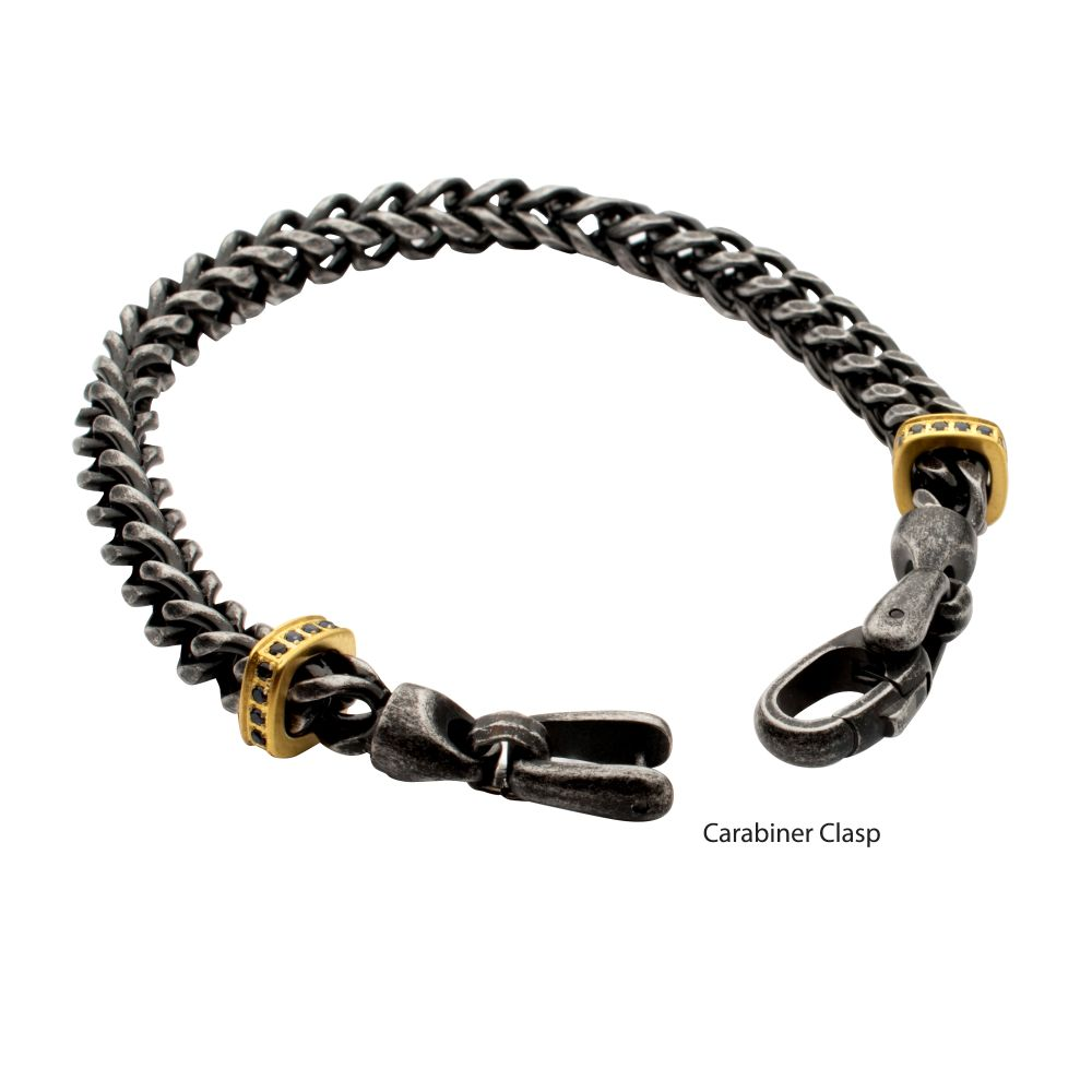 Men's IRONWORKS-MASTER SERIES: Antiqued Steel Chevron Franco Chain Bracelet with Black Sapphire & 18Kt Gold IP Links. 8"