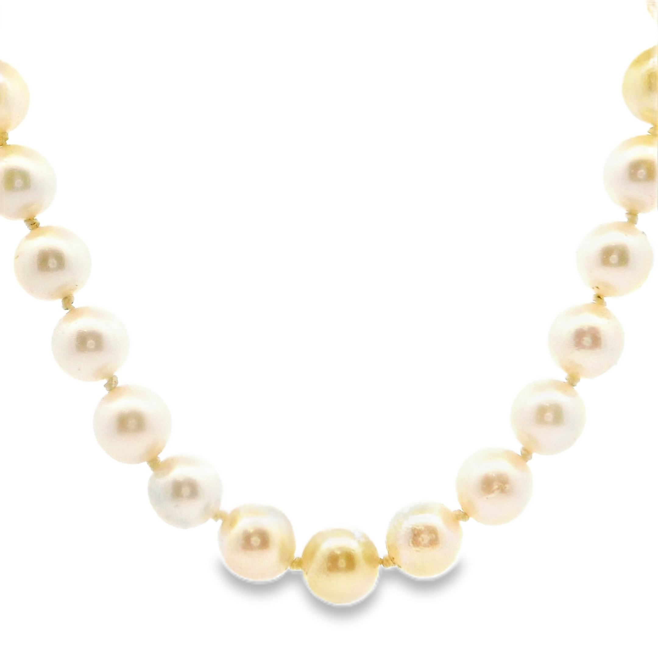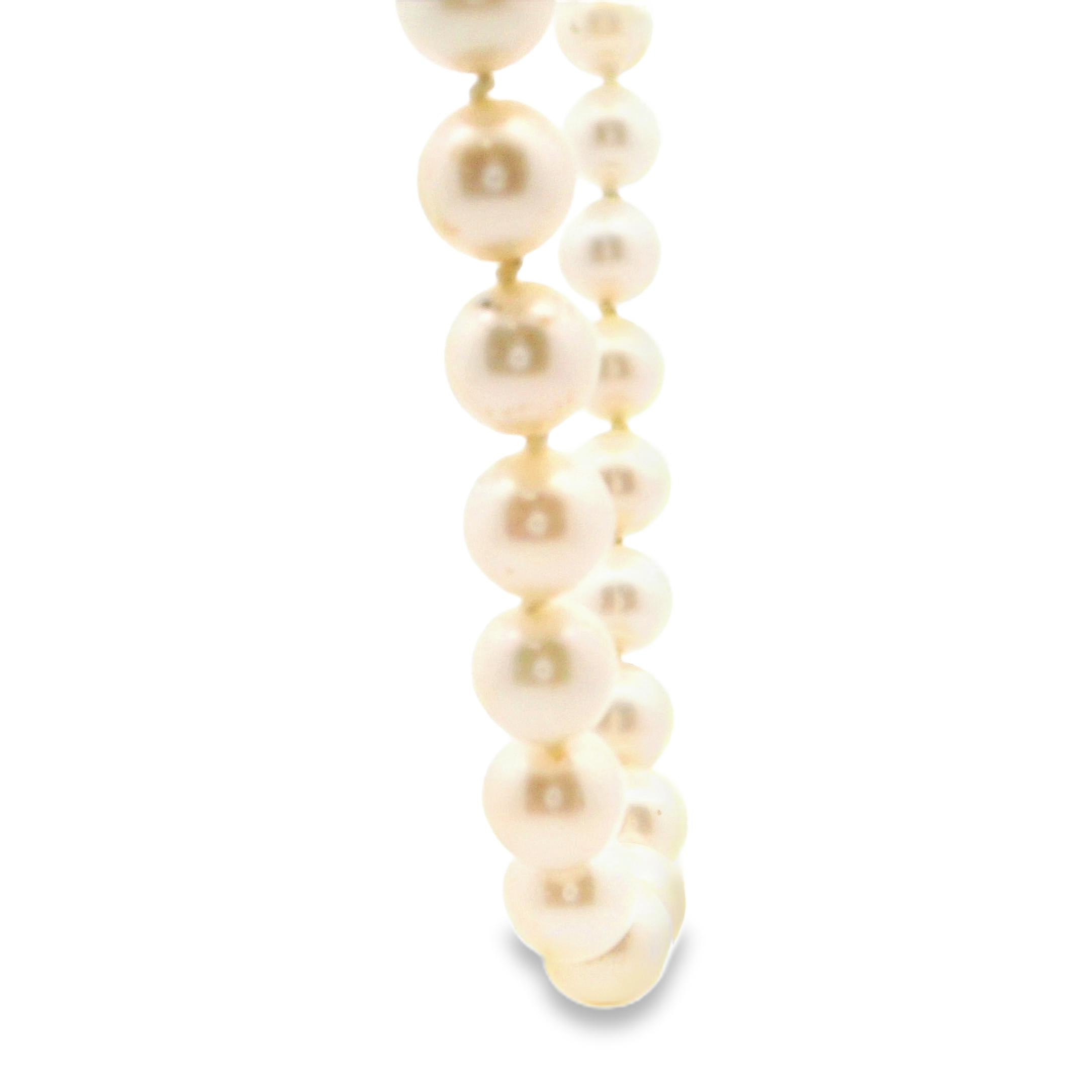 This estate necklace is a Blue Lagoon by Mikimoto 24" long pearl necklace. The pearls are 6.0-6.5mm round cultured akoya pearls. It is strung onto a 14k yellow gold ribbed pearl clasp,