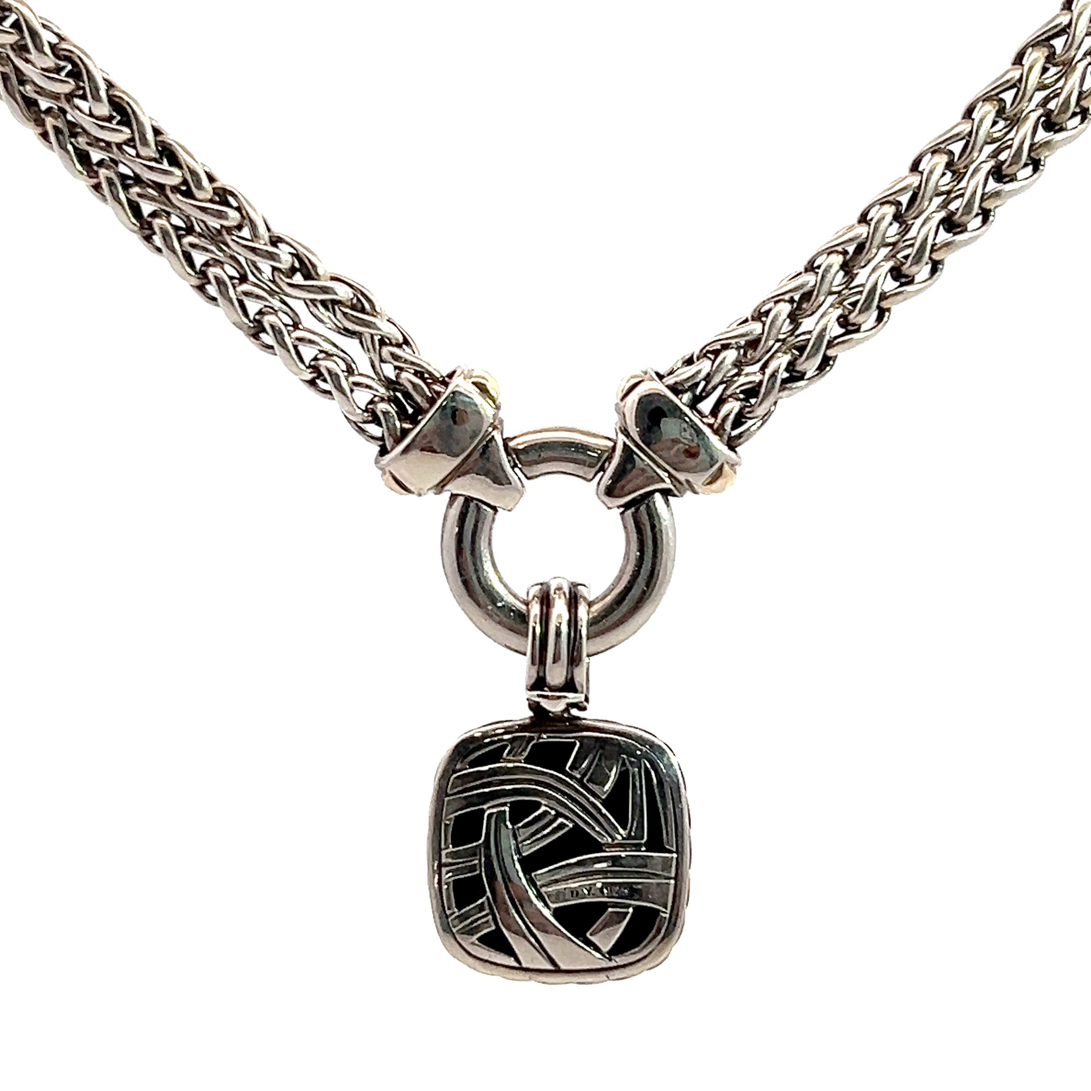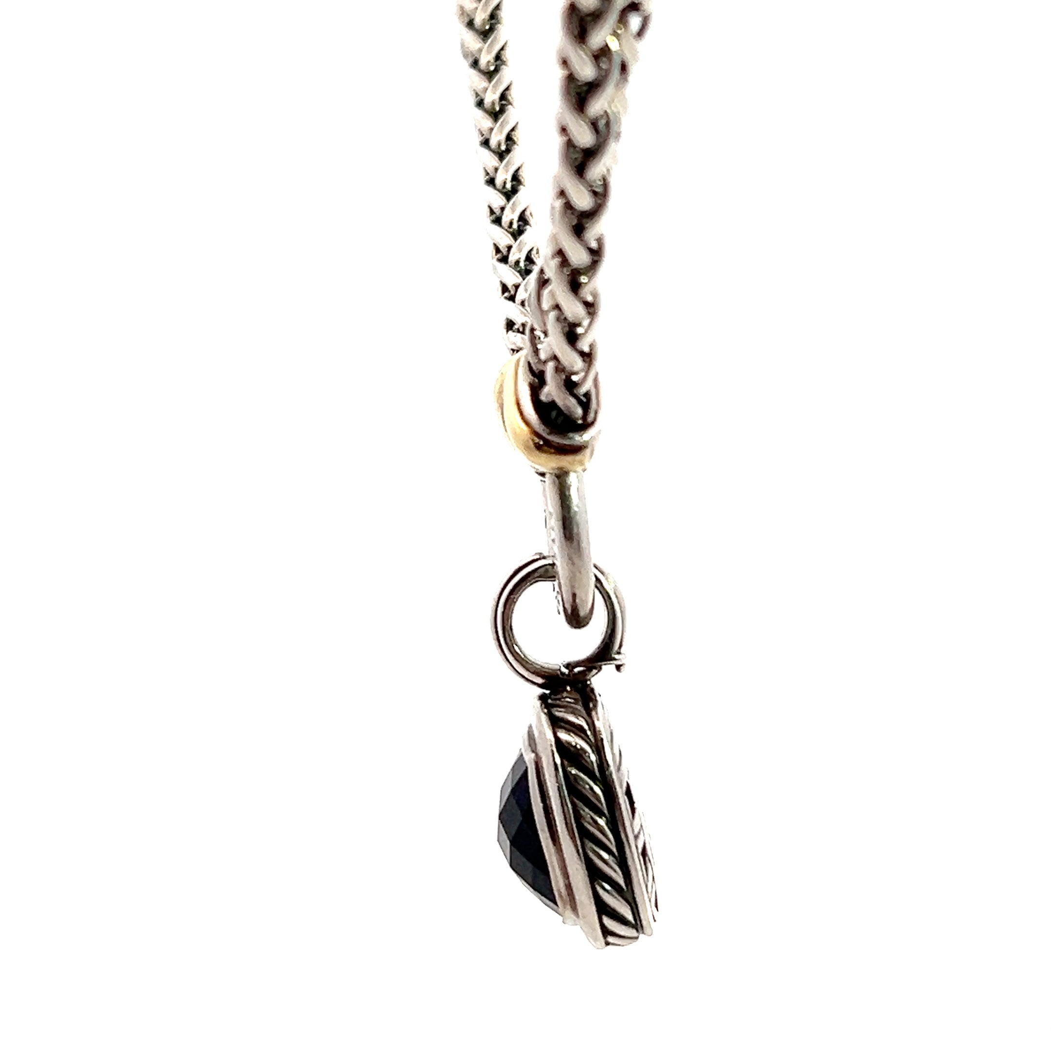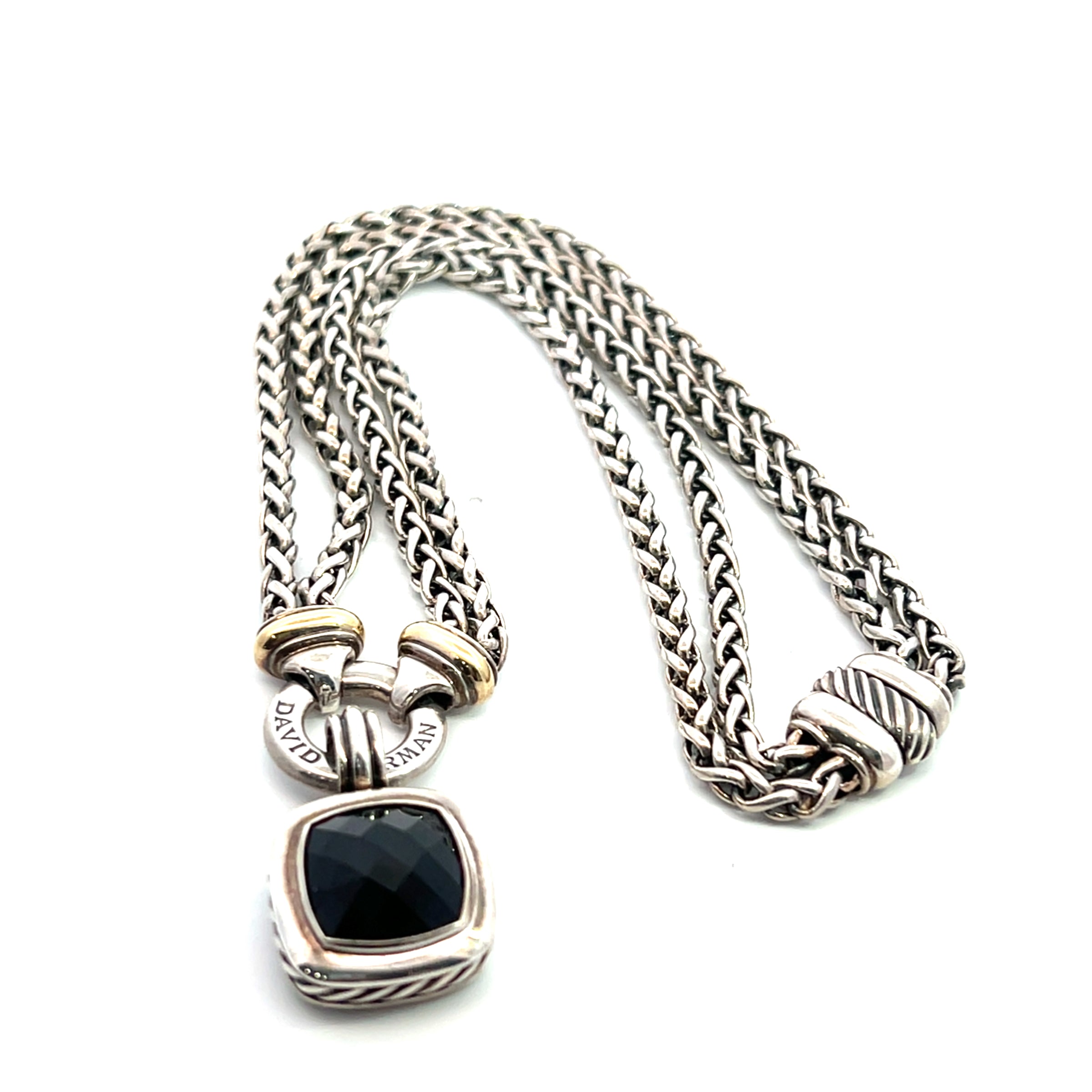 This estate necklace is a David Yurman double wheat style chain with a locking clasp, sterling silver with 18k yellow gold detailing and 16" long. The pendant is a black onyx 15mm Albion enhancer pendant that can unattach if desired.