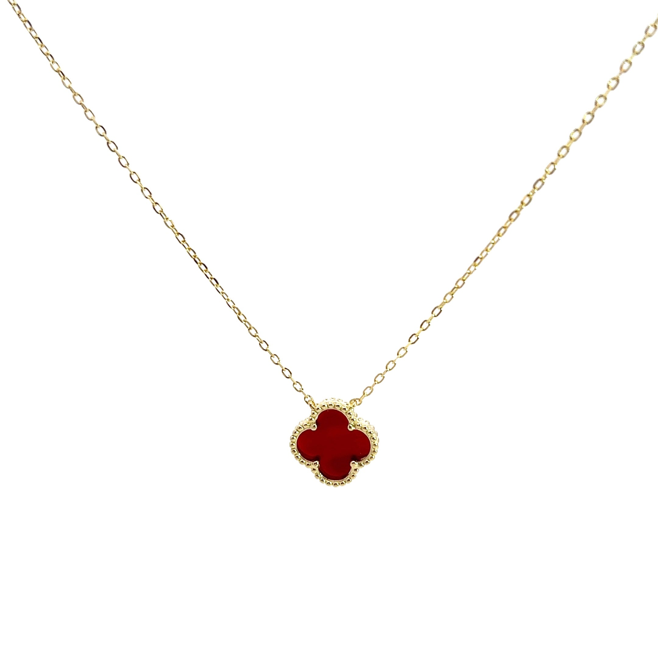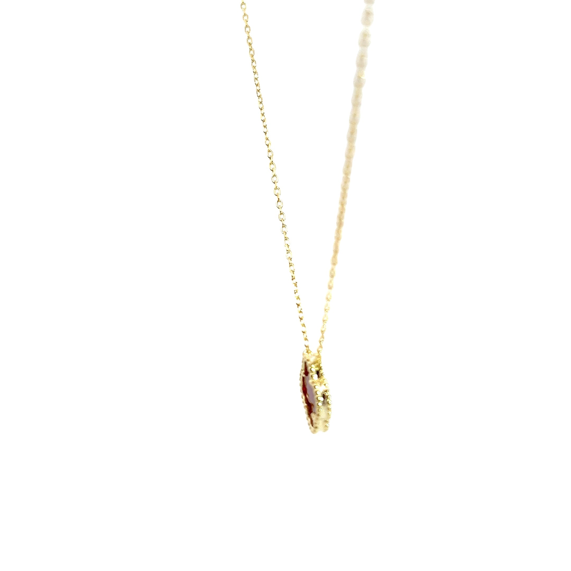 This gorgeous necklace is a sterling silver gold plated necklace with clover shaped center in a carnelian gemstone cutout. The bezel around the stone has beaded details. It is set on a chain that is adjustable from 16-18" in length.