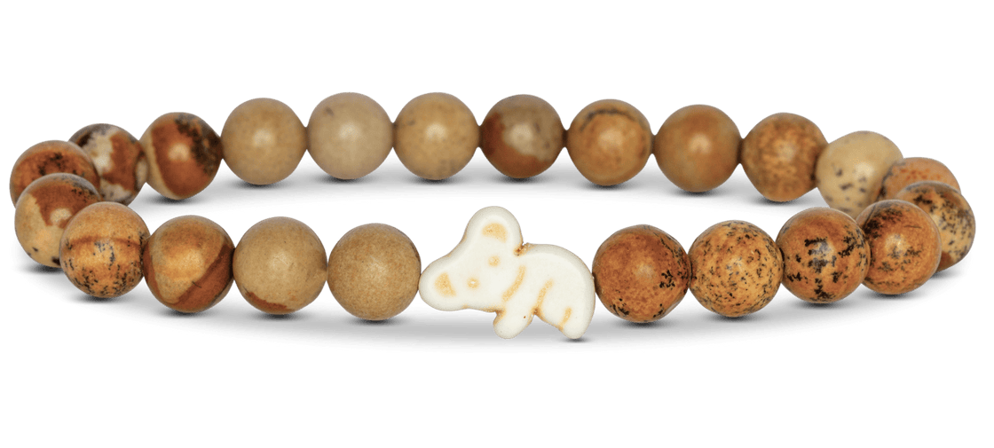This stretch Fahlo bracelet in dune stone with koala center detail comes with it's own real live koala to track!