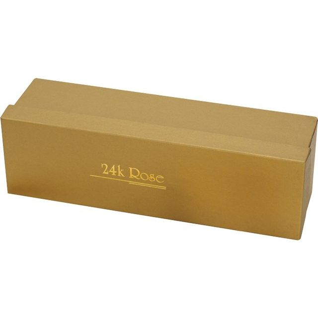 Real semi-opened rose petals dipped in 24kt gold plating. Stems are approximately 12". Each rose is elegantly wrapped in gold tissue and packaged in a gold, two-piece outer box.