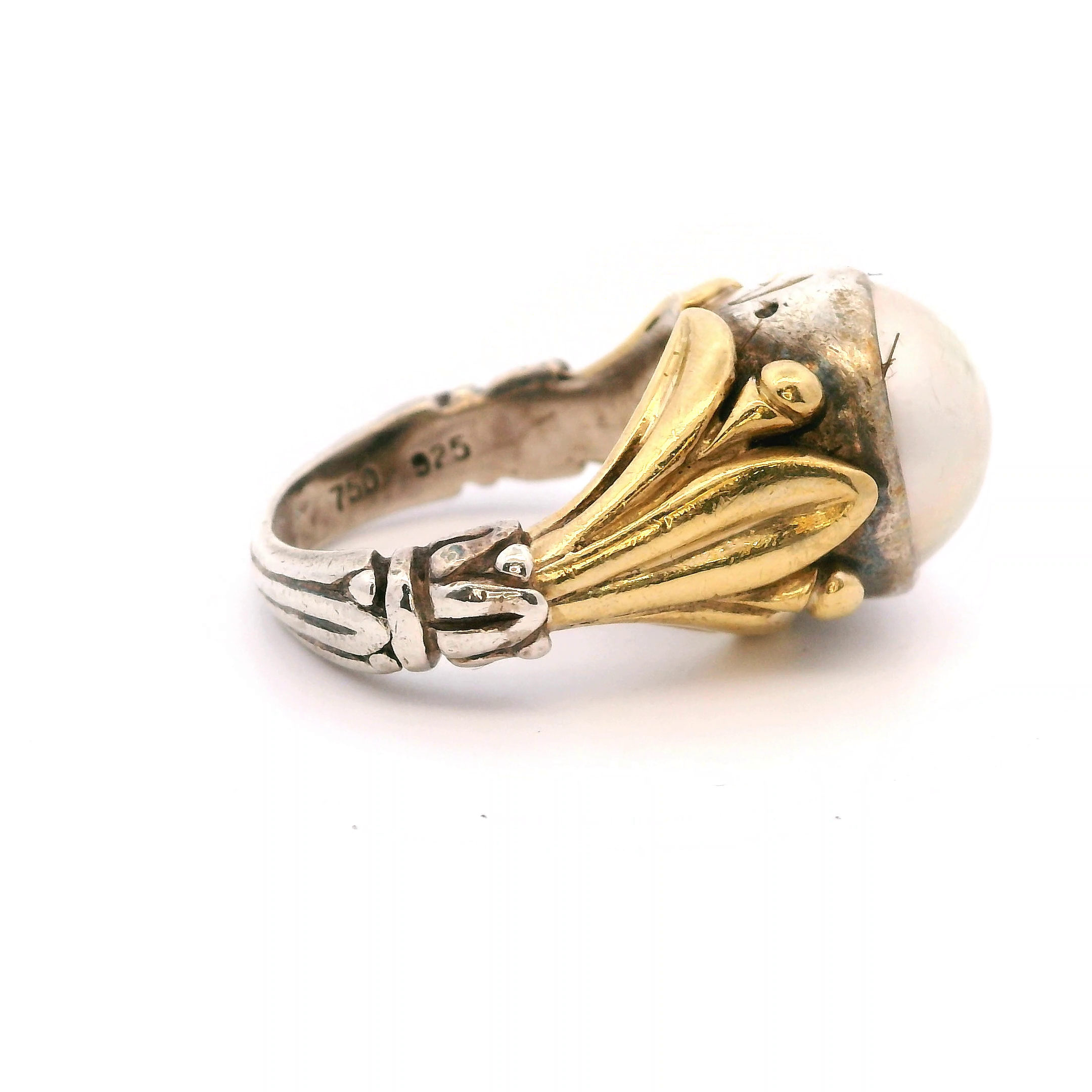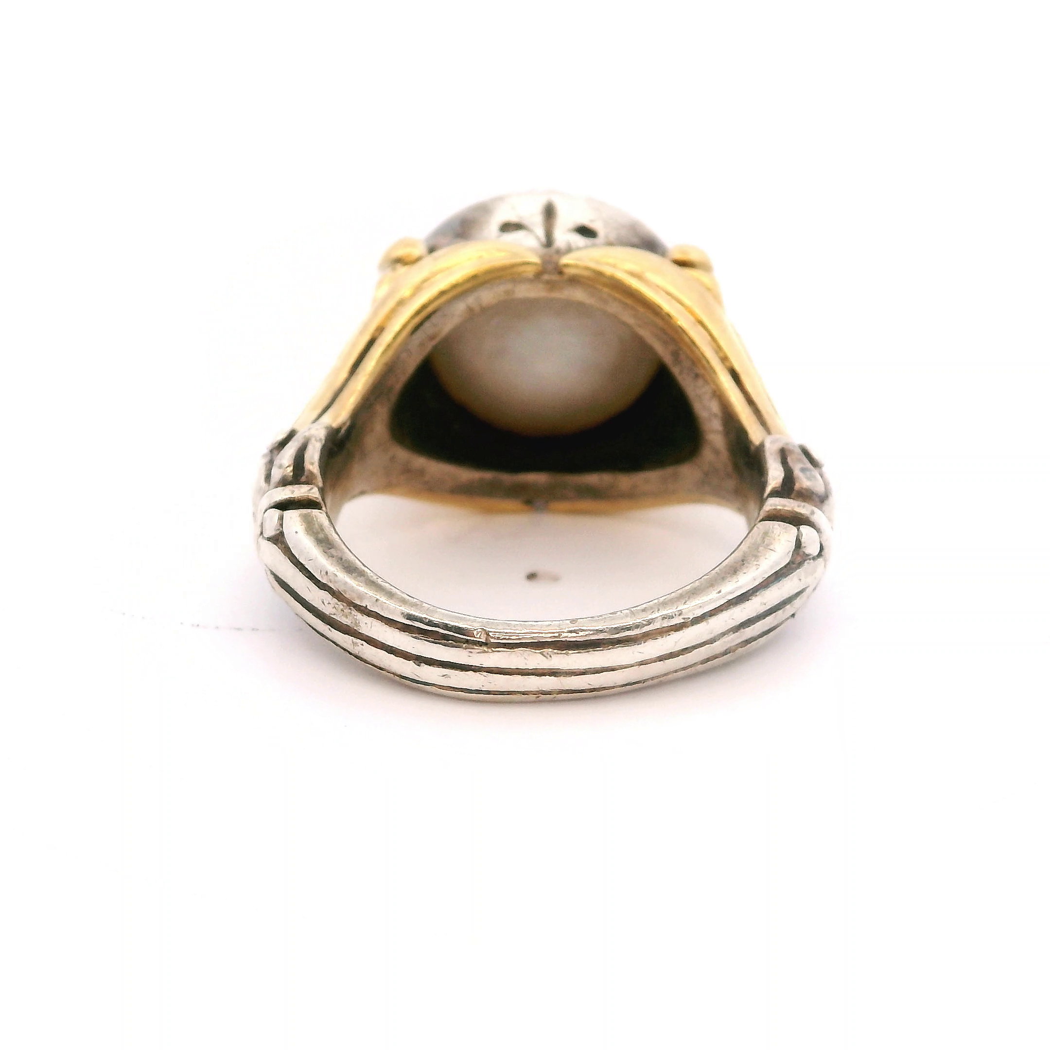 This is a Lagos Caviar designer ring: sterling silver with 18K yellow gold and a 12mm mabe pearl set in the center. Size 7