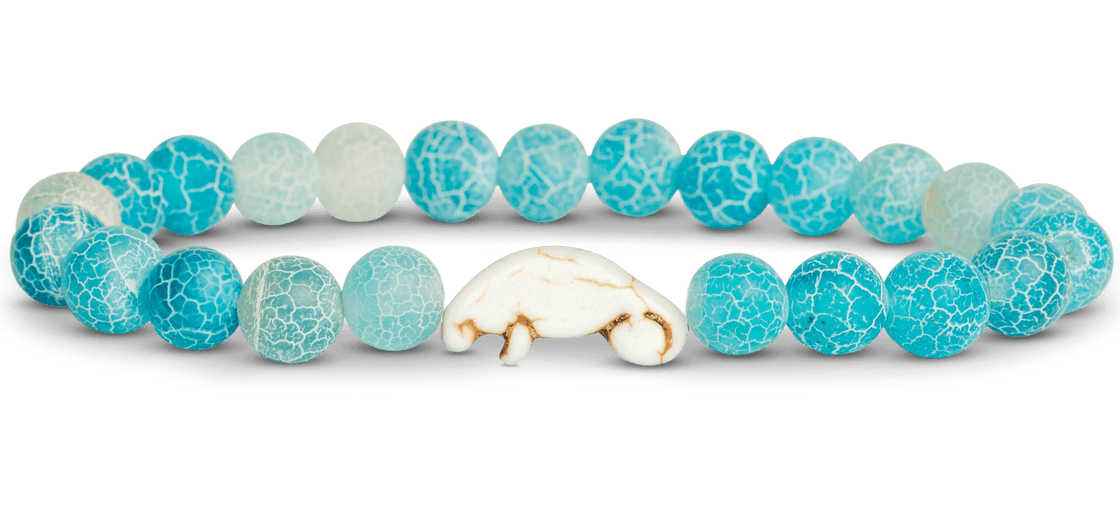 This stretch Fahlo bracelet in aqua blue with manatee center detail comes with it's own real live manatee to track!