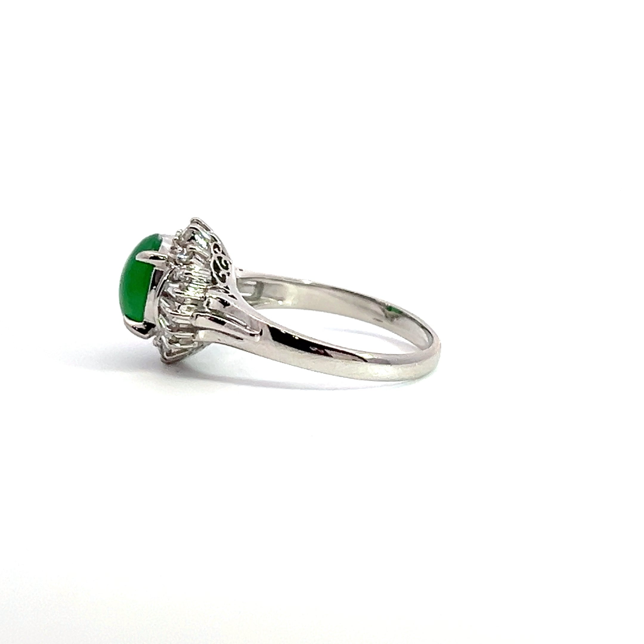 This gorgeous ring is a platinum ring with a beautiful green jade set in the center. There is a ballerina style halo going around the jade with a mix of round and baguette cut diamonds. They total 0.34 CT TW. It is a size 5.5