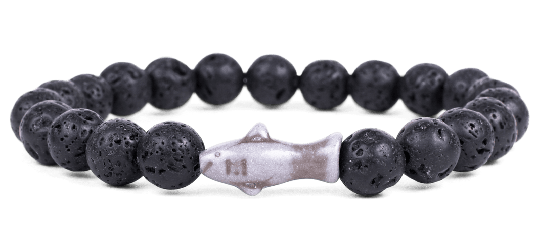 This bracelet is made of black lava stone beads with an shark center. The bracelet comes with your own real shark to track!