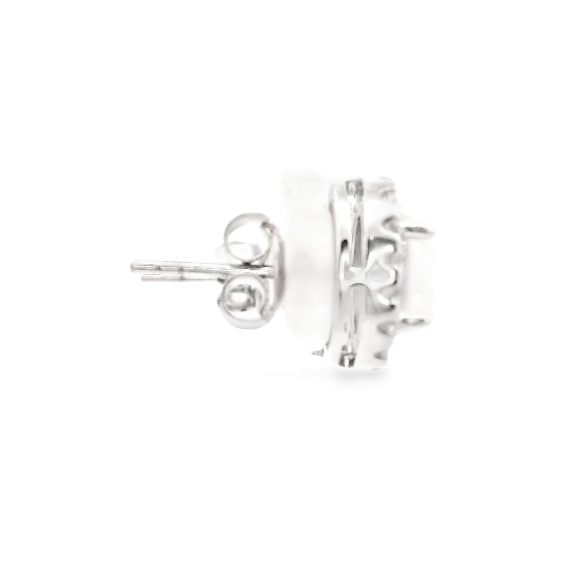 These earrings are sterling silver halo earrings with 2 oval synthetic opals prong set with a halo of lab created white sapphires set in a halo around the opals in each ear.