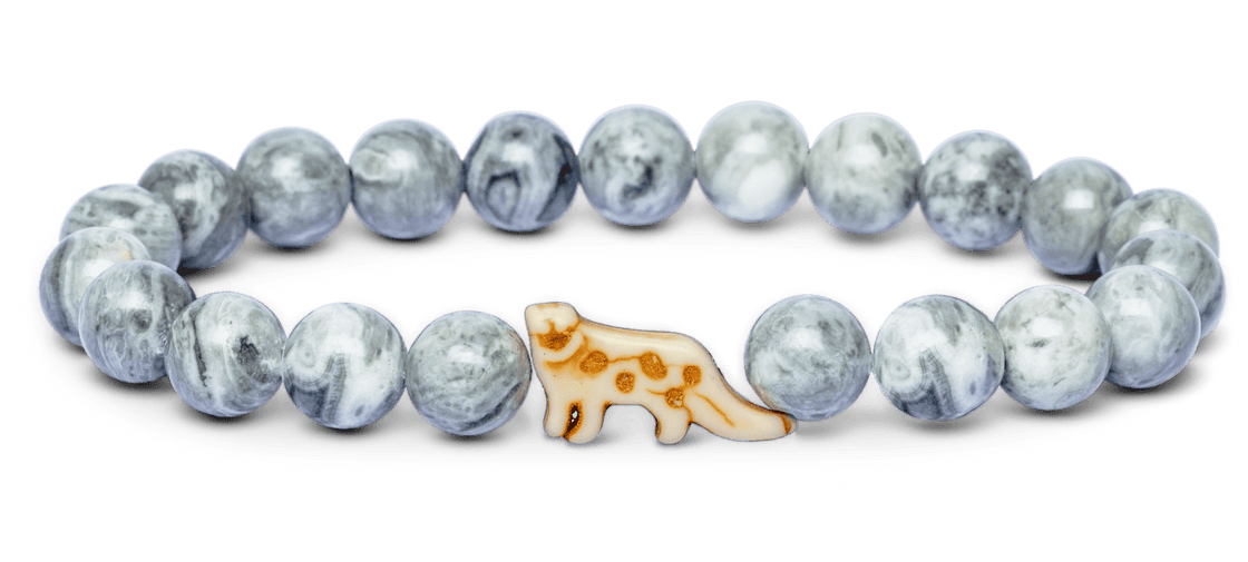 This bracelet is made of grey alpine beads with a snow leopard center. The bracelet comes with your own real snow leopard to track!