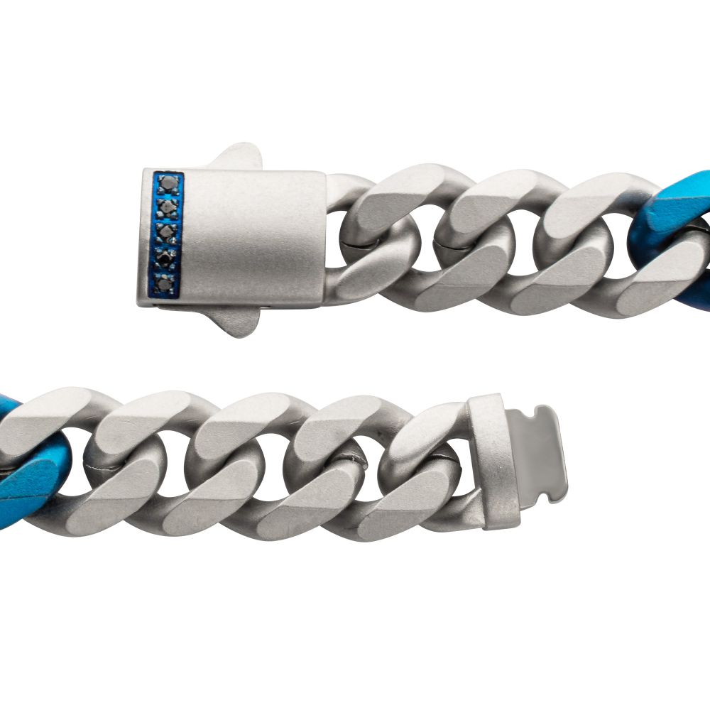 Men's OCEAN STEED: Matte Finish Steel Beveled Cuban with Two Blue IP Links & Black Sapphire Chain Bracelet. 8"