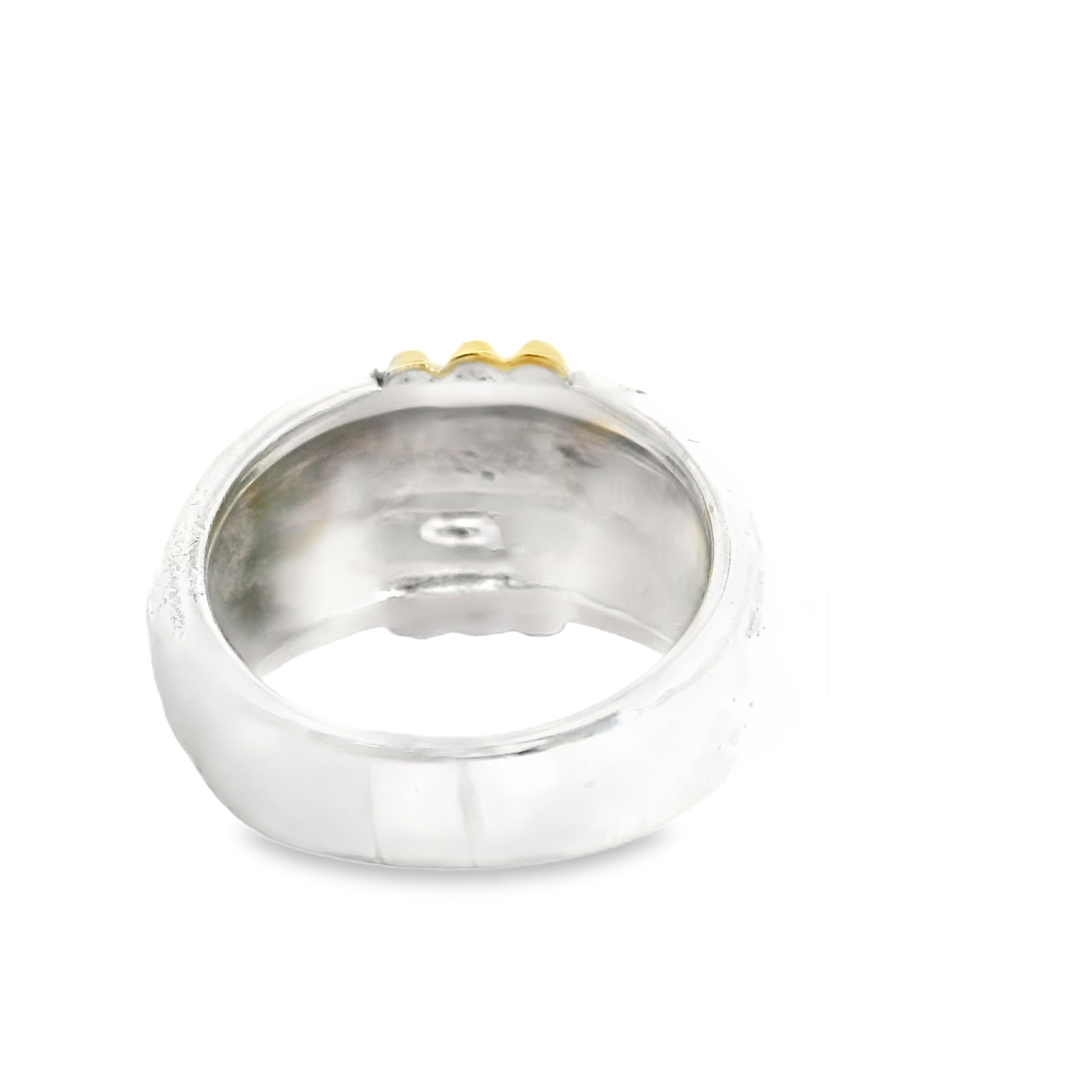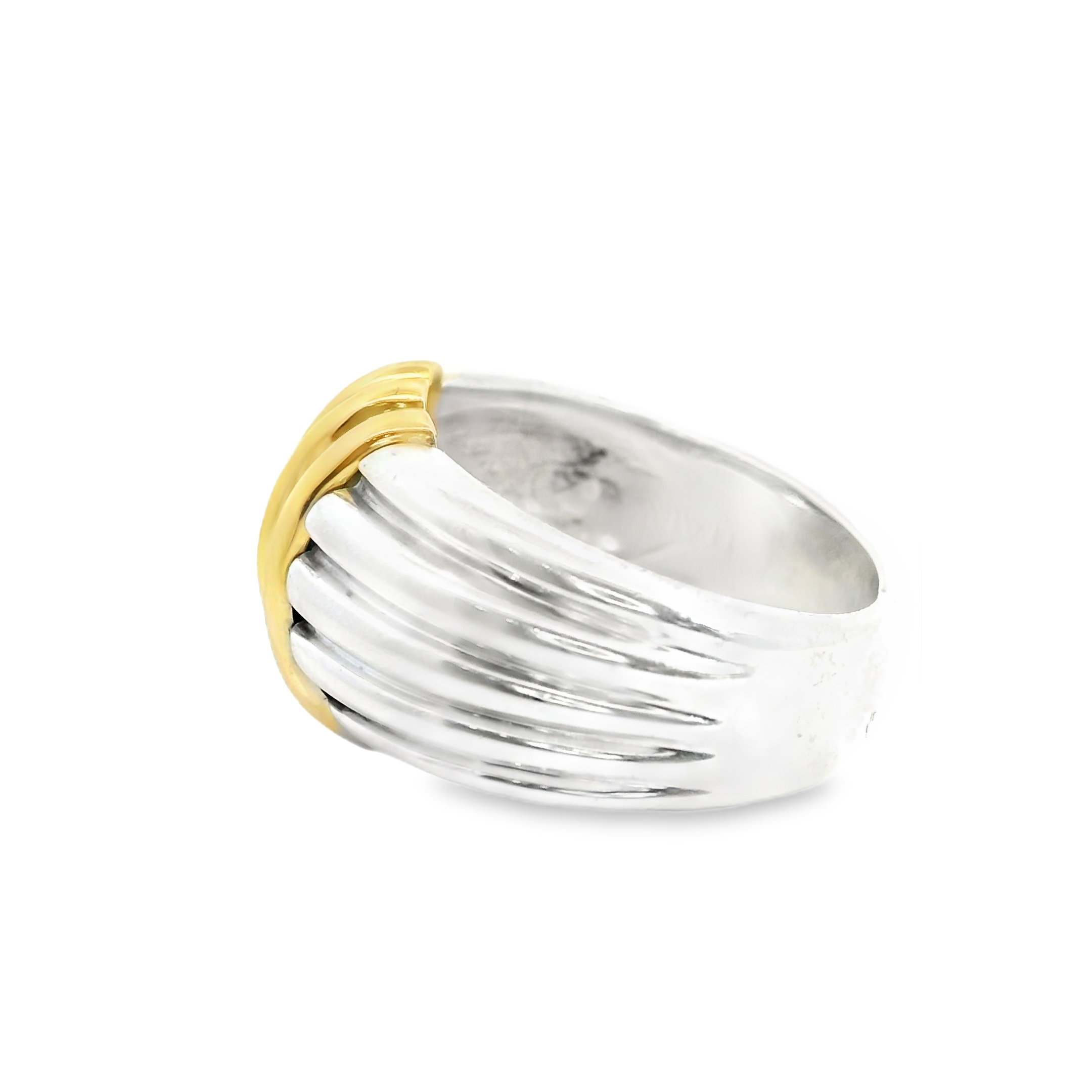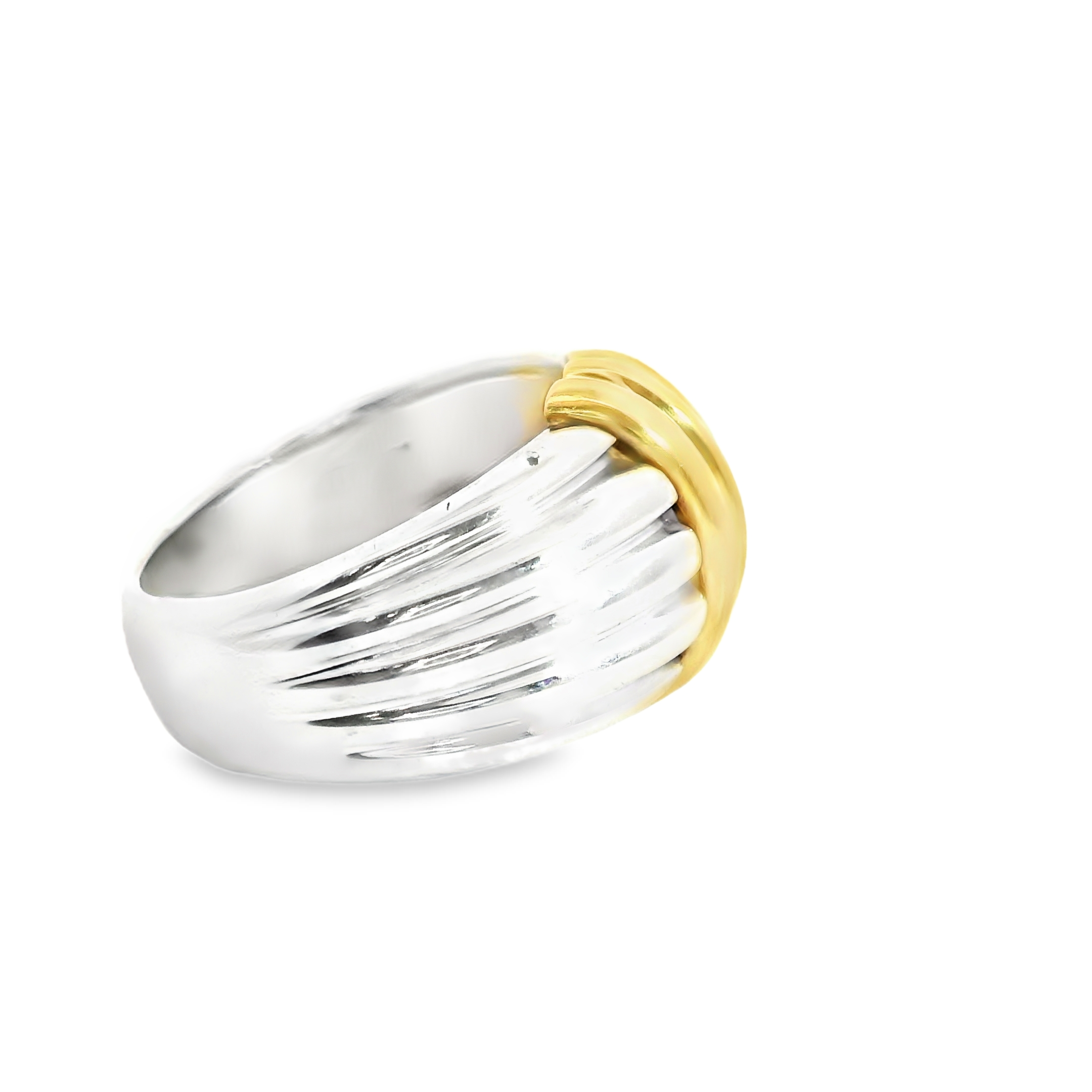 This estate ring is a sterling silver dome style band with grooved detail. THe center detail is 18k yellow gold. The ring is a size 7