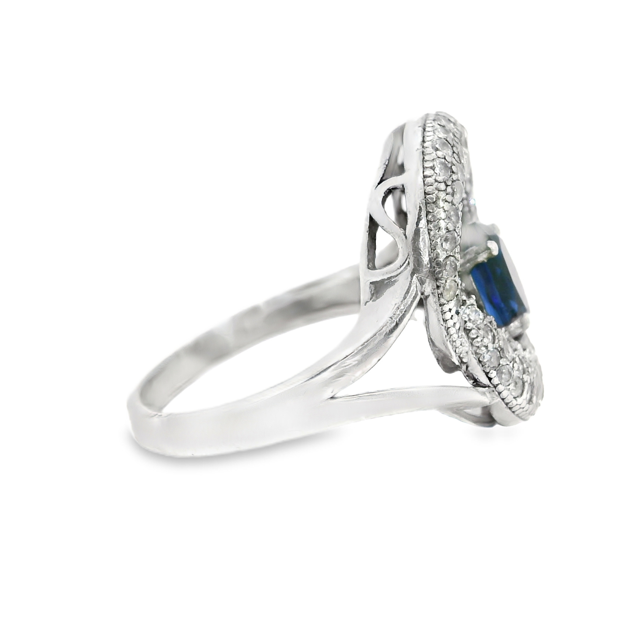 This estate ring is a sterling silver ring with an oval blue CZ set in the center with pave set CZ's set aound the outside of the center. It is a size 7