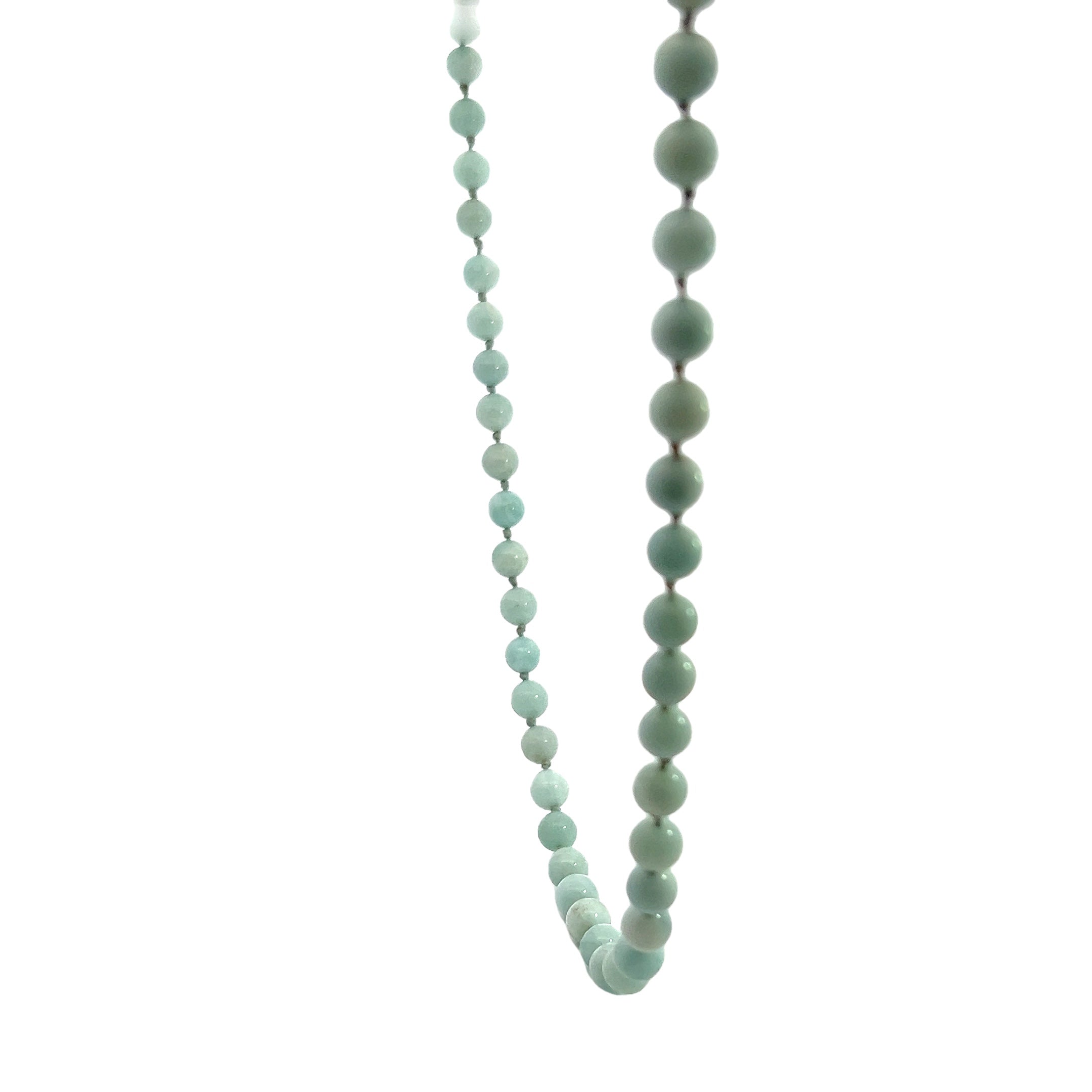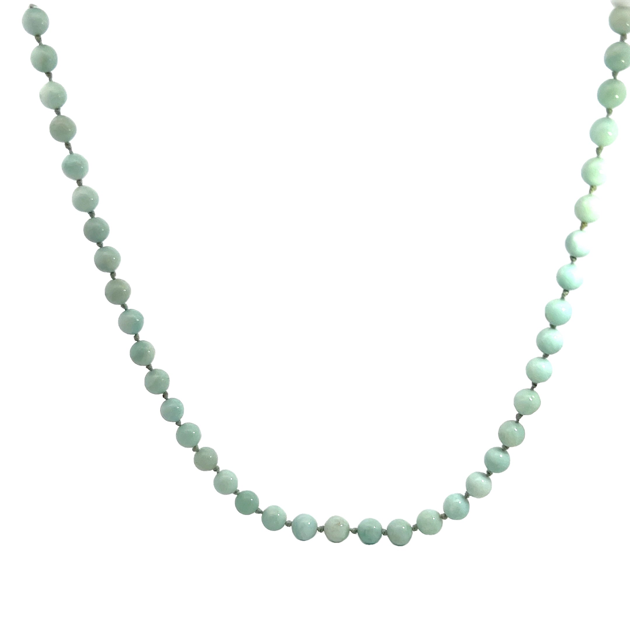 This necklace is a 24" long chalcedony bead necklace with the gems strung onto a blue strand, knotted throughout. It is strung with a sterling silver lobster clasp.