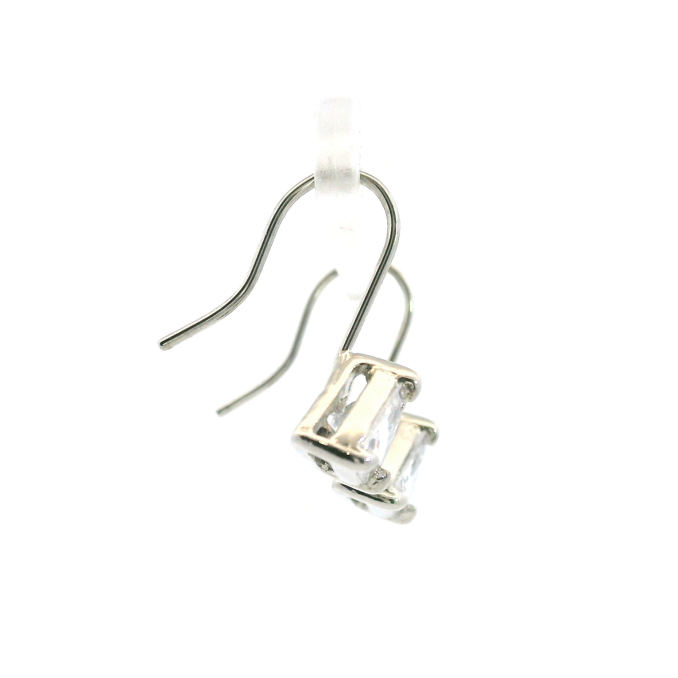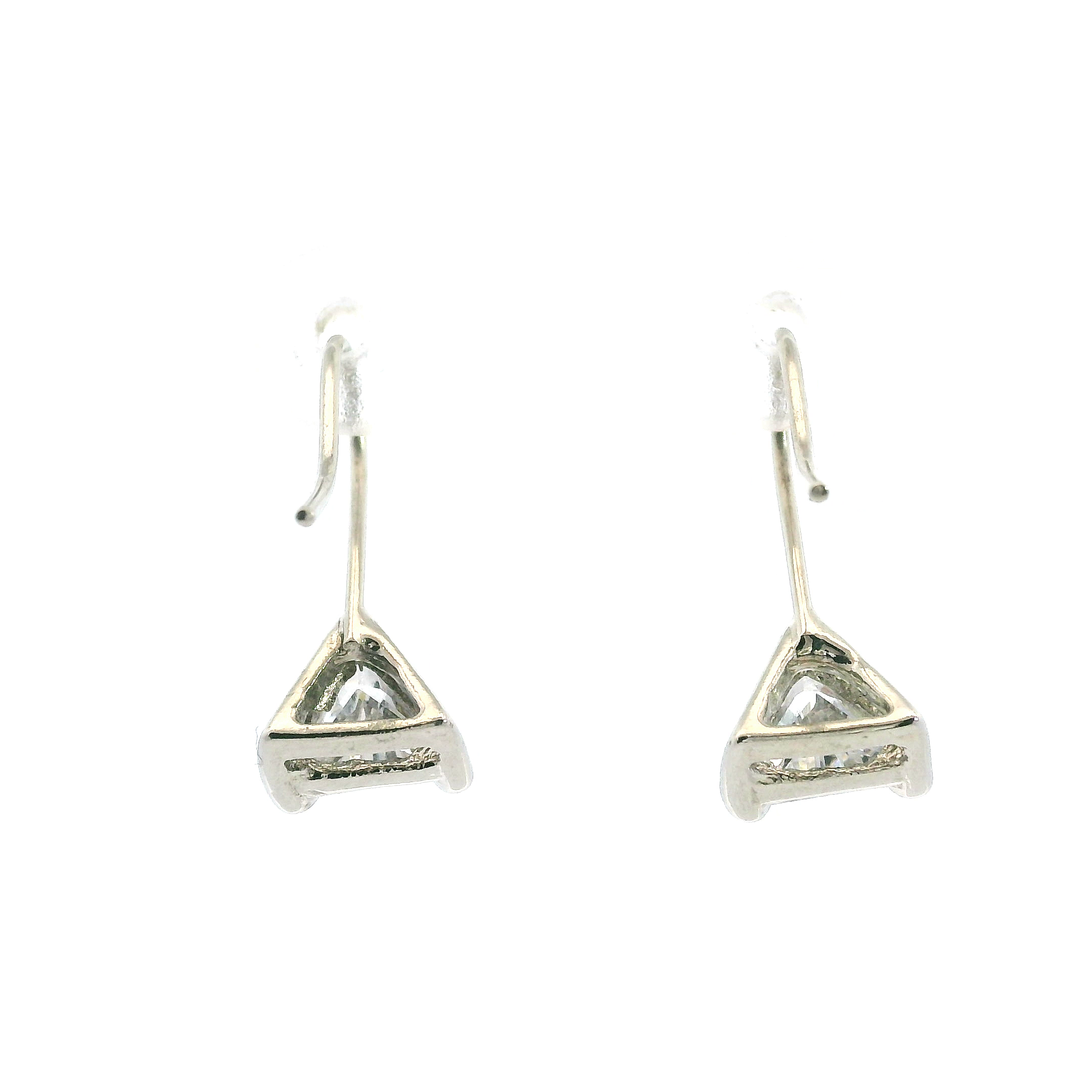This pair of estate sterling silver earrings have a triangle cut CZ set at the bottom of each silver ear wire.