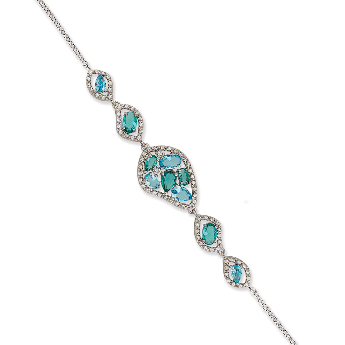 Silver Free Form Dangle Design Bracelet with Clear CZ and Multi Colored Pear and Oval Shape Blue and Green Glass 6.5"+1.5" Extender