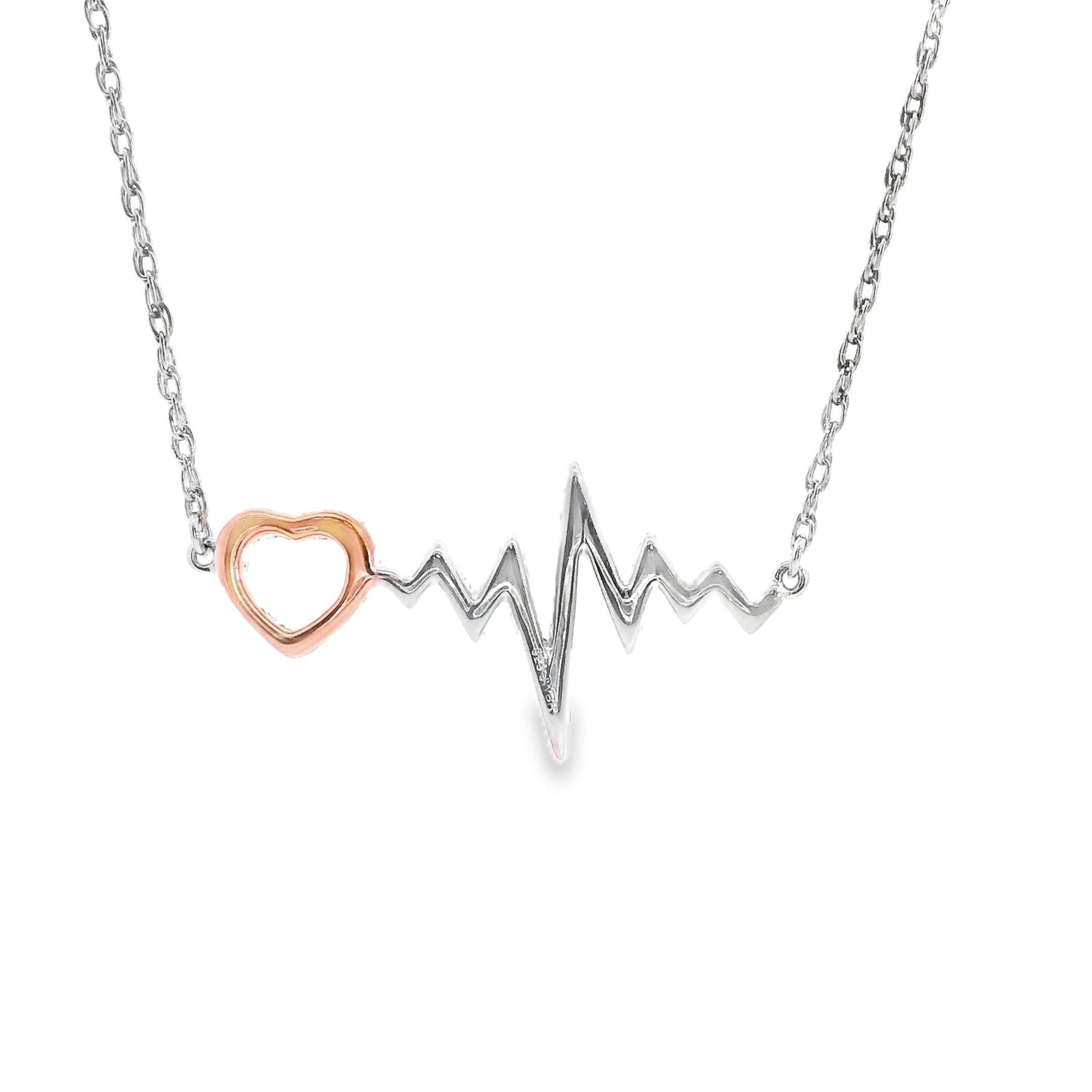This necklace is sterling silver with a heartbeat center pendant: the heartbeat is encrusted in diamonds with a rose gold plated heart. Diamonds total 0.11 CT TW and the necklace is 18" long