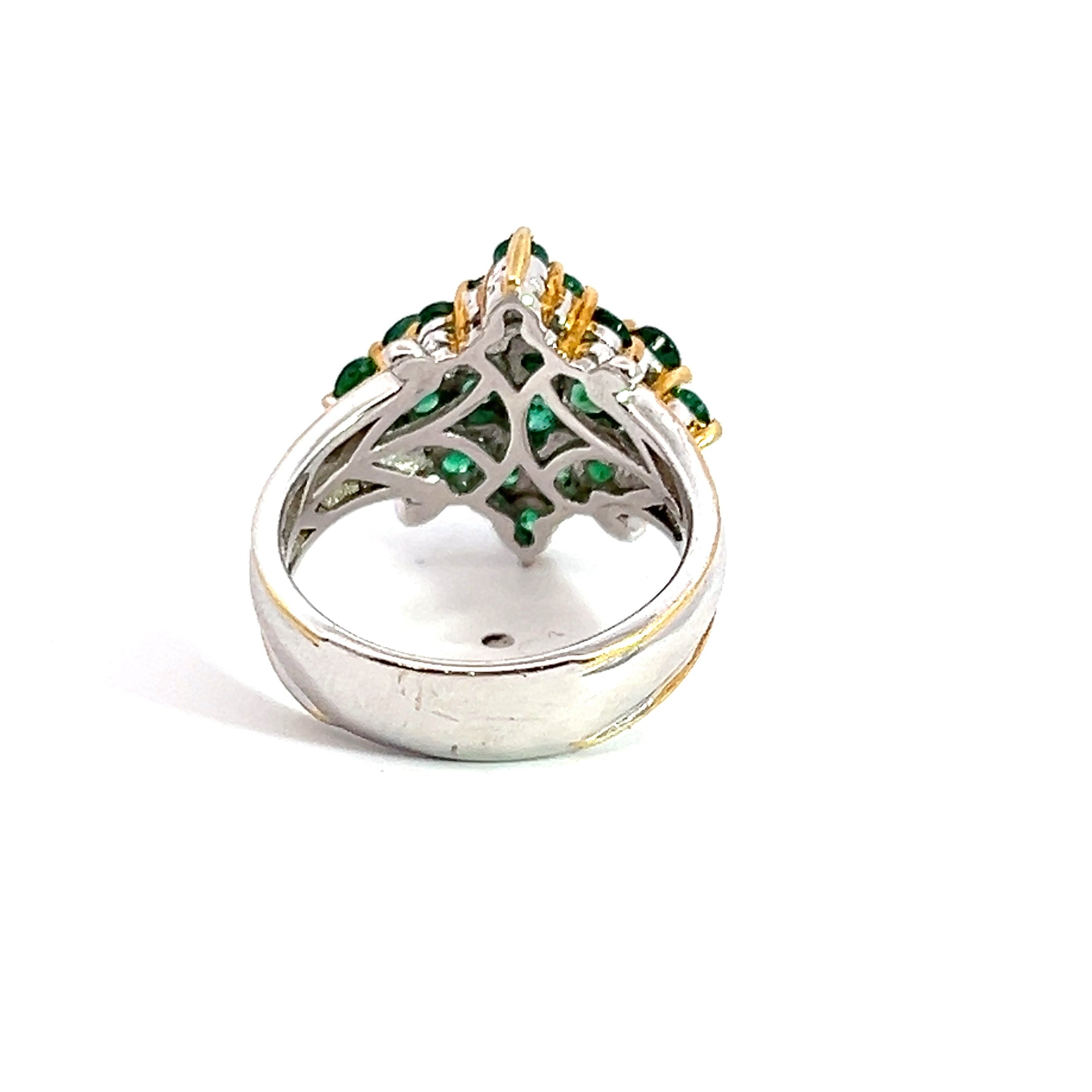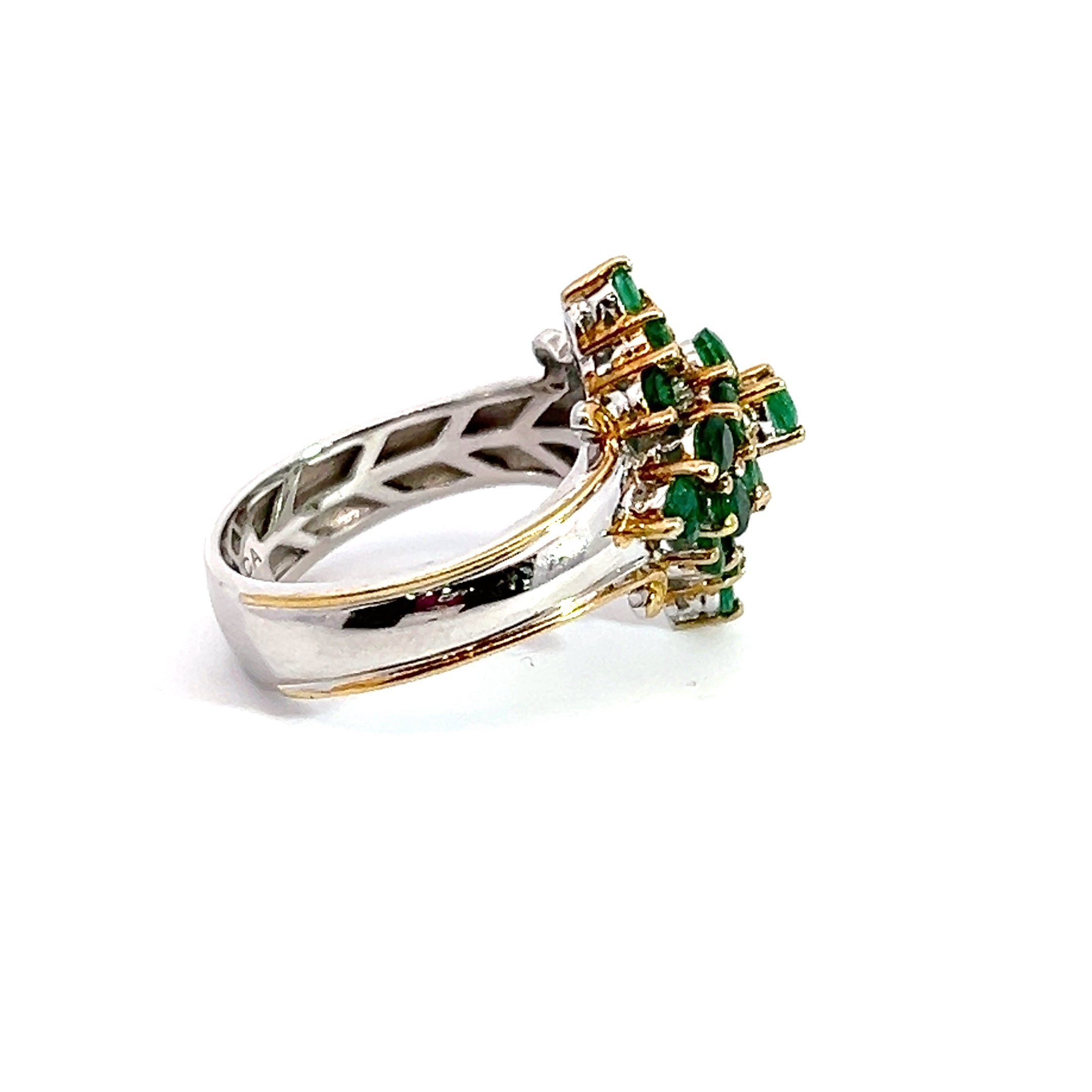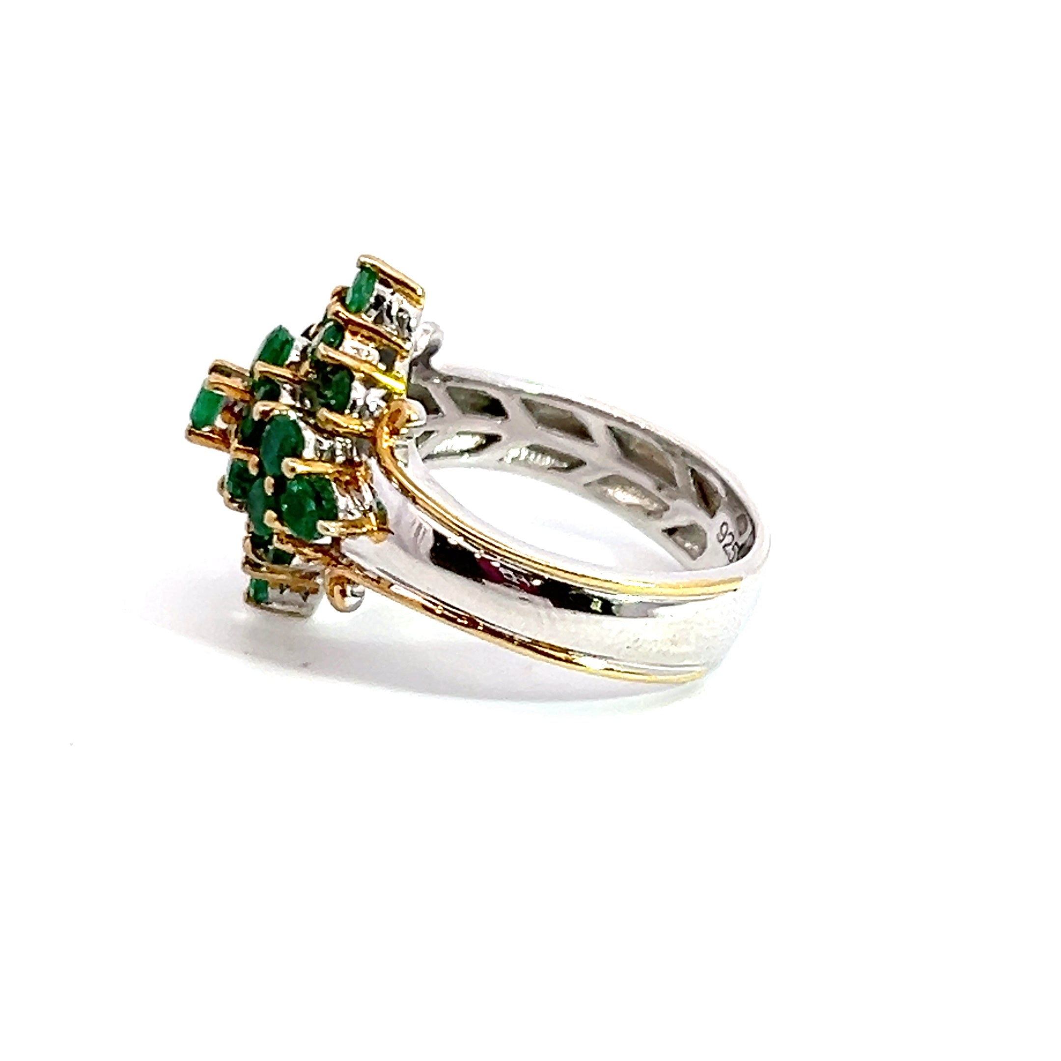 This estate sterling silver ring has a cluster of round emeralds set in the center in a diamond shape. There is yellow gold plating detail around the emeralds and edged of the band. The ring is a size 8