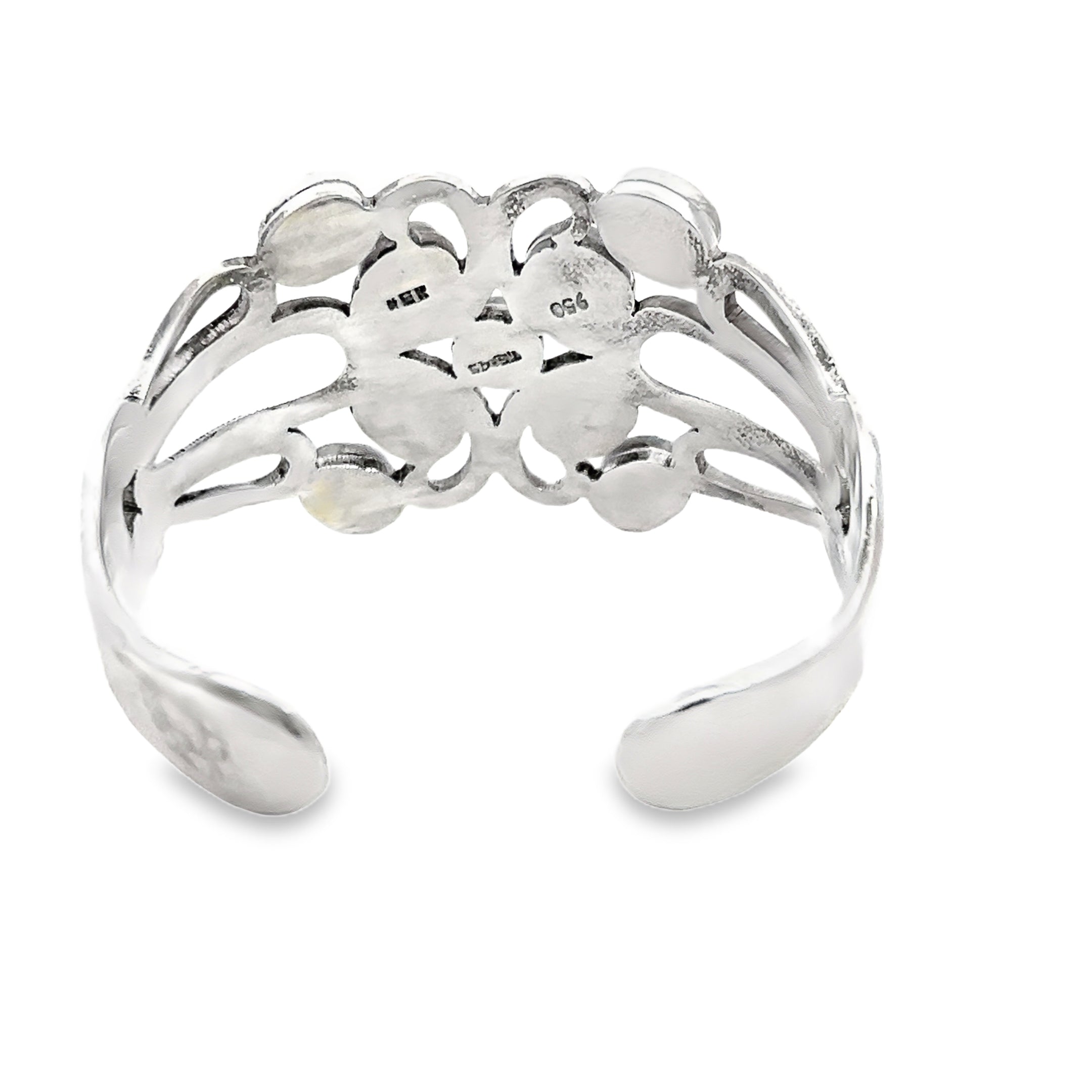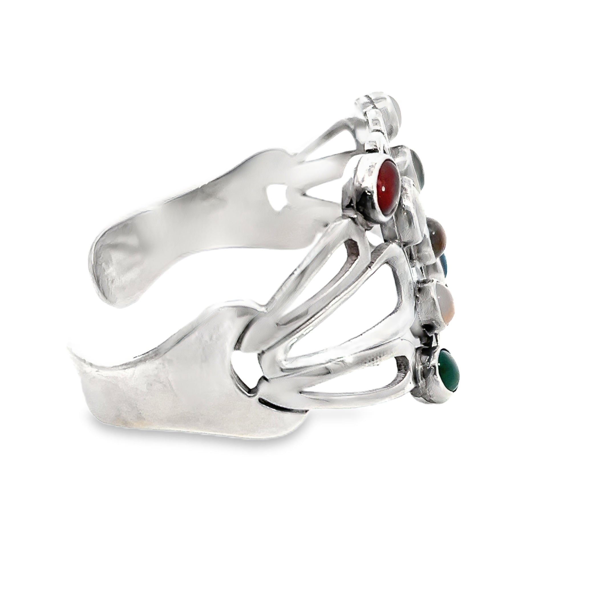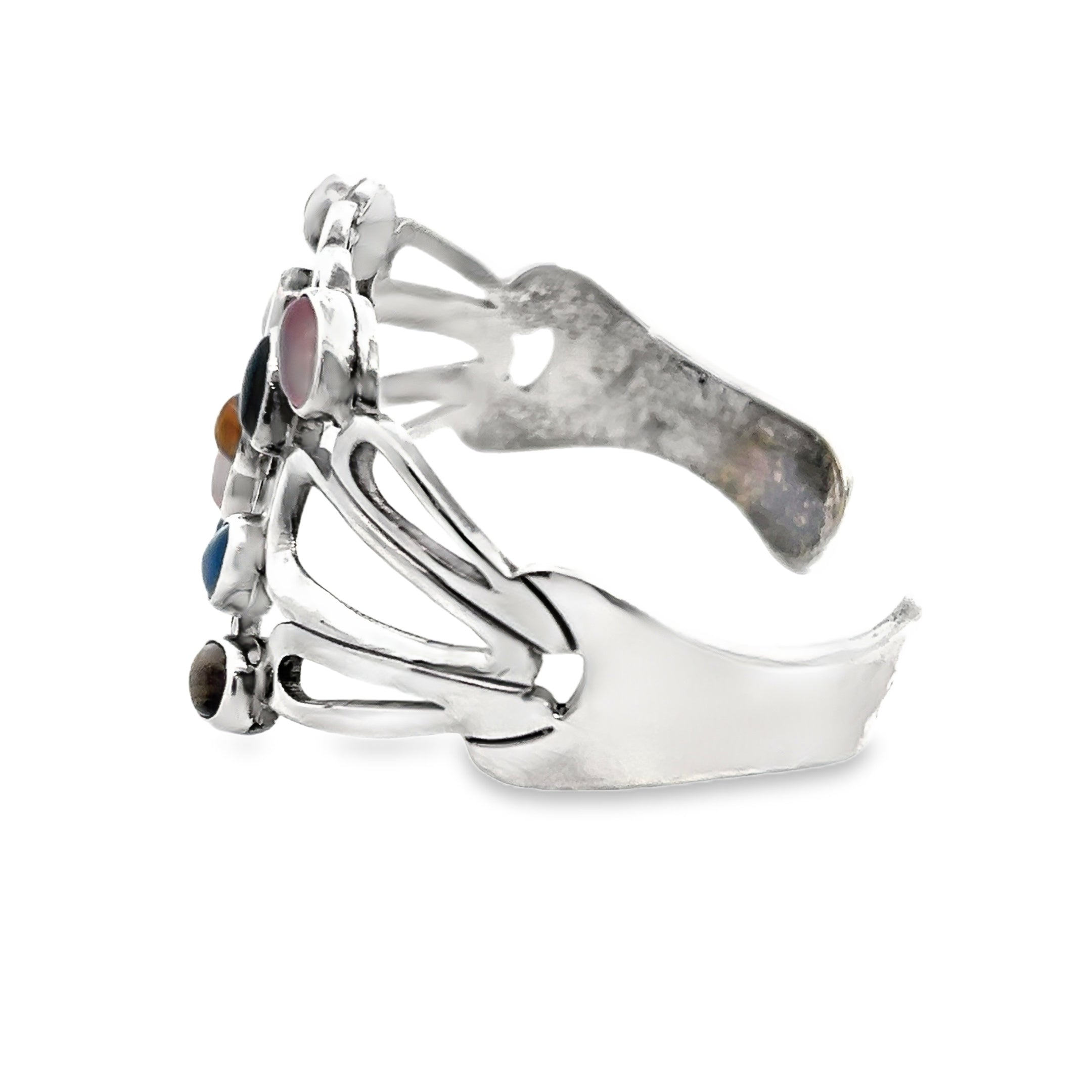 This estate bracelet is a wide sterling silver cuff with bezel set cabochon gemstones set in the center of the bracelet which is 1.25" wide. Tee stones are different quartz and chalcedony varieties.