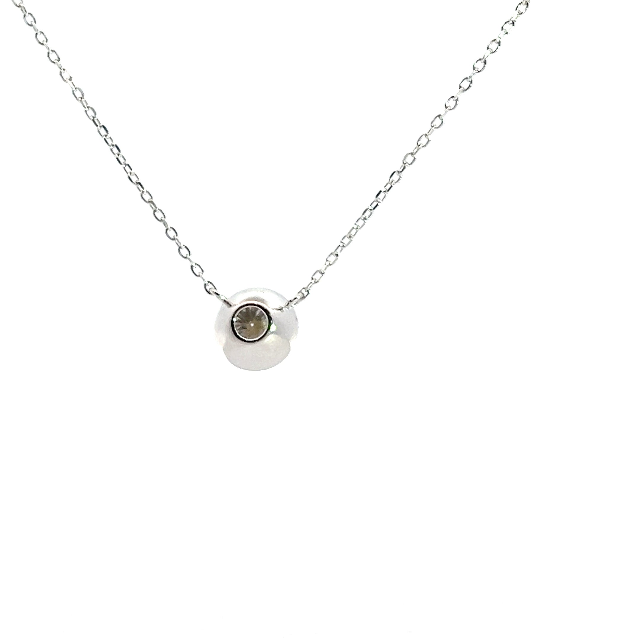 This sterling silver pendant has a2.0 ct moissonite bezel set in the center of a 16-18" adjustable cable link chain.