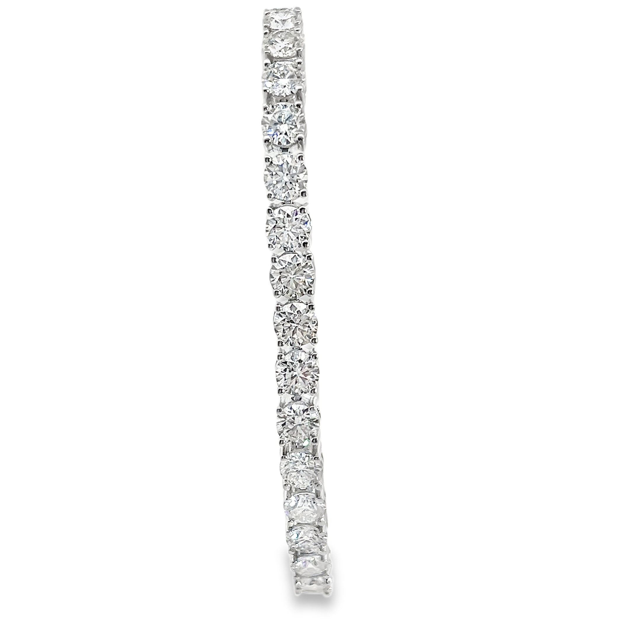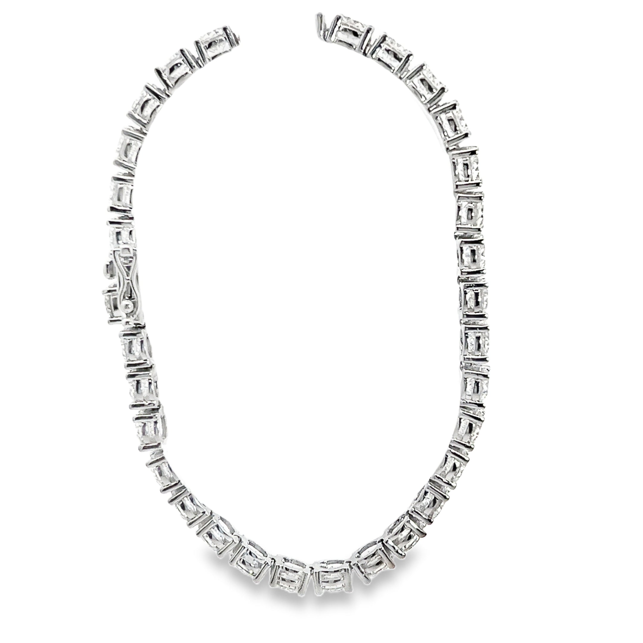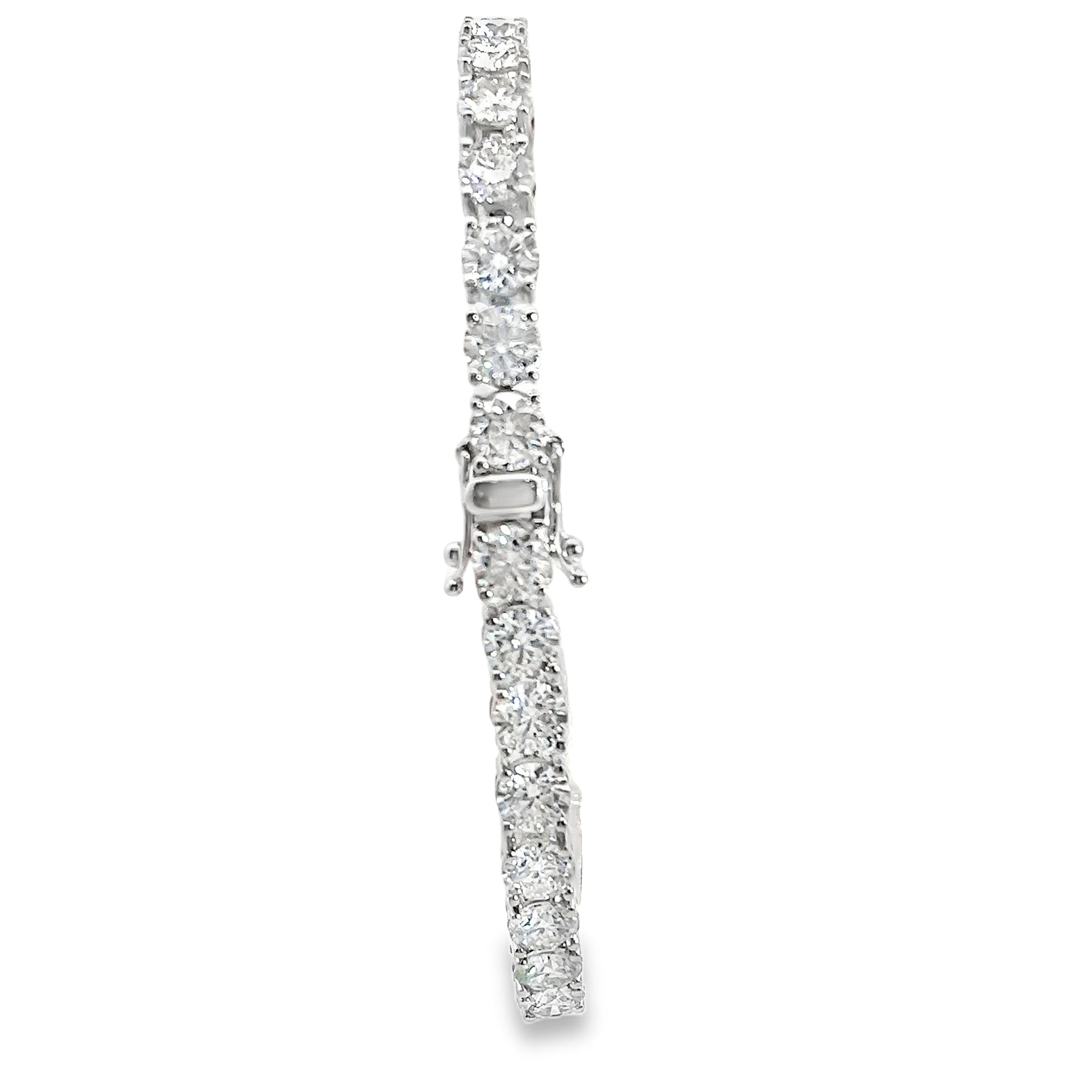 This tennis bracelet is a sterling silver bracelet with miossonite gemstones prong set in the 7" long line style bracelet totaling 15 CT TW