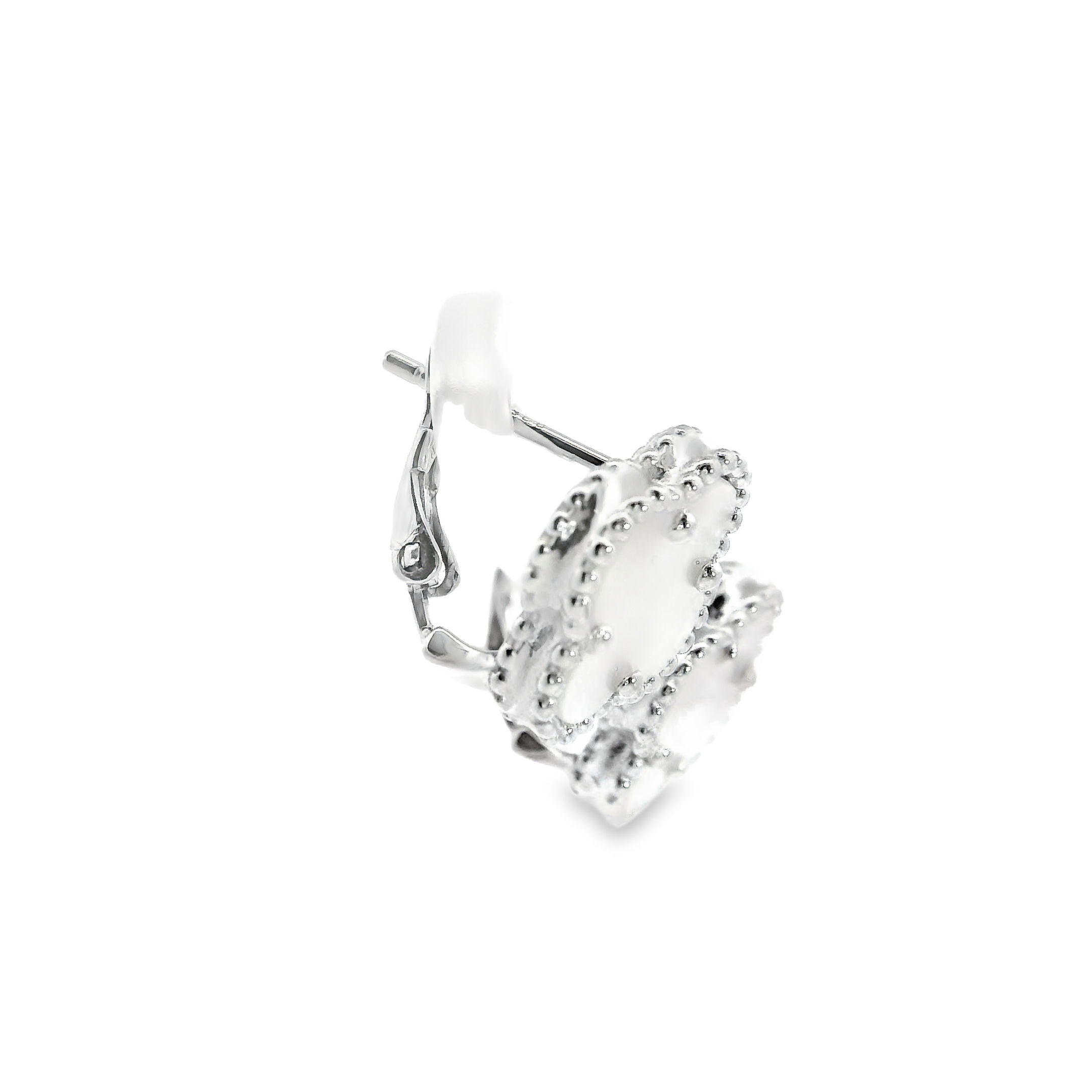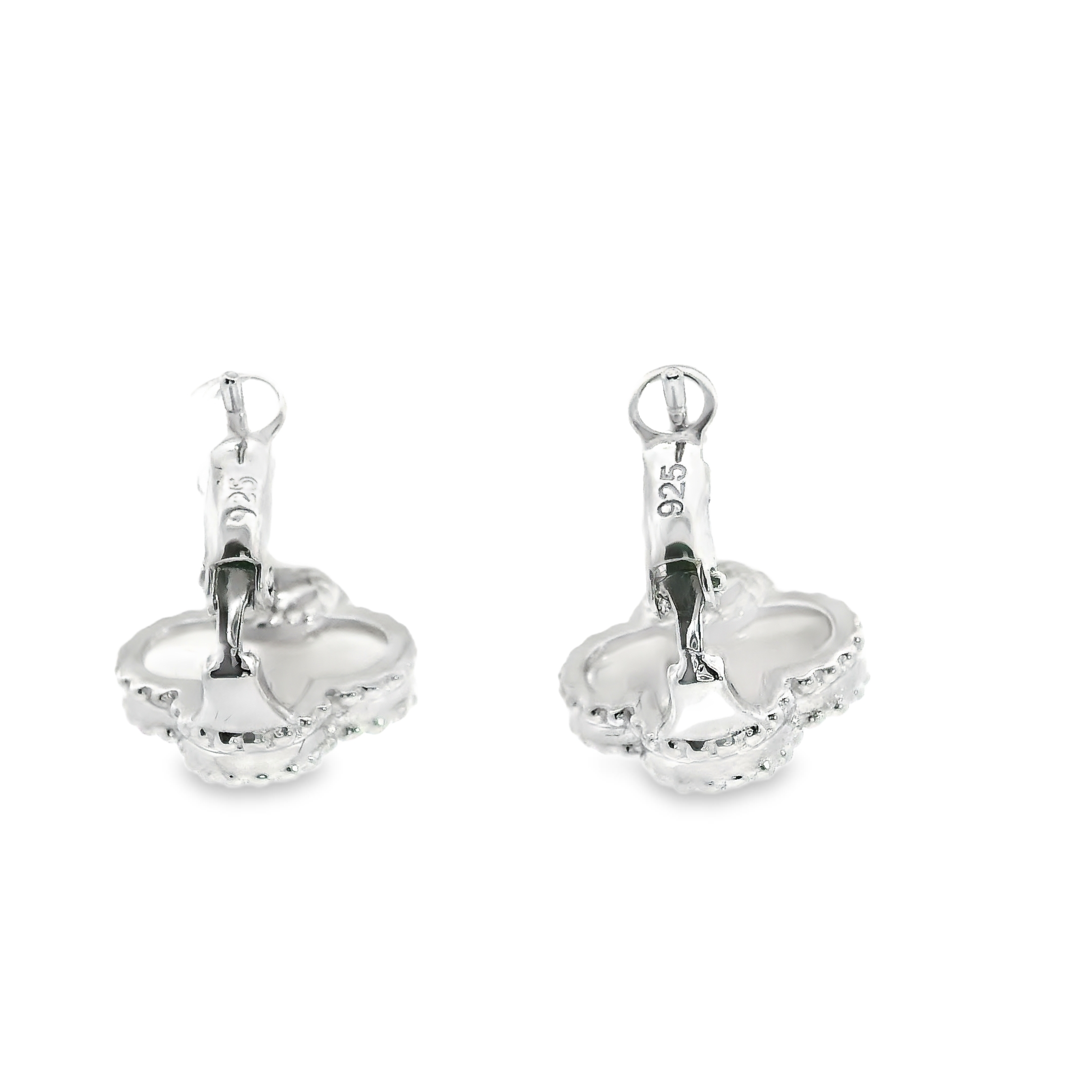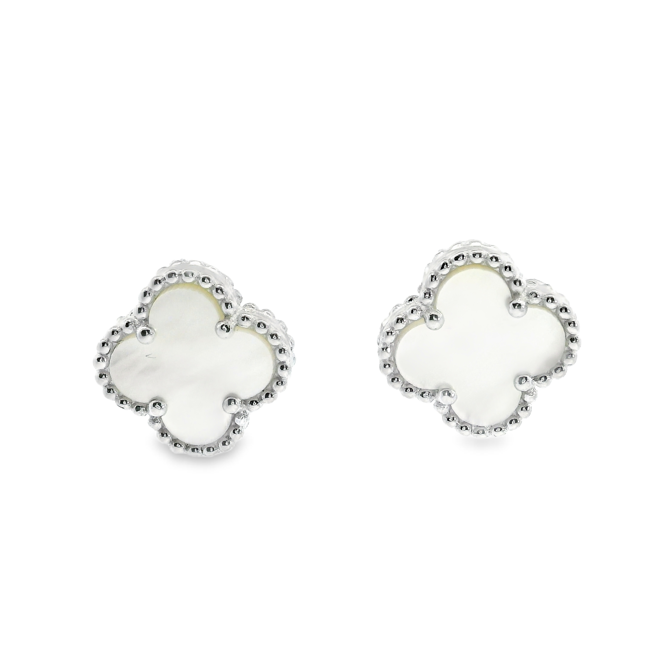 These clover style earrings are sterling silver with clover shaped mother of pearls set in the center of the beaded bezel. They have omega clip style backs.