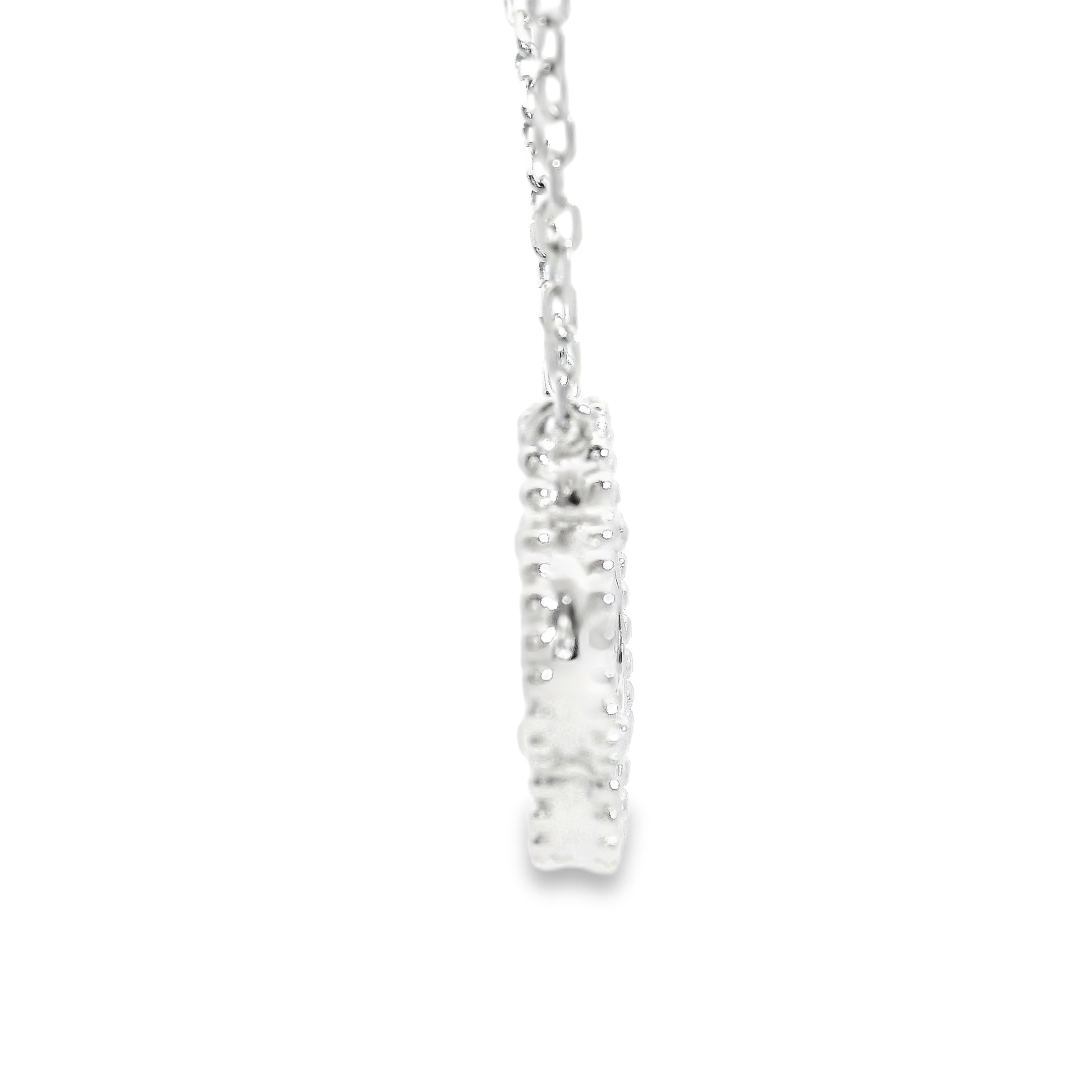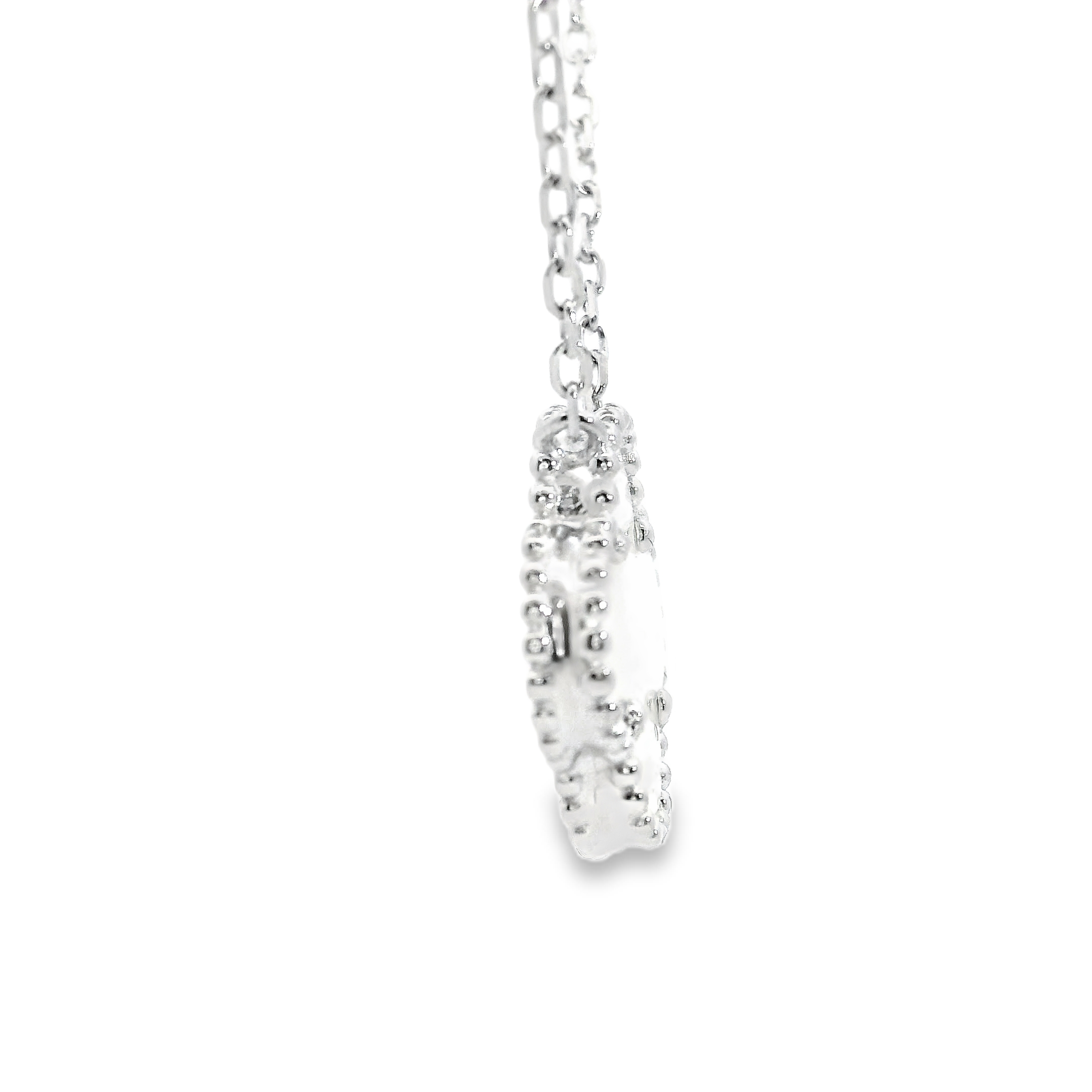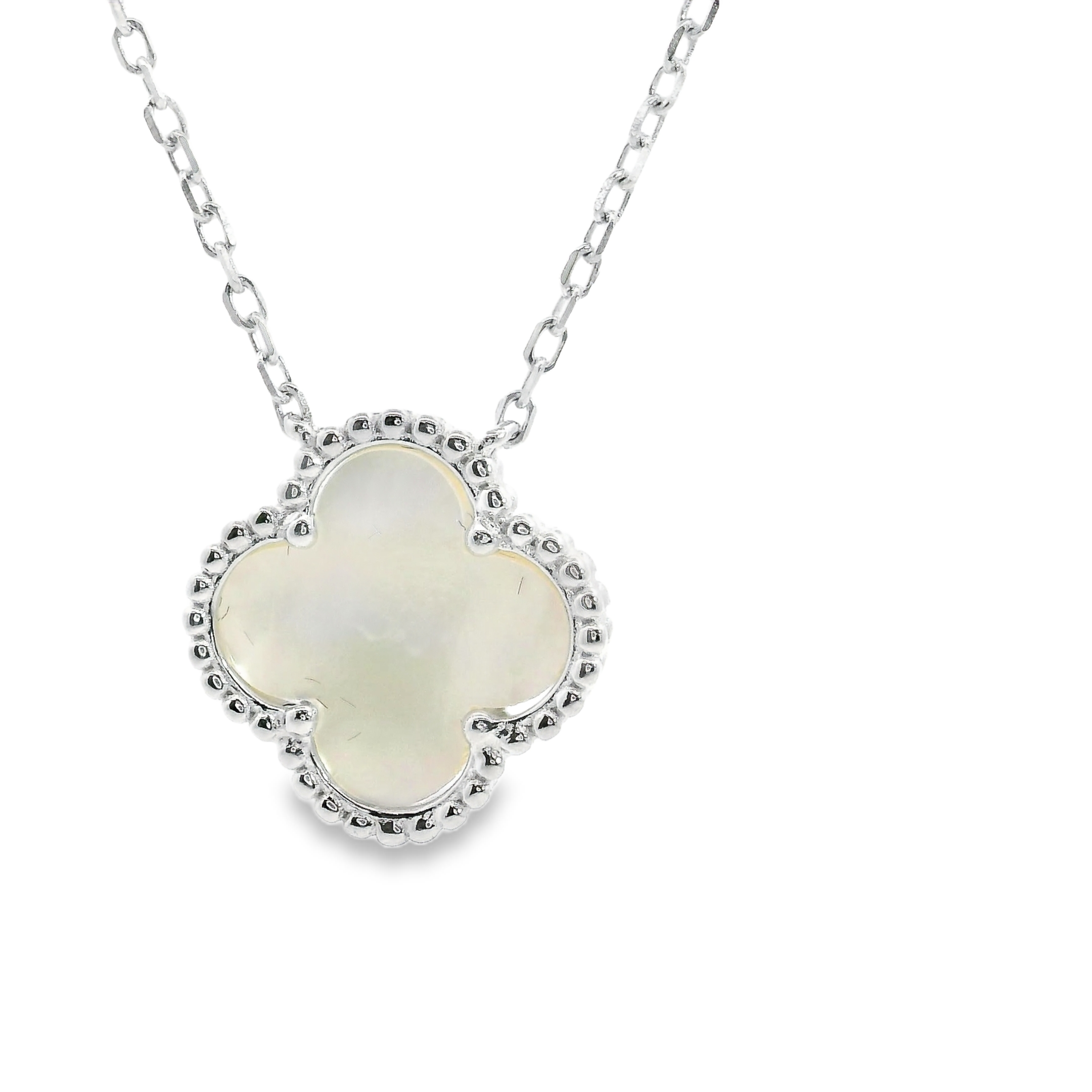 This gorgeous necklace is a sterling silver necklace with clover shaped center in a mother of pearl cutout. The bezel around the stone has beaded details. It is set on a chain that is adjustable from 16-18" in length.