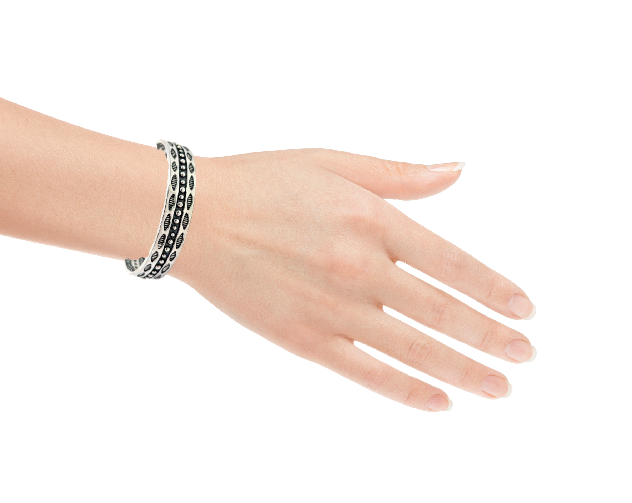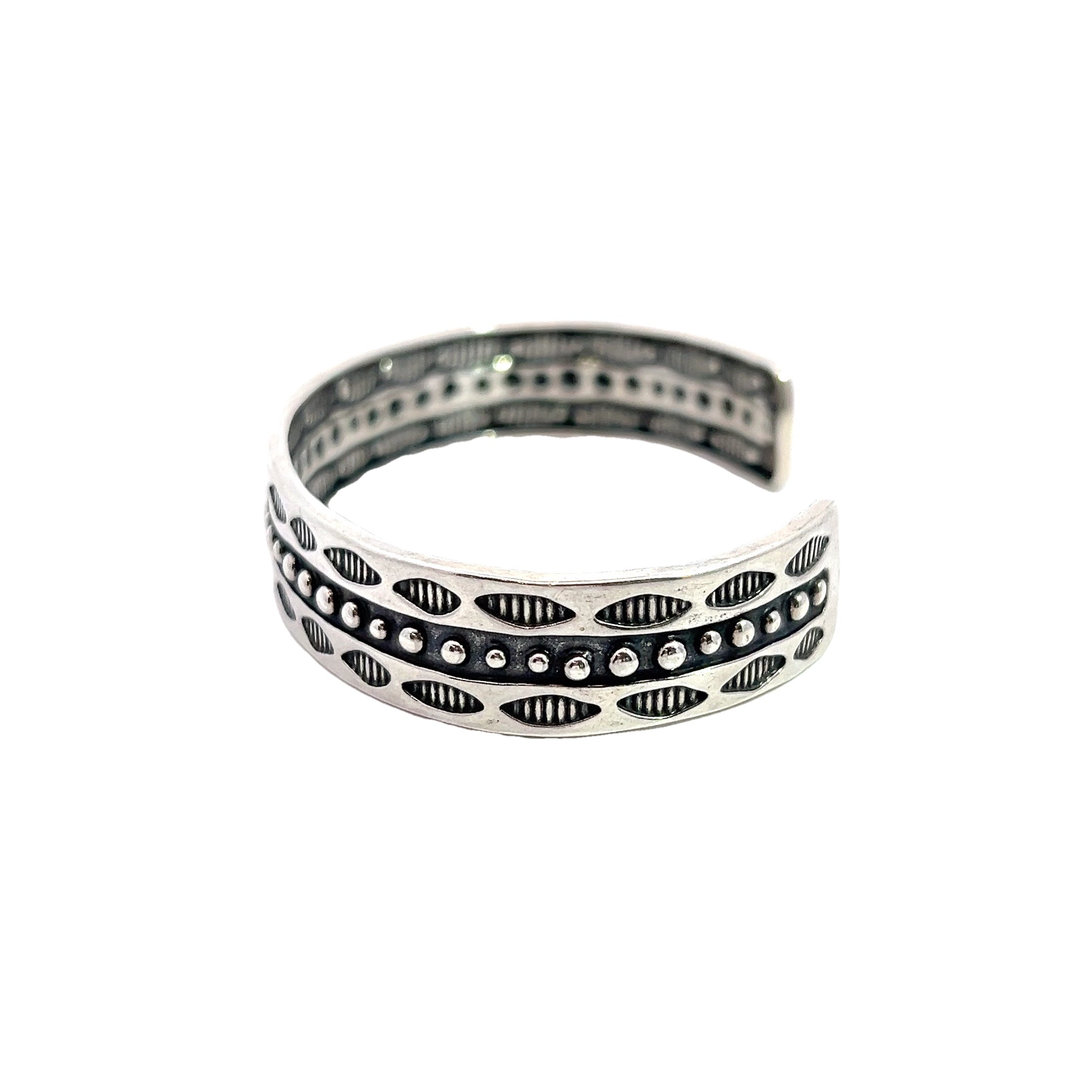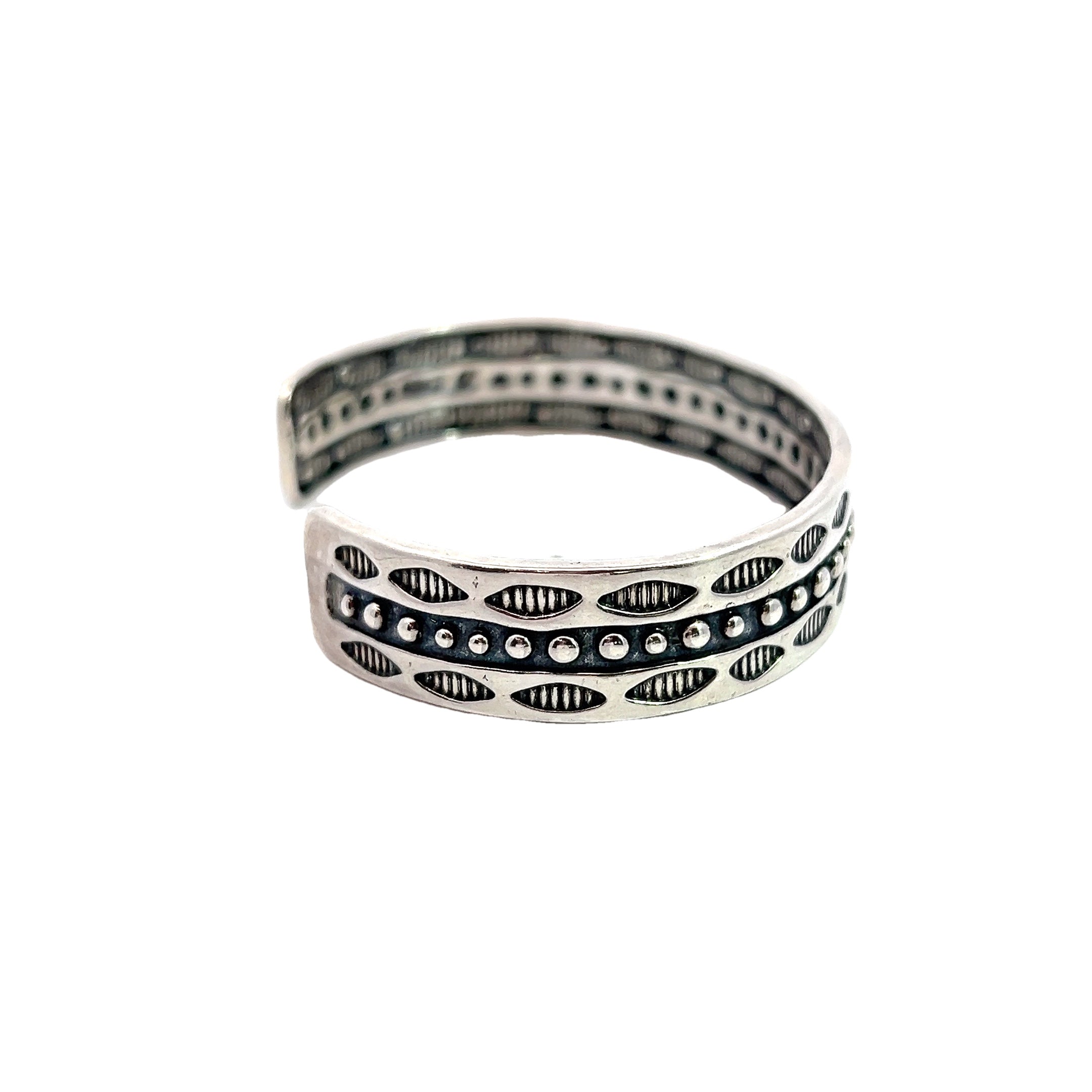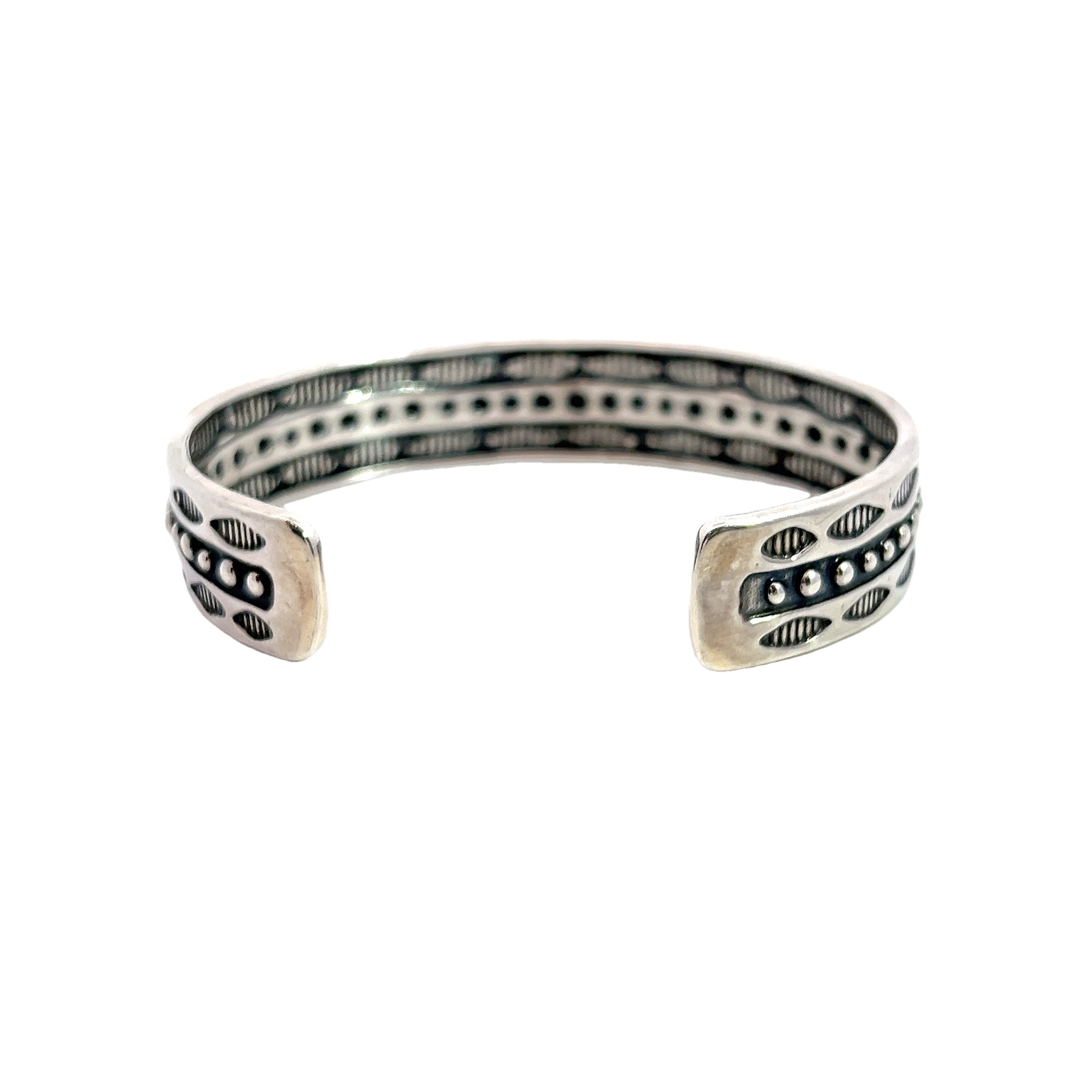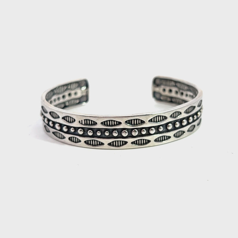 This sterling silver cuff bracelet is a sterling silver cuff that it about 0.5" wide with a native american style design across the top.