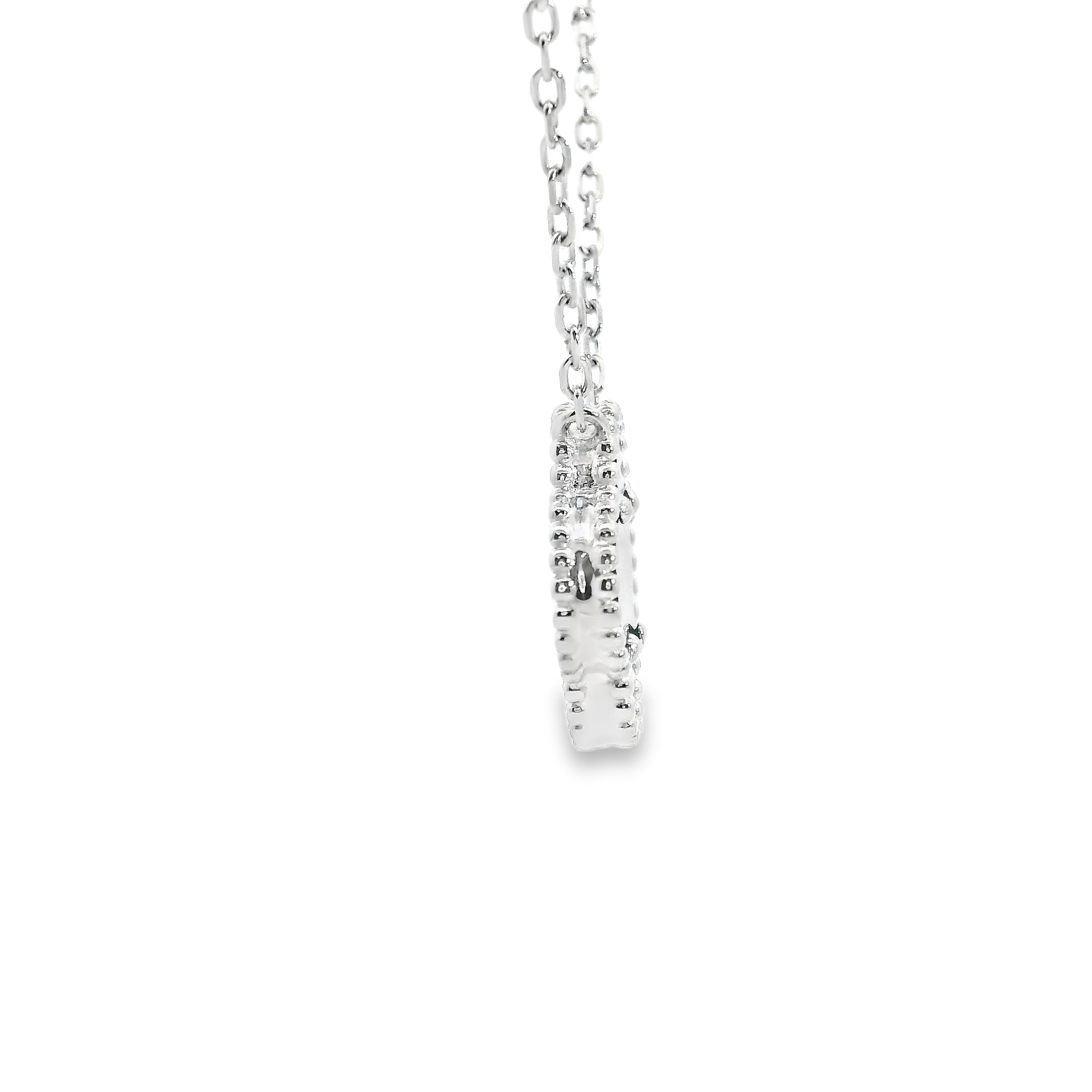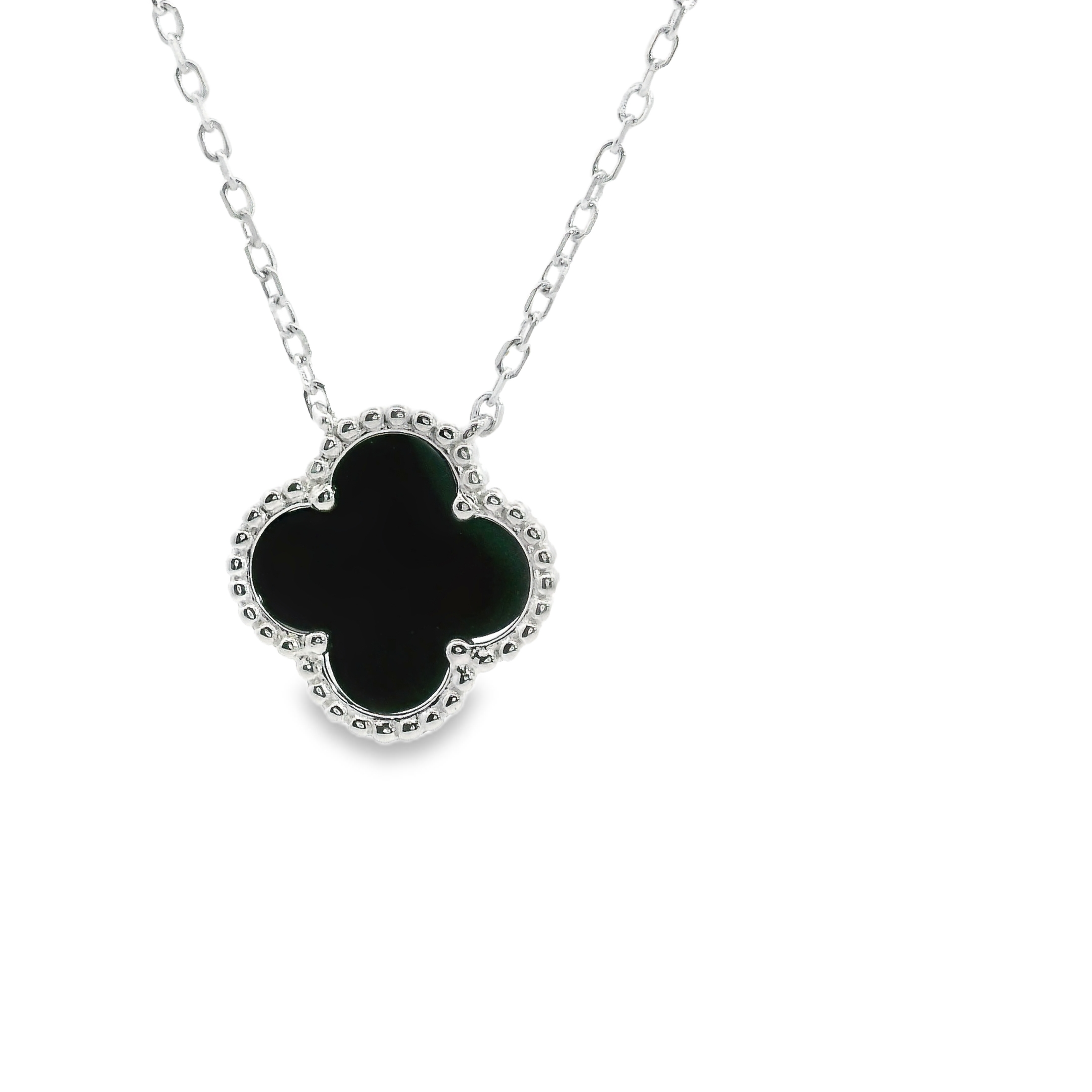 This gorgeous necklace is a sterling silver necklace with clover shaped center in an onyx cutout. The bezel around the stone has beaded details. It is set on a chain that is adjustable from 16-18" in length.