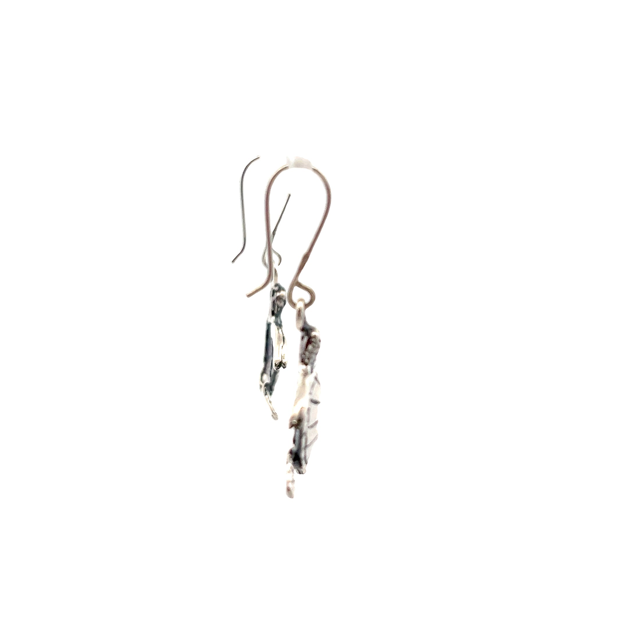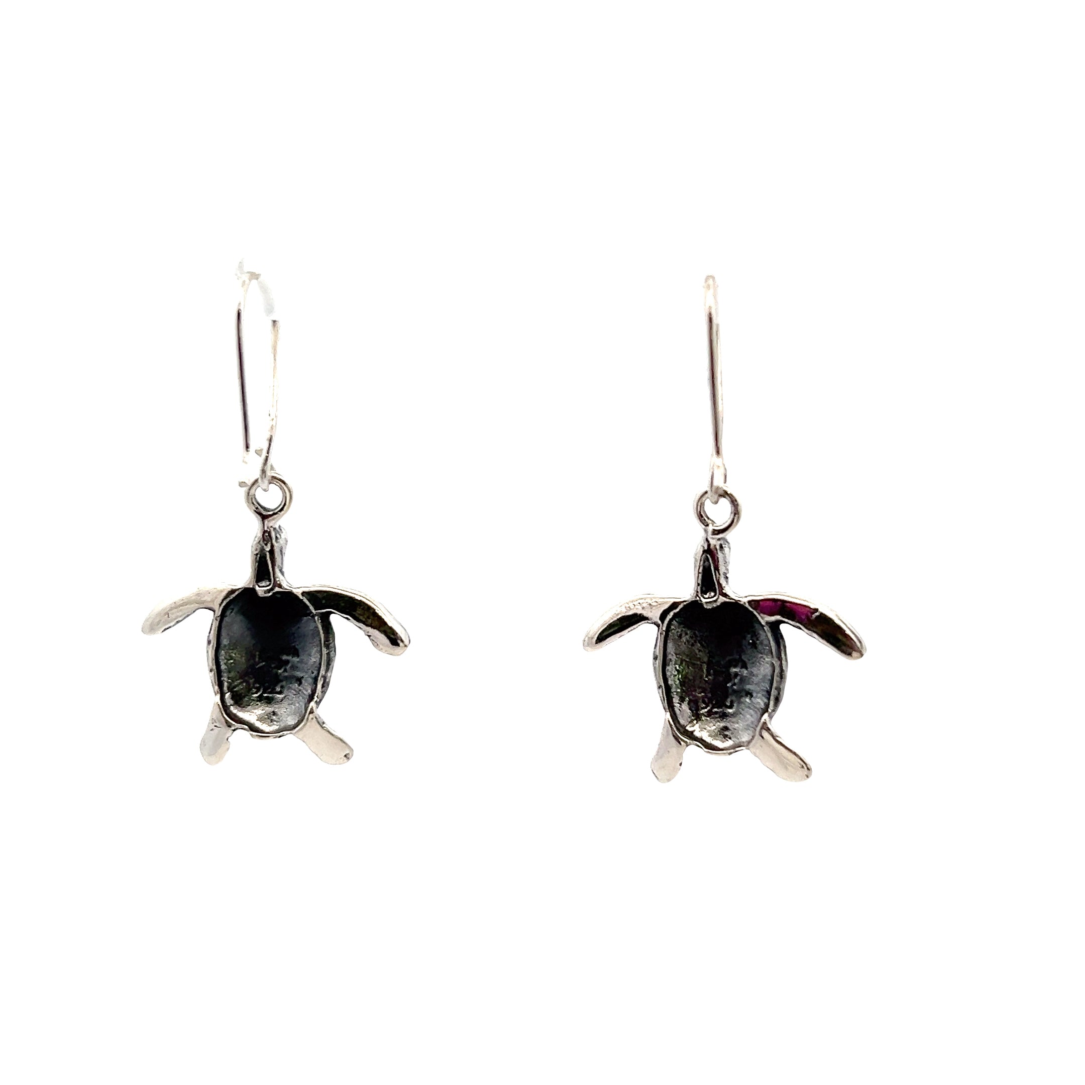 These sterling silver earrings have silver cast sear turtles hanging from the fish hook style levers with antiquing detailing.